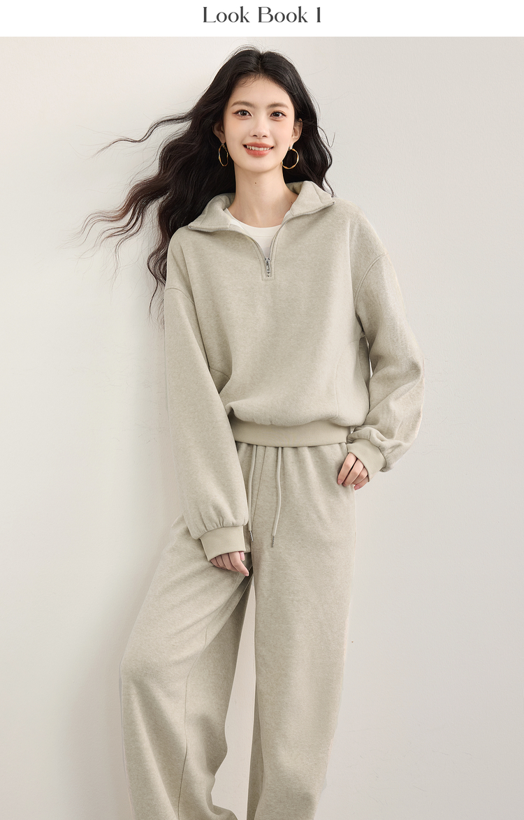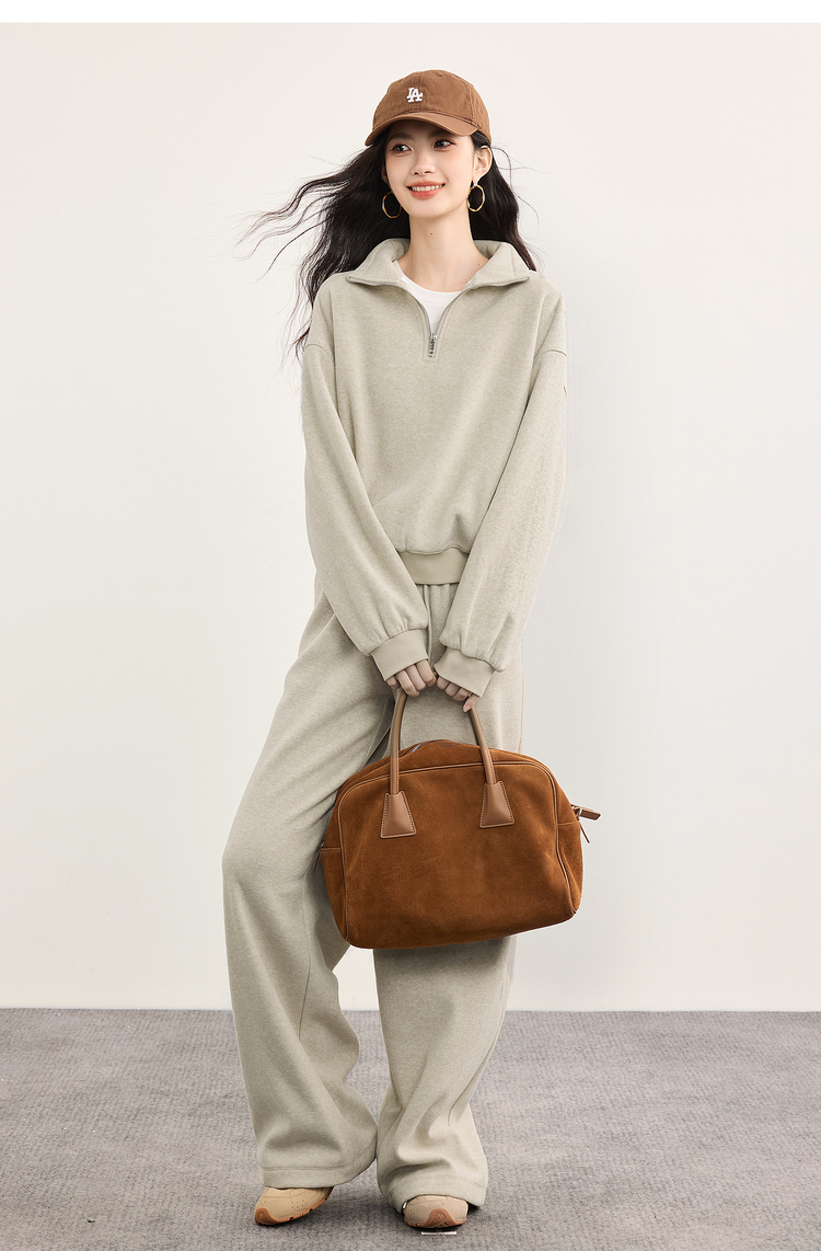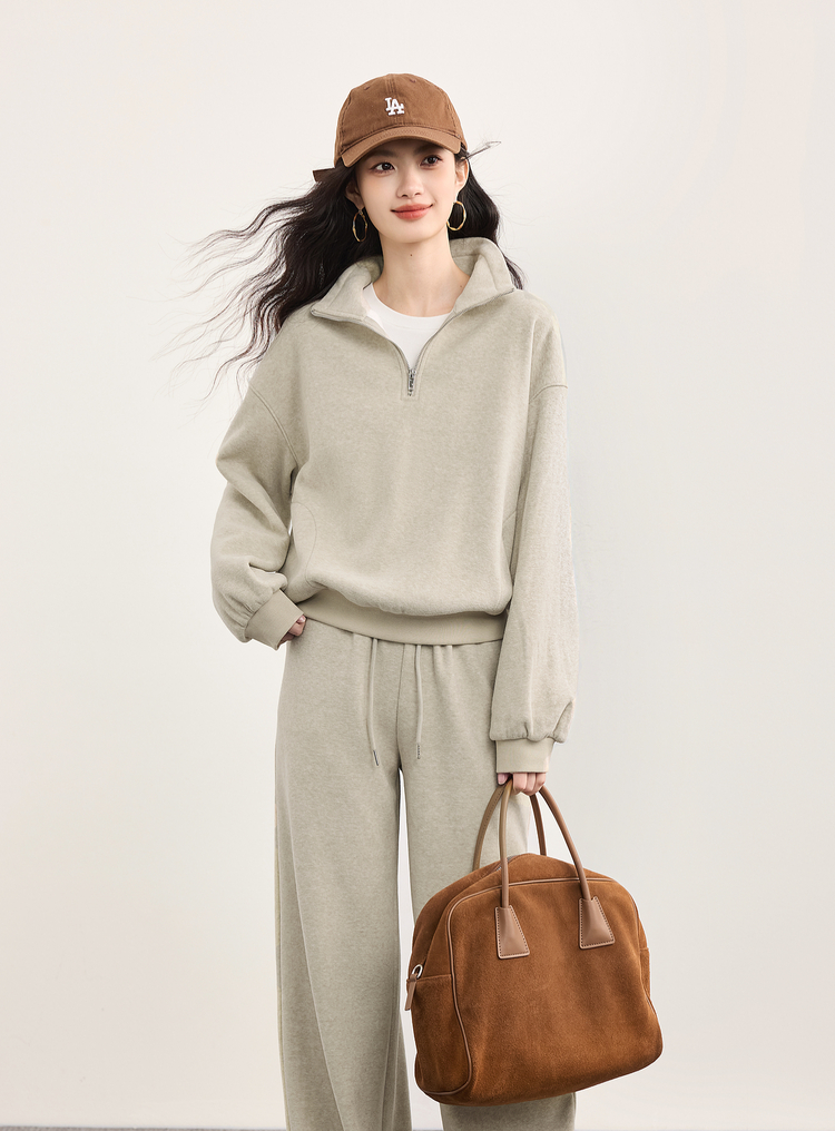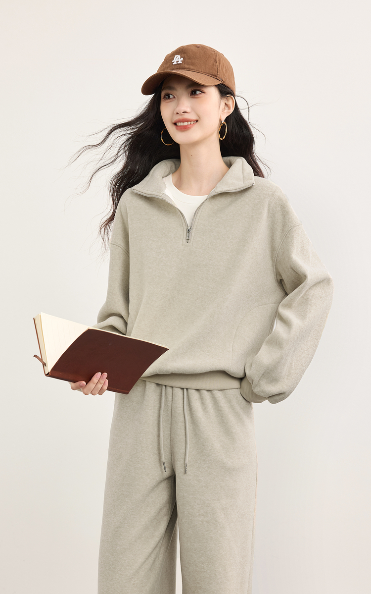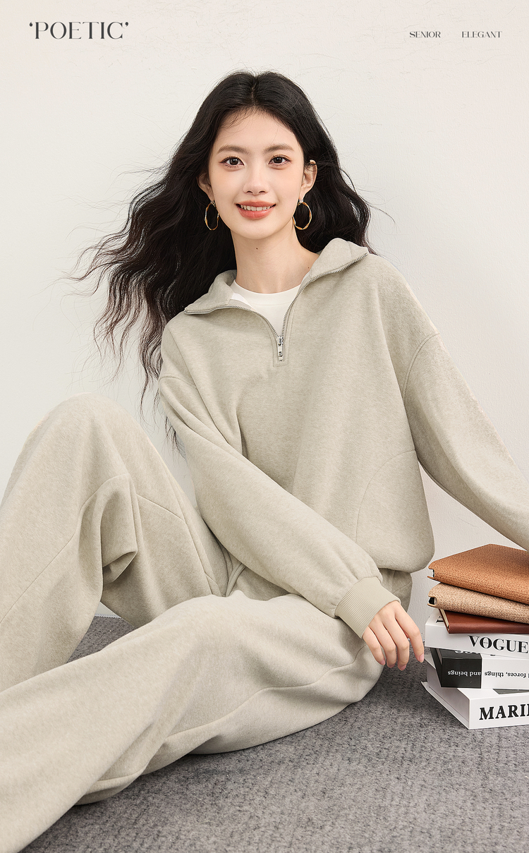 【10/1新品】熙世界休闲运动保暖卫衣套装秋冬女装时尚半拉链上衣阔腿裤两件套