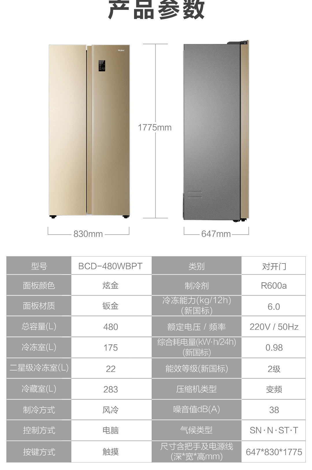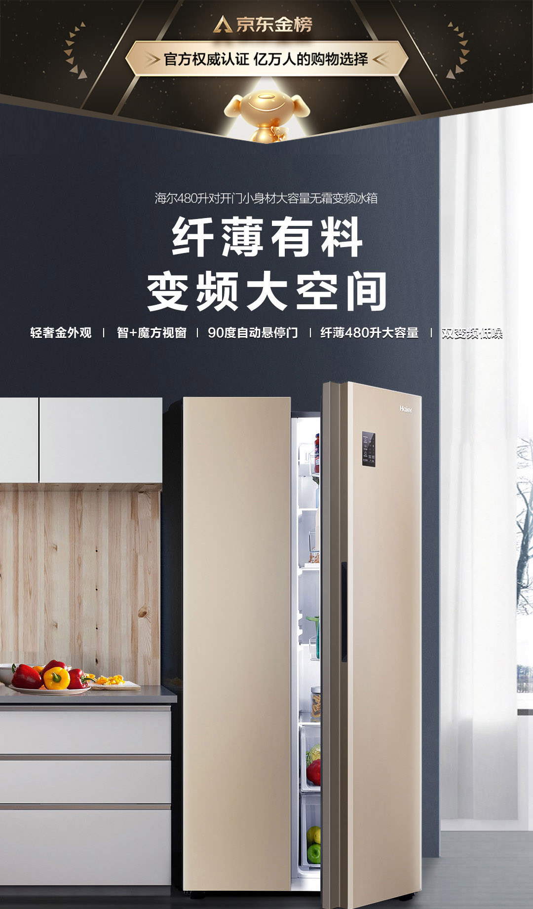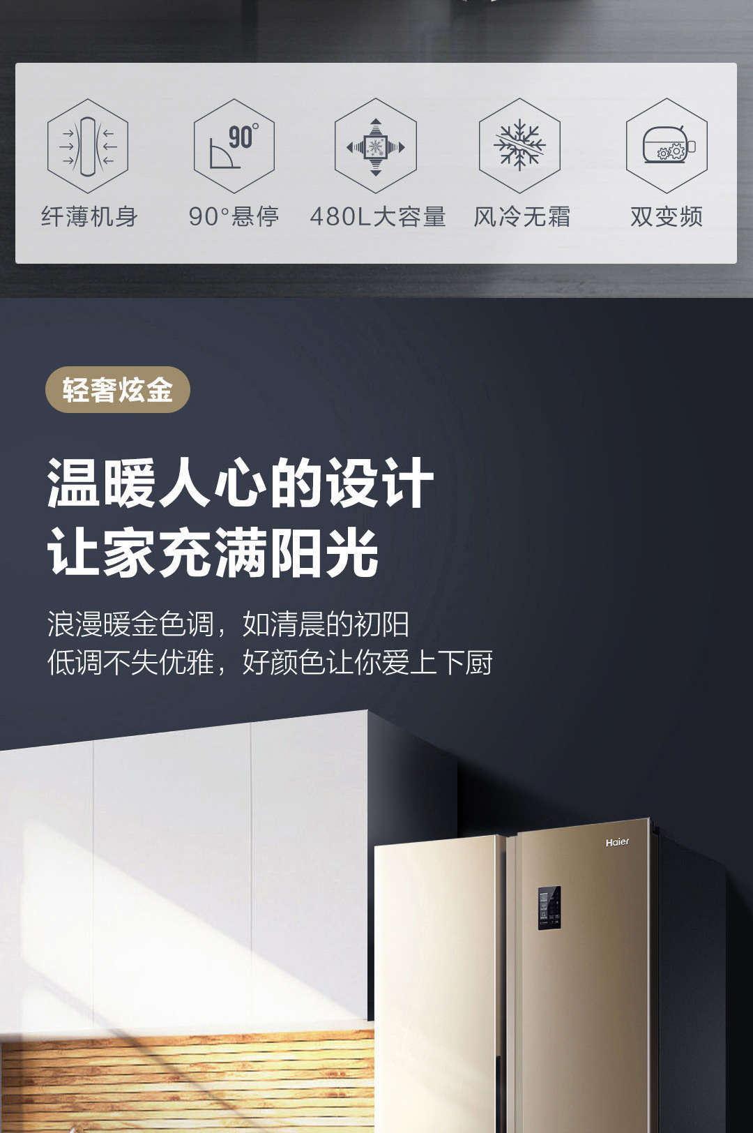 【下单前请先与客服联系】海尔 (Haier )480升风冷无霜变频智能对开门双门冰箱90°悬停门双变频金色BCD-480WBPT