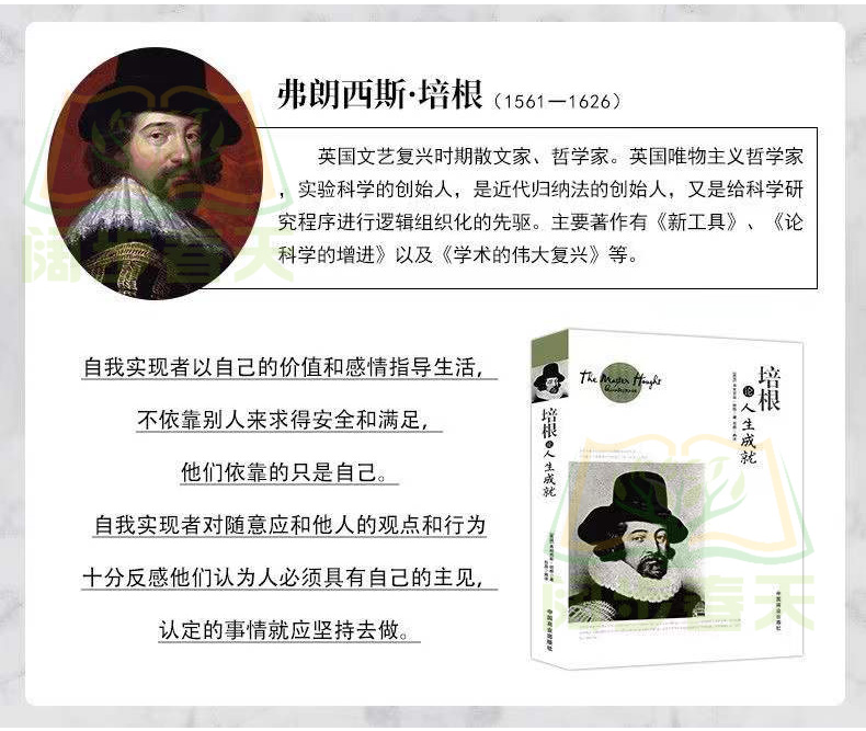 《培根谈人生成就》没有友谊,则世上不过是一片荒野。顺境时的美德是节制,逆境时的美德足坚忍,而后一种是更为伟大的美德。书籍是在时代的波涛中航行的思想之船,它小心翼翼地把珍贵的货物运送给一代又一代。是墙根一生的智慧经典,不仅涵盖了人类最具智慧的语言,同时也是人们立身处世的准则;四百年来伴随这些经典智慧而终身受益的人实在小计其数,在人类各种文字中几乎均有译本,为各闻人们所推崇。《培根谈人生成就》足一部经世思想瑰宝,是培根对人类文化的奉献和恩典。