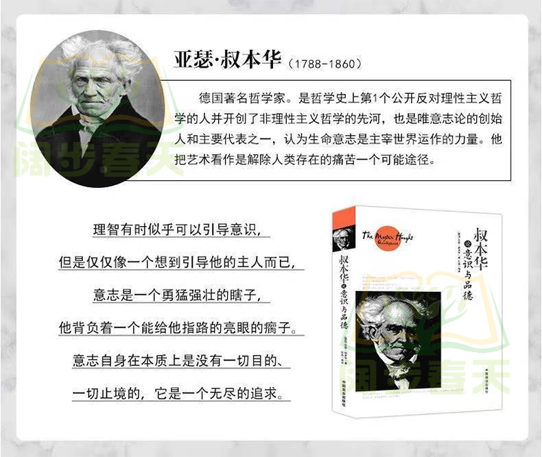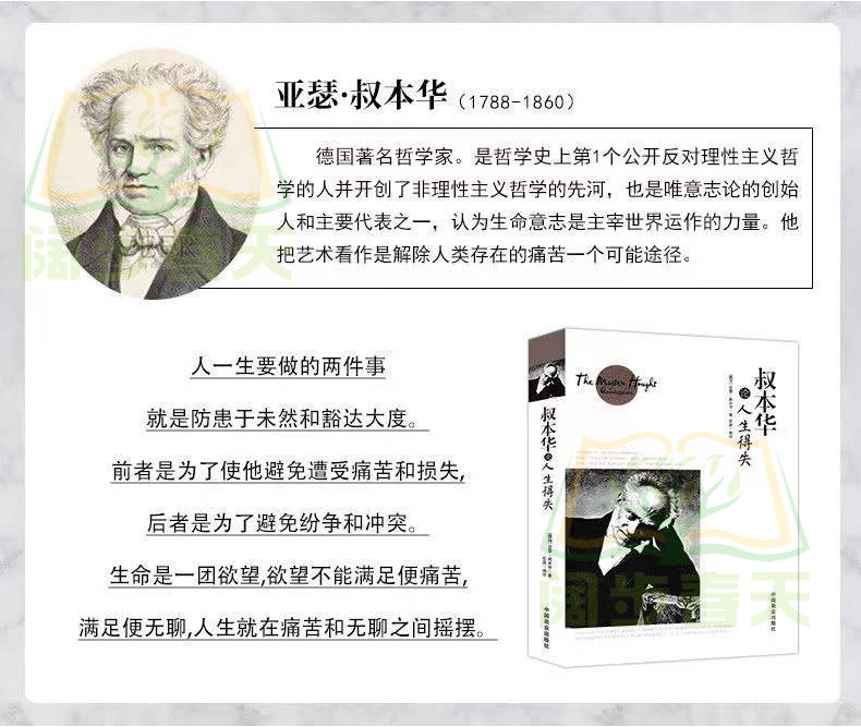《叔本华谈人生得失》人一生要做的两件事就是防患于未然和豁达大度。前者是为了使他避免遭受痛苦和损失,后者是为了避免纷争和冲突。生命是一团欲望,欲望不能满足便痛苦,满足便无聊,人生就在痛苦和无聊之间摇摆。欲望是人的痛苦根源,因为欲望永不能被满足。我们离理想越远,自然就会离欲望越近。在现实生活中,我们常常迷失在理想与欲望之中,将欲望的东西当作理想,这是因为它们有时实在太近,近刮只有一线之隔,或者说欲望是感性的,而理想是理性的。