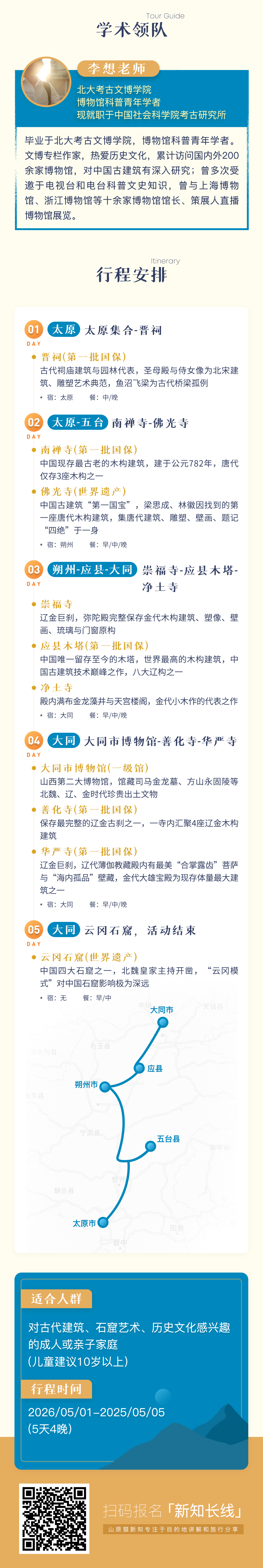 【重走梁林路·山西古建营造之旅】作为山原猫经典线路,精选10处古建筑遗迹,一路漫行晋北。我们在晋祠感受宋式建筑美学的萌芽;走访辽金时代的善化寺和华严寺、应县木塔、朔州崇福寺,中国现存最早唐代木构五台南禅寺,梁思成林徽因先生的重大发现世界遗产五台佛光寺;在大同博物馆梳理大同的高光时刻——北魏与辽金;实地体会理解云冈石窟艺术中的“云冈模式”。