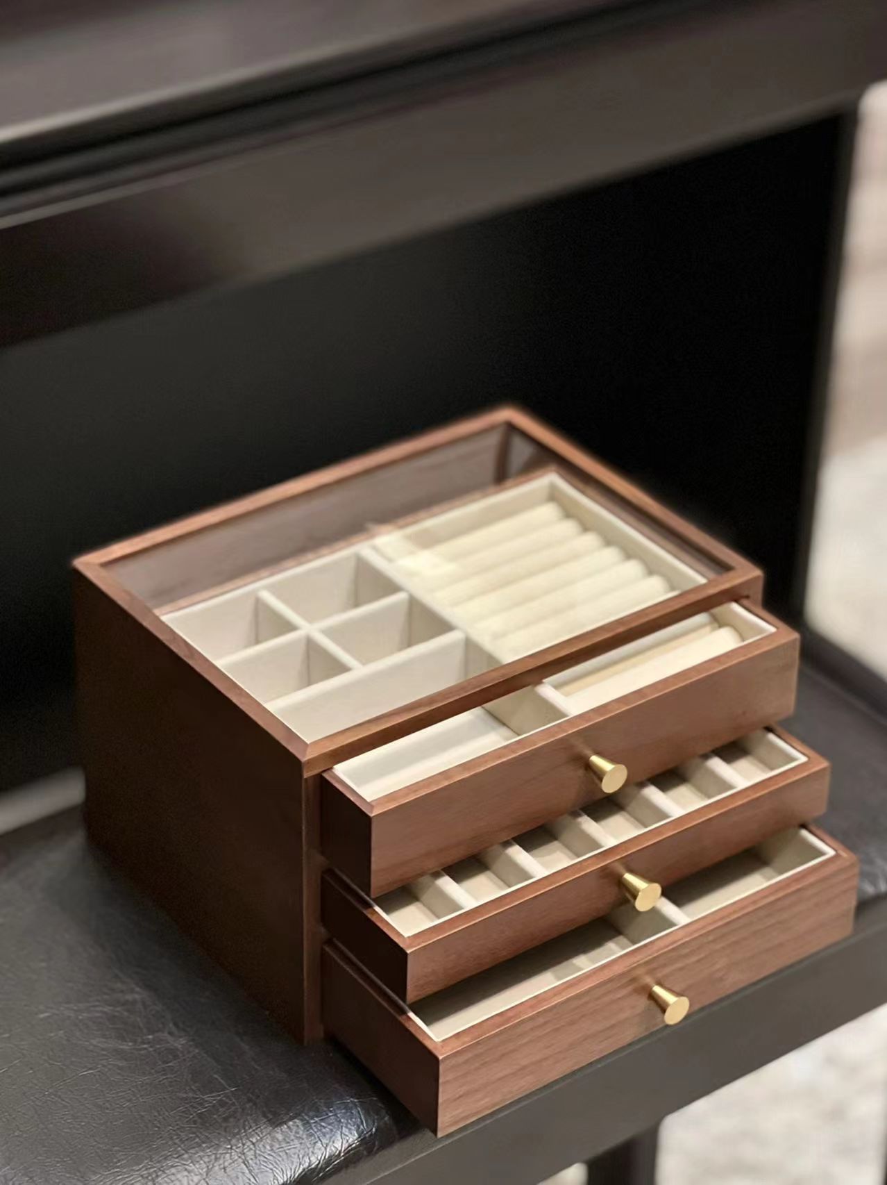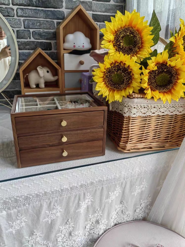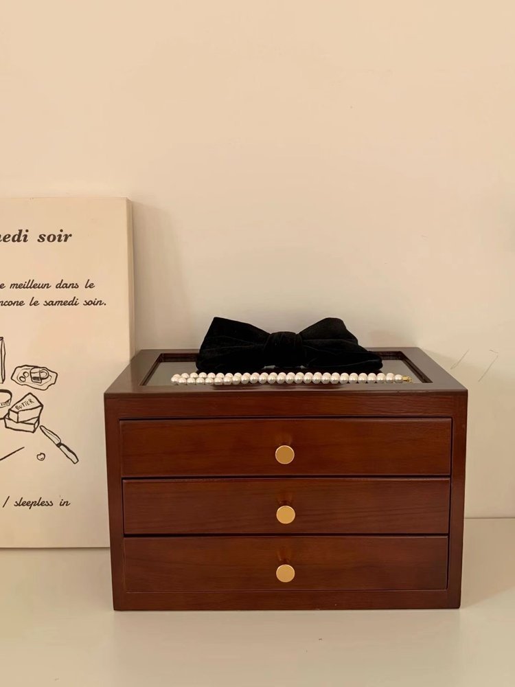 三层首饰盒:纯实木(桐木+黄铜+玻璃窗)
