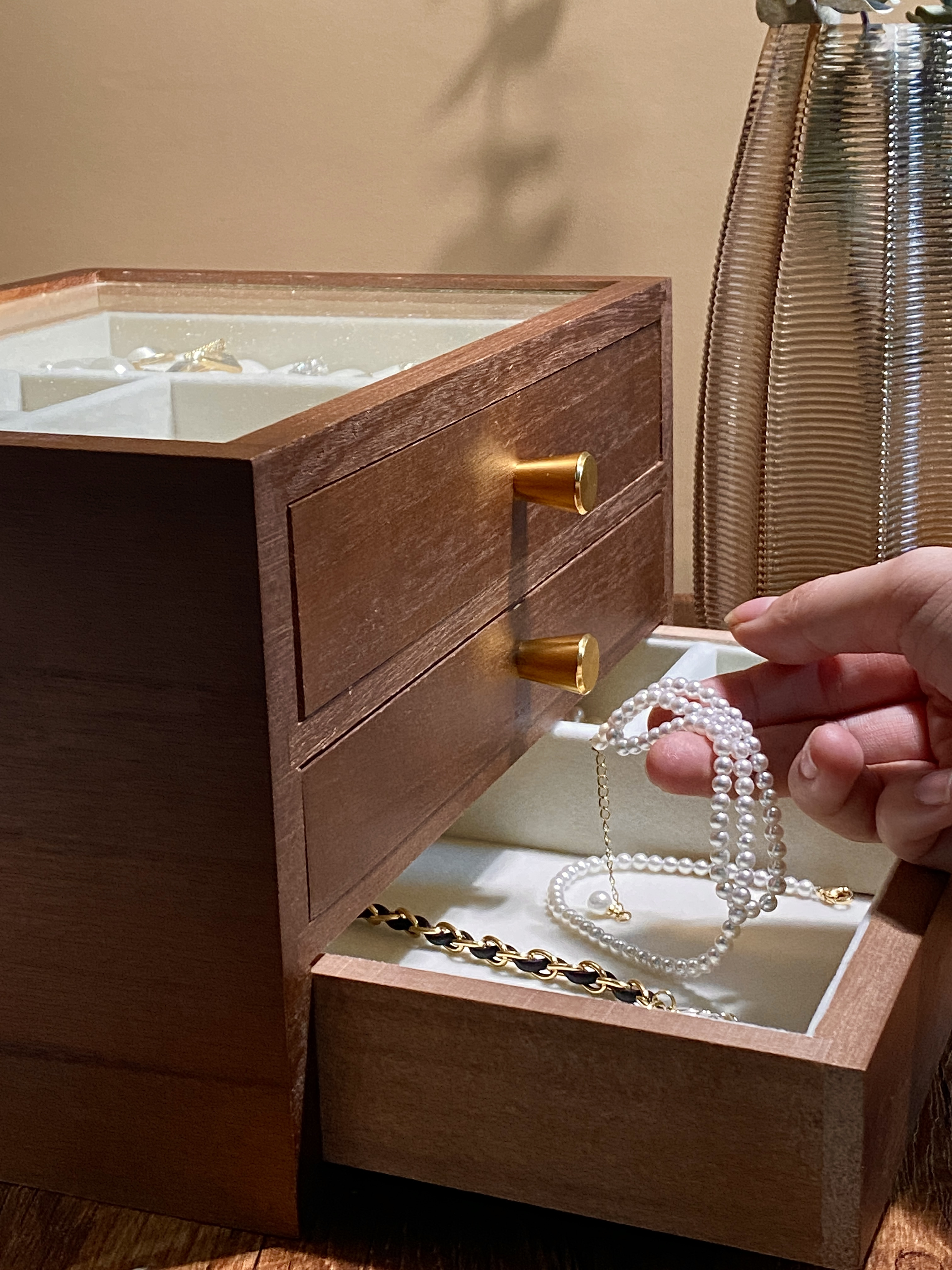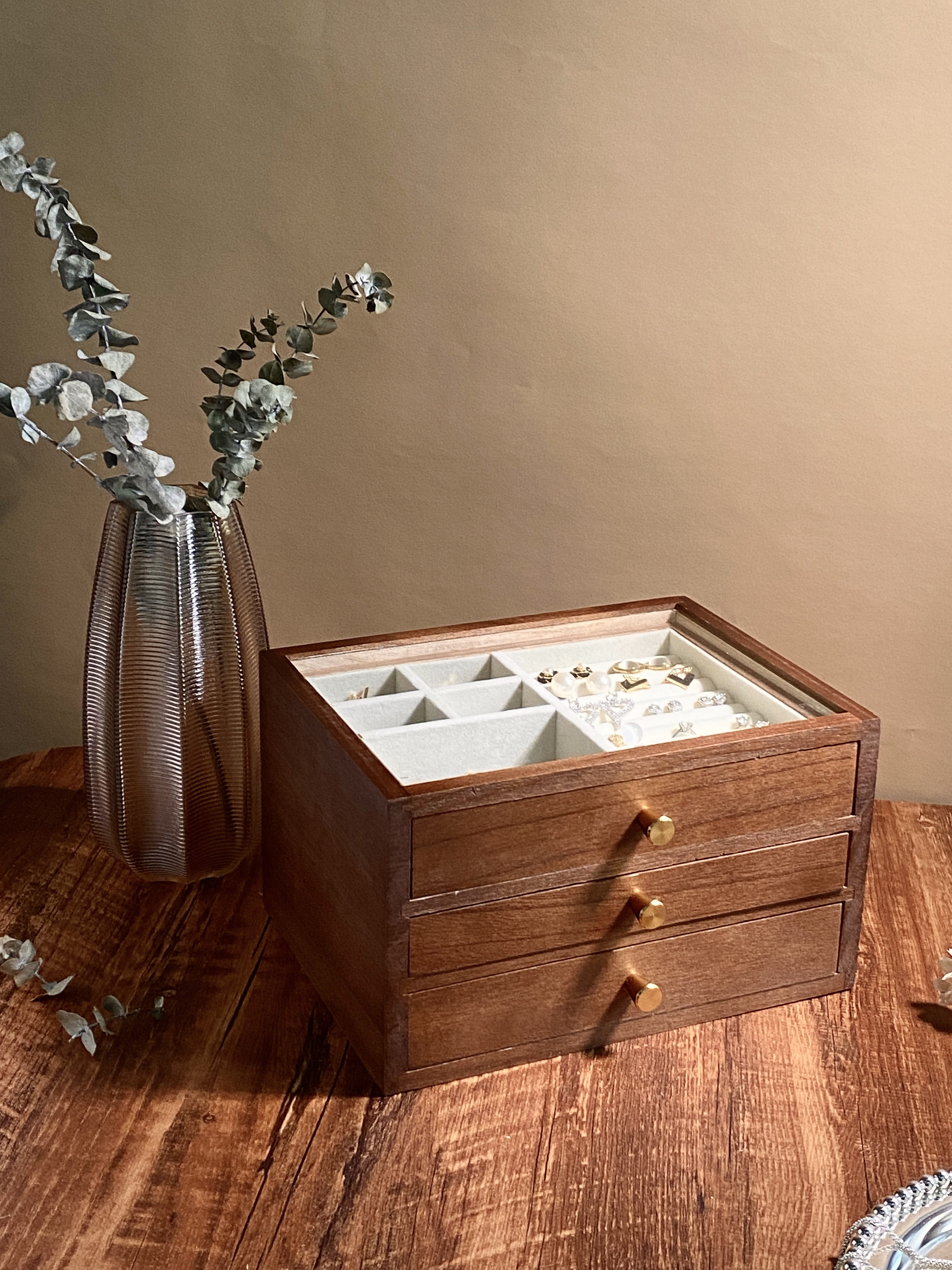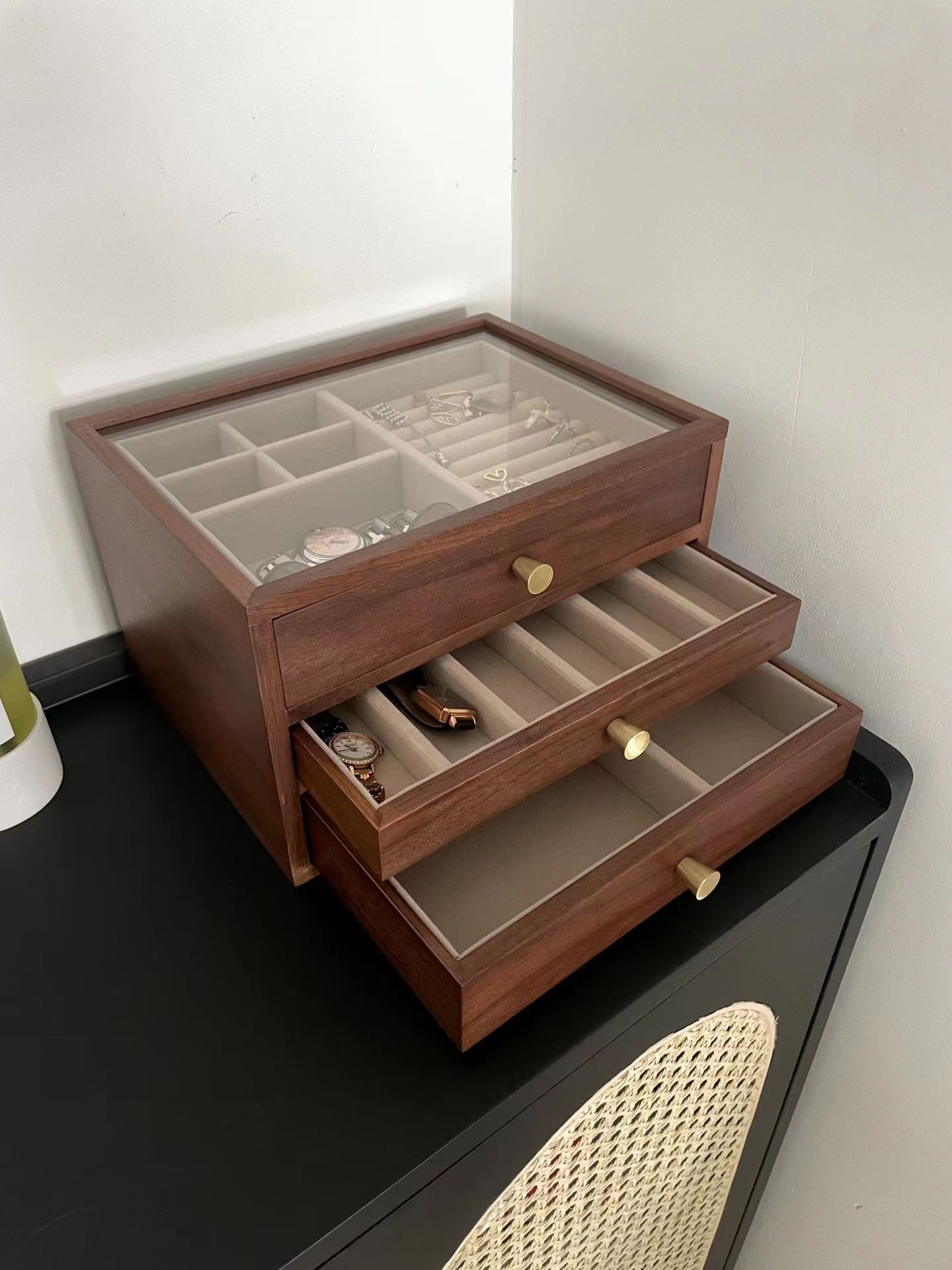 三层首饰盒:纯实木(桐木+黄铜+玻璃窗)