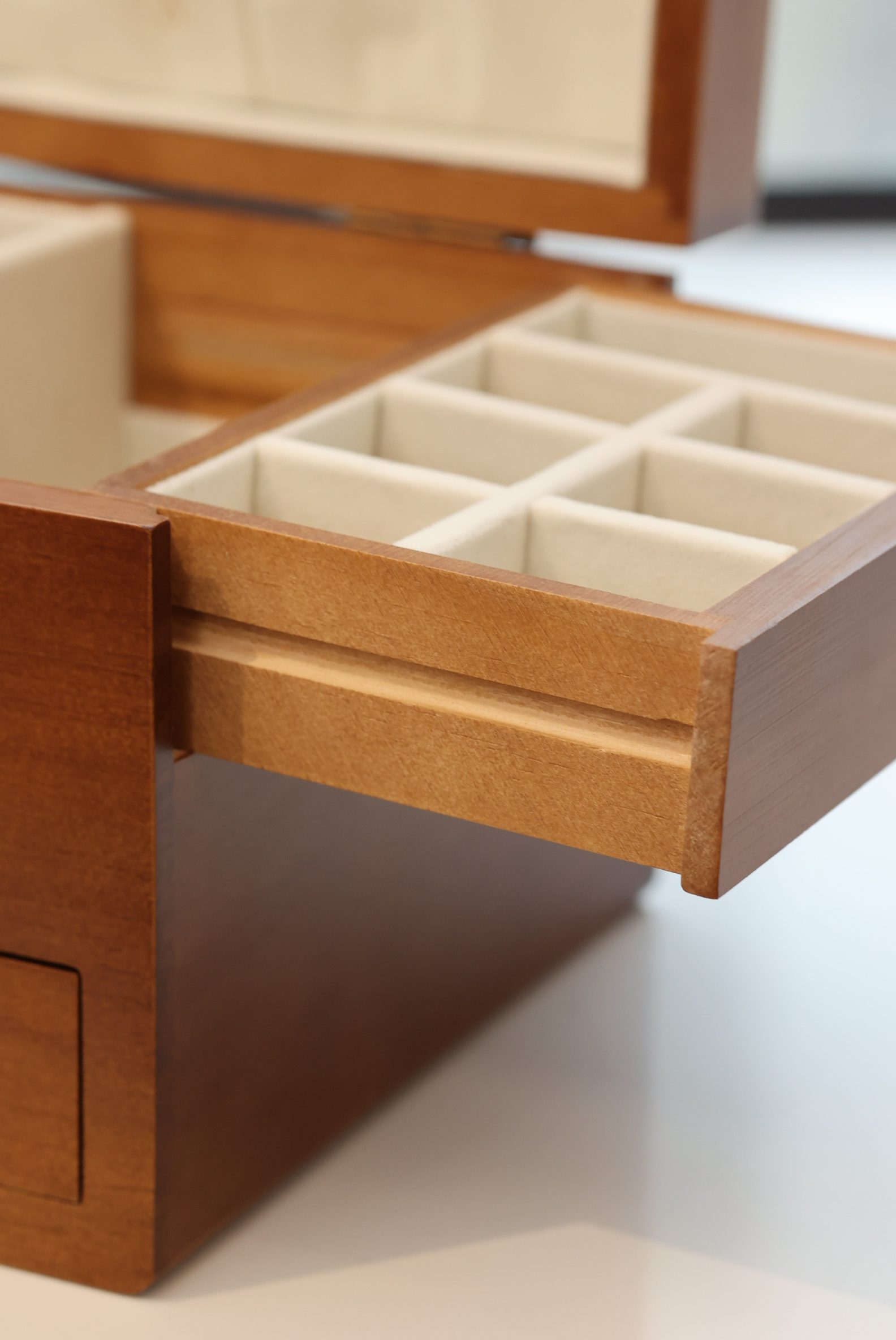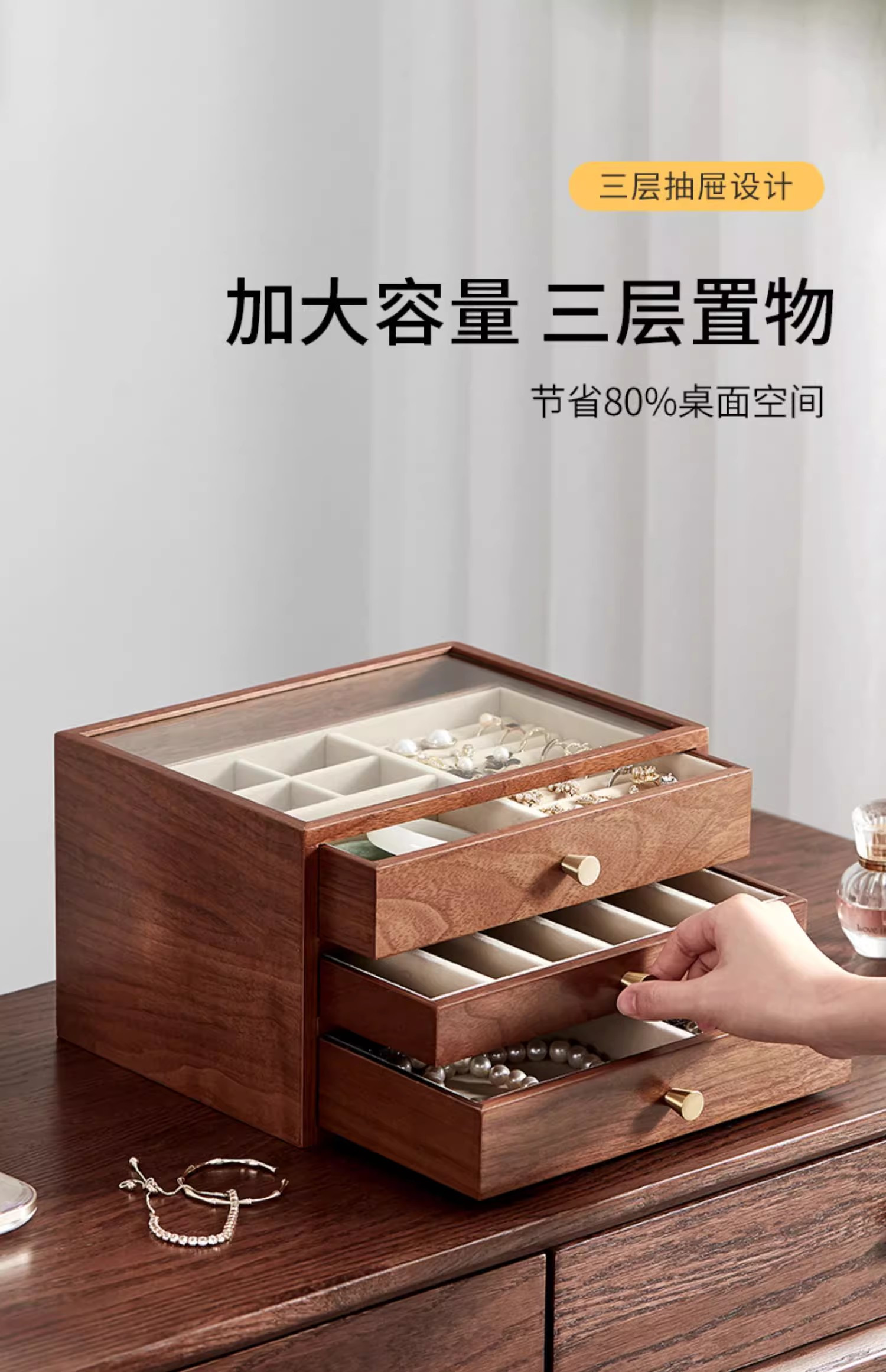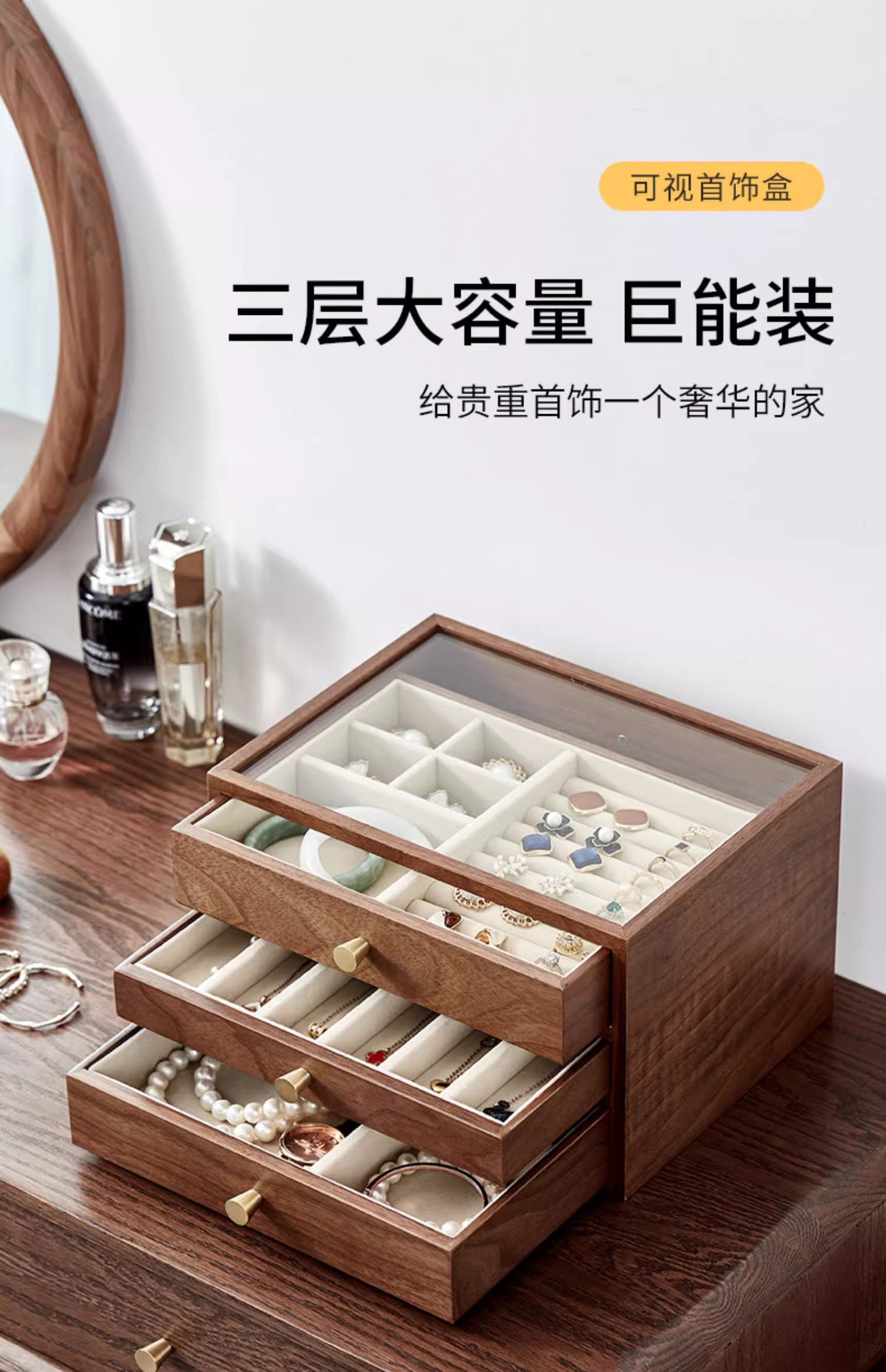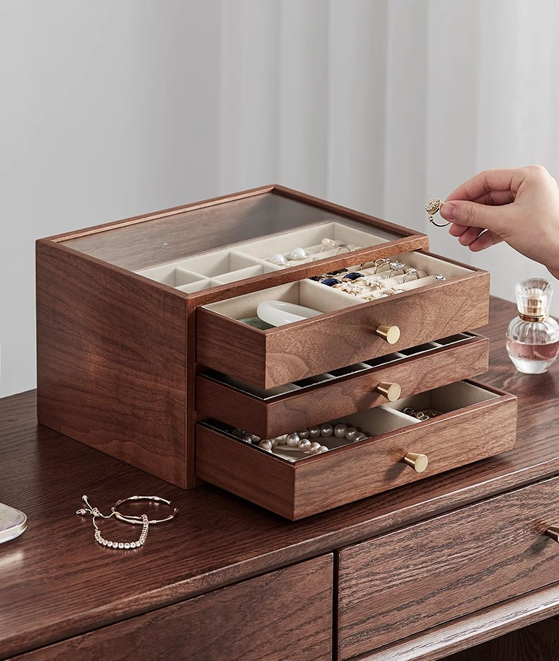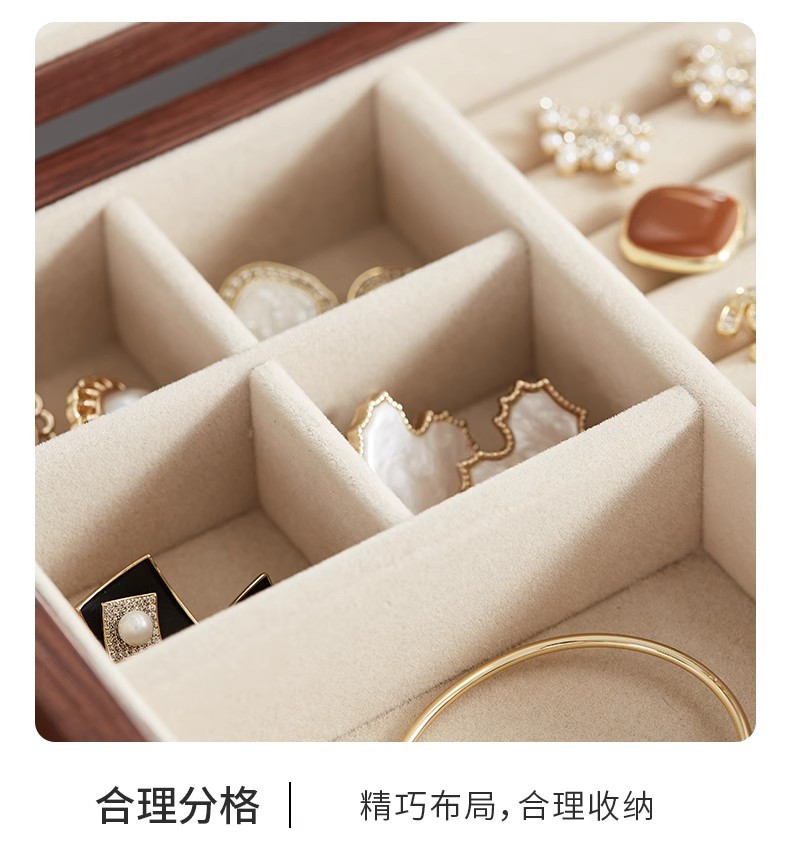 【实木居家绒布款三层首饰收纳盒】