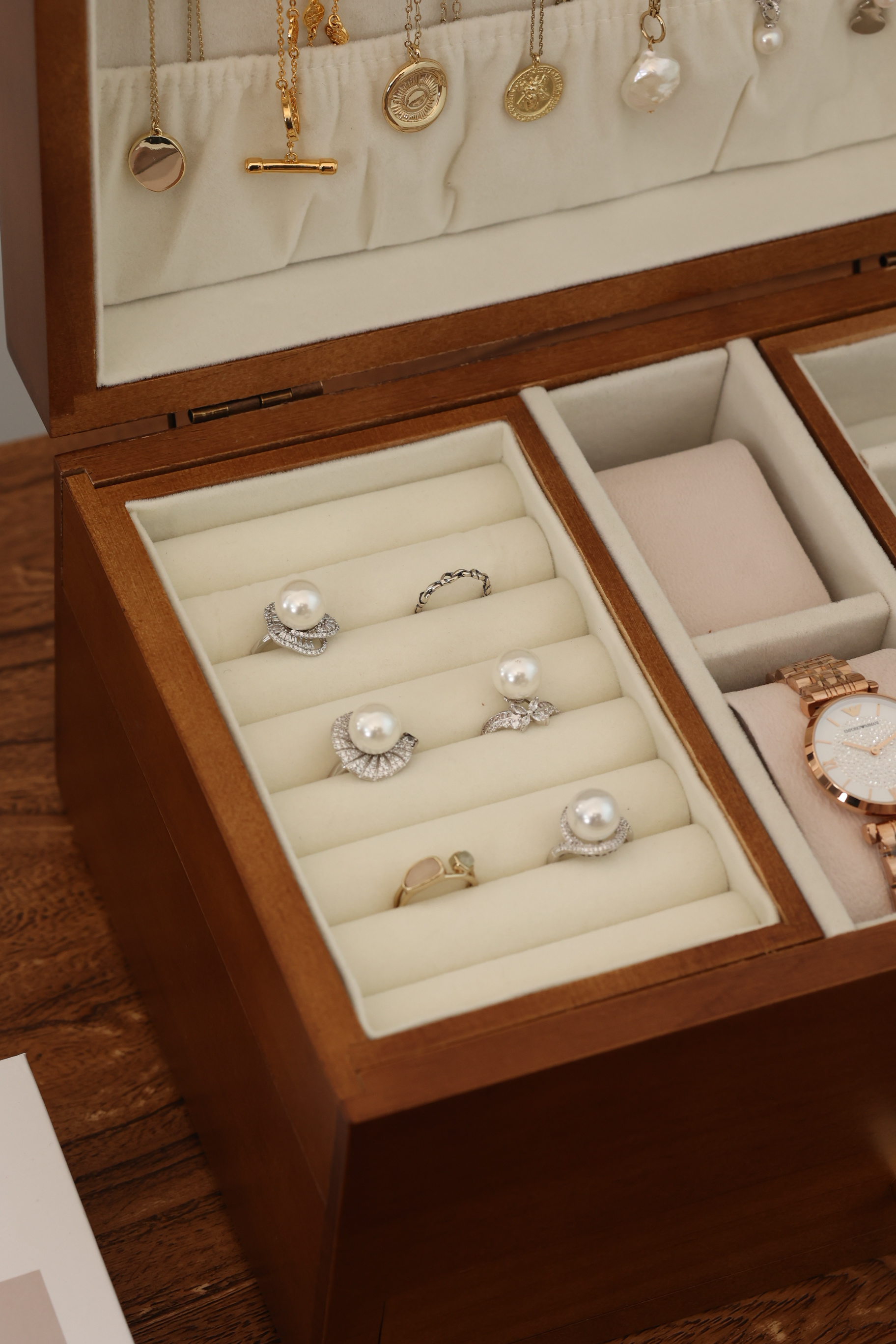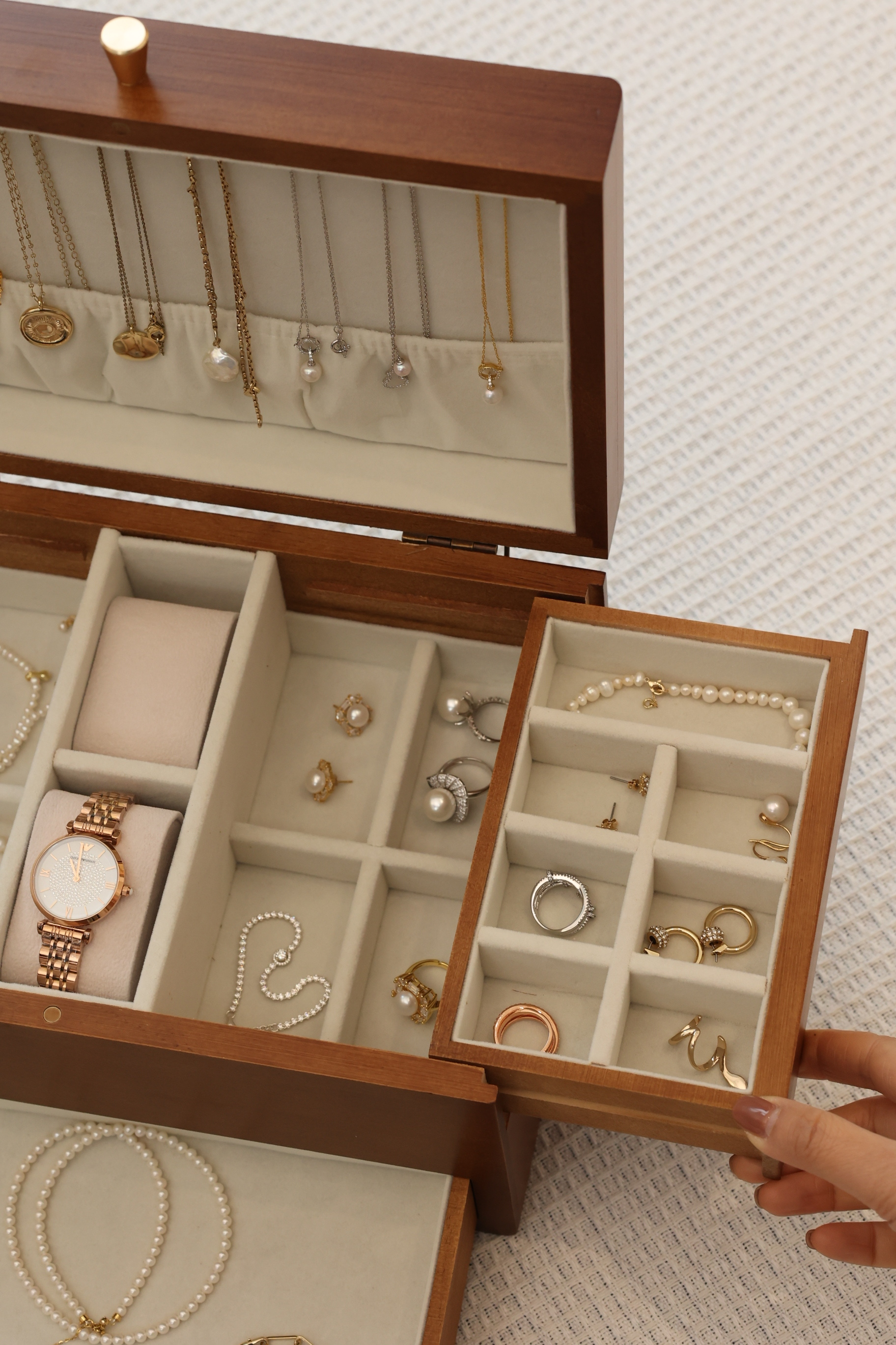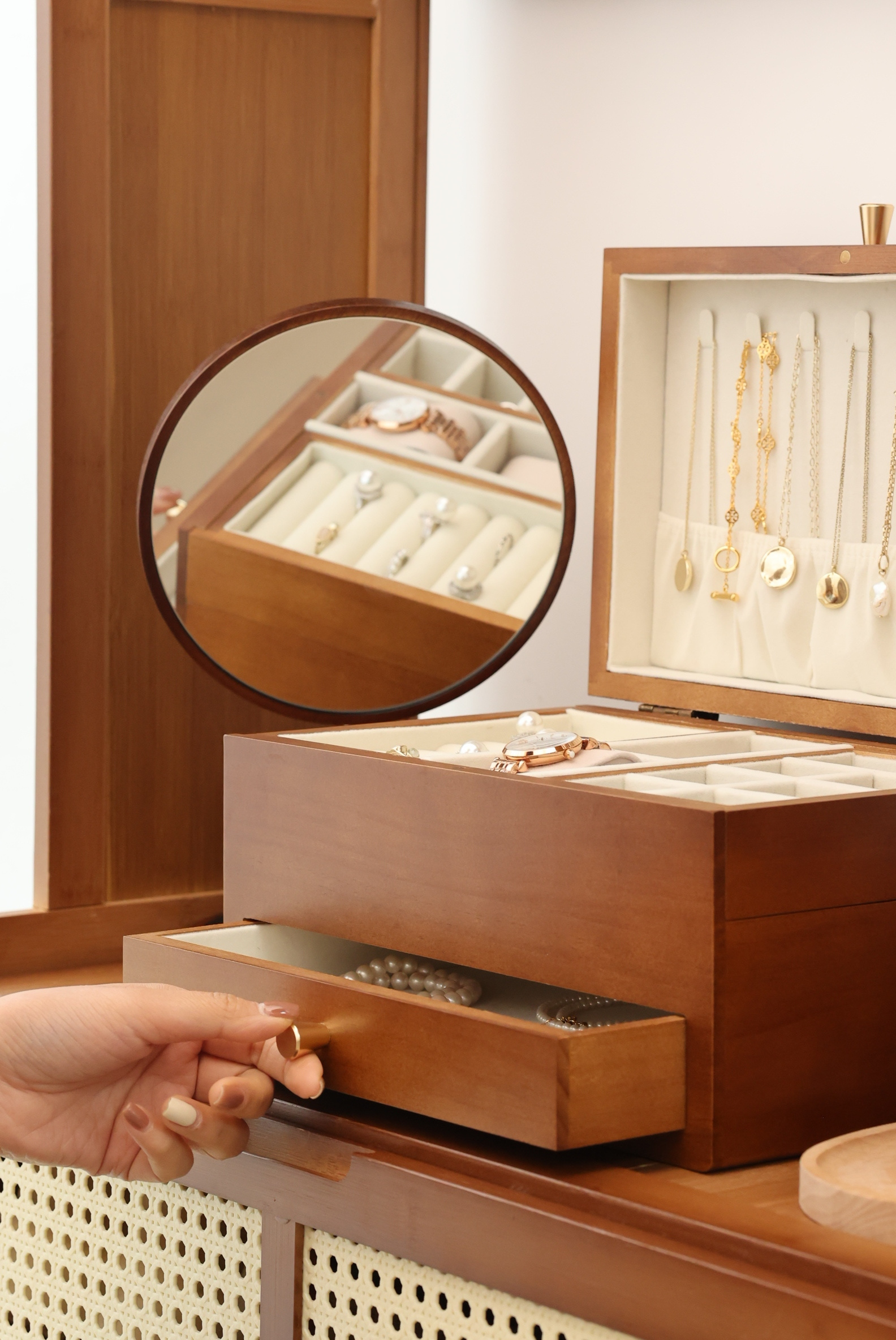 【大大大降价!!!】【木质首饰盒】每个女孩子的💍宝藏箱⚪️将首饰💍的记忆完好保存【实木居家绒布款三层首饰收纳盒】【双开门实木首饰盒】集中收纳在首饰盒里,再也不怕打结弄丢了!0417