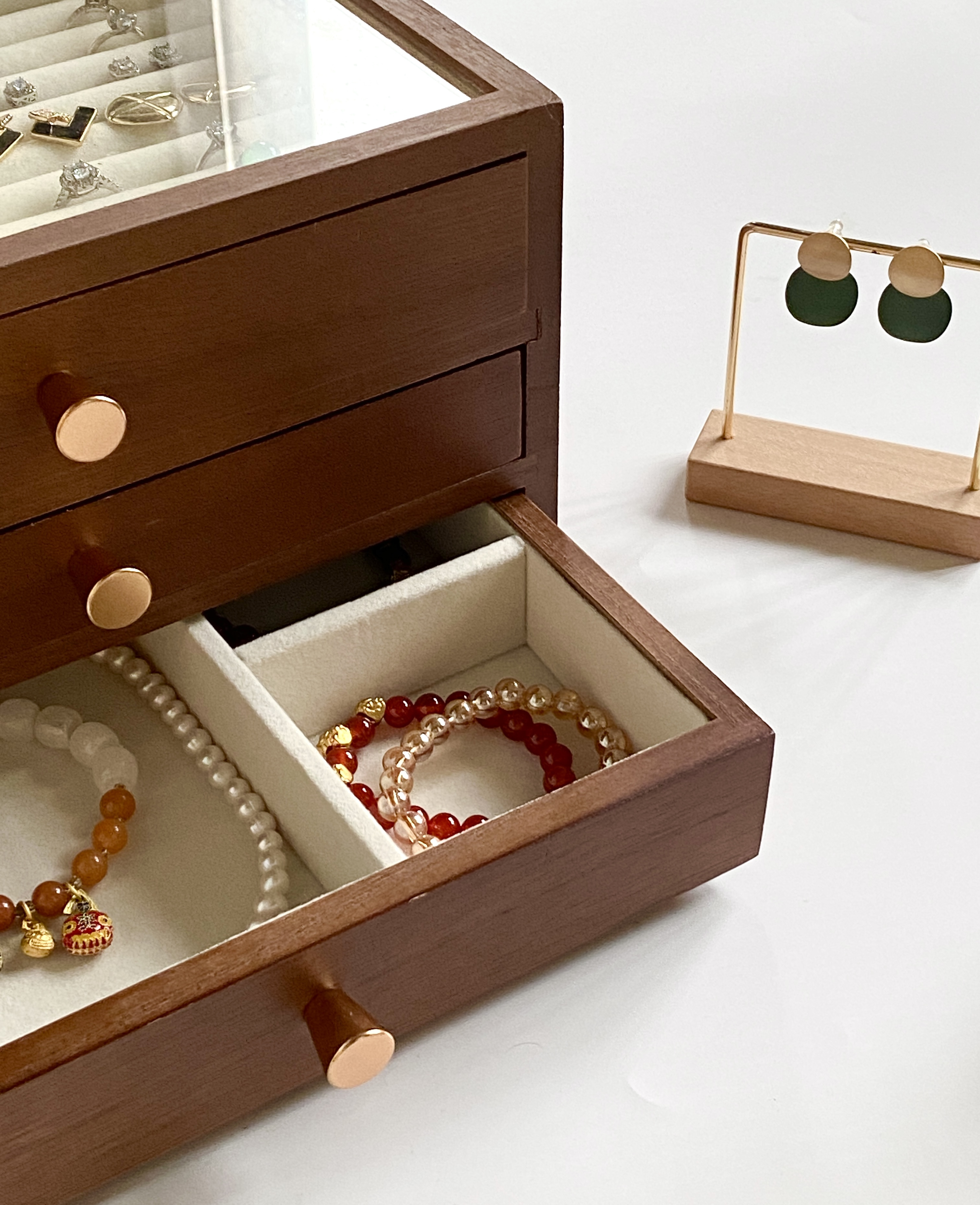第一层你可以用它来放耳环耳钉戒指