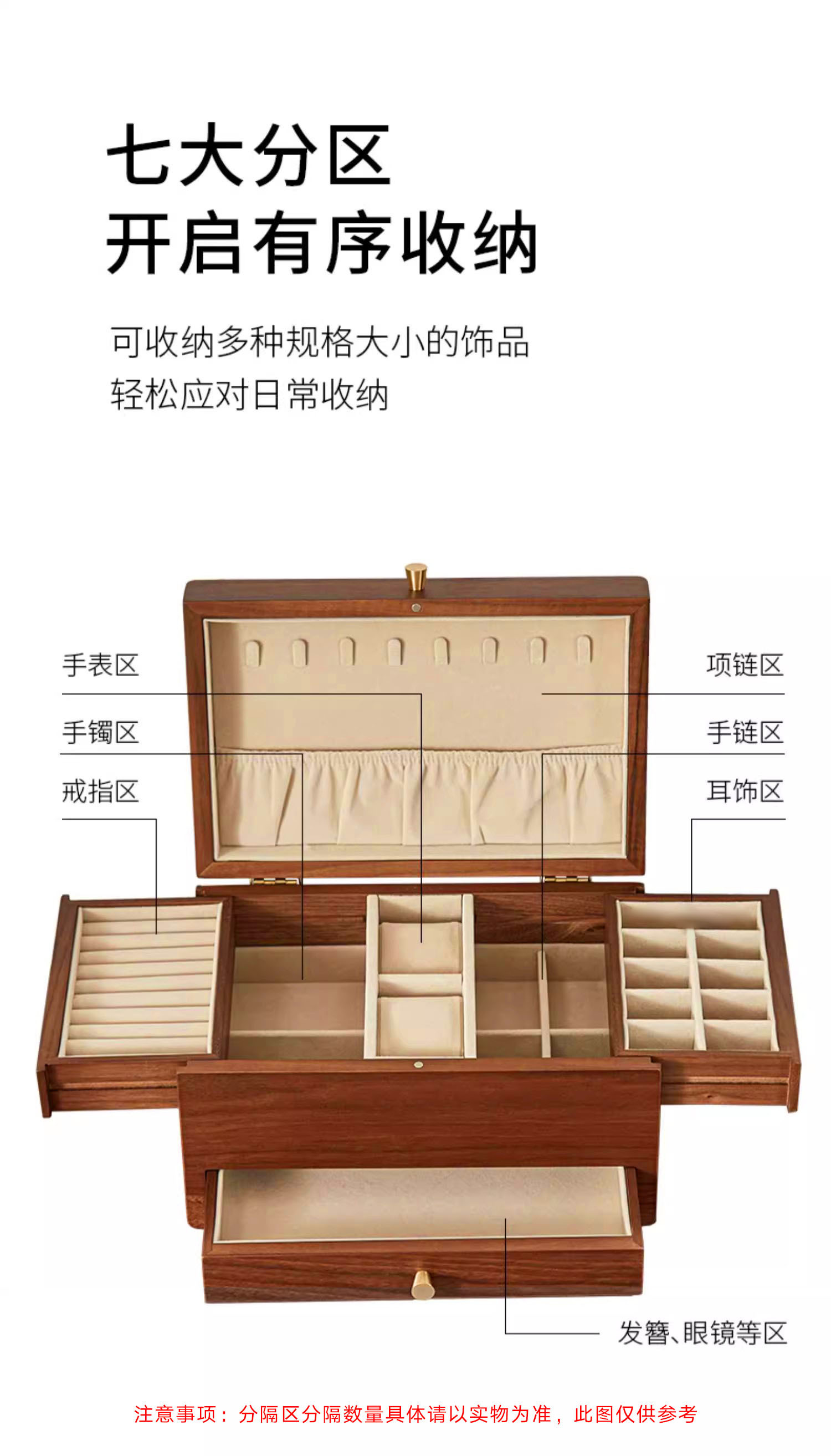 合理布局,分区收纳,可放置多件首饰,不管是收纳手镯手表、耳钉耳坏、项链吊坠,还是戒指手链,都可以巧妙容纳。