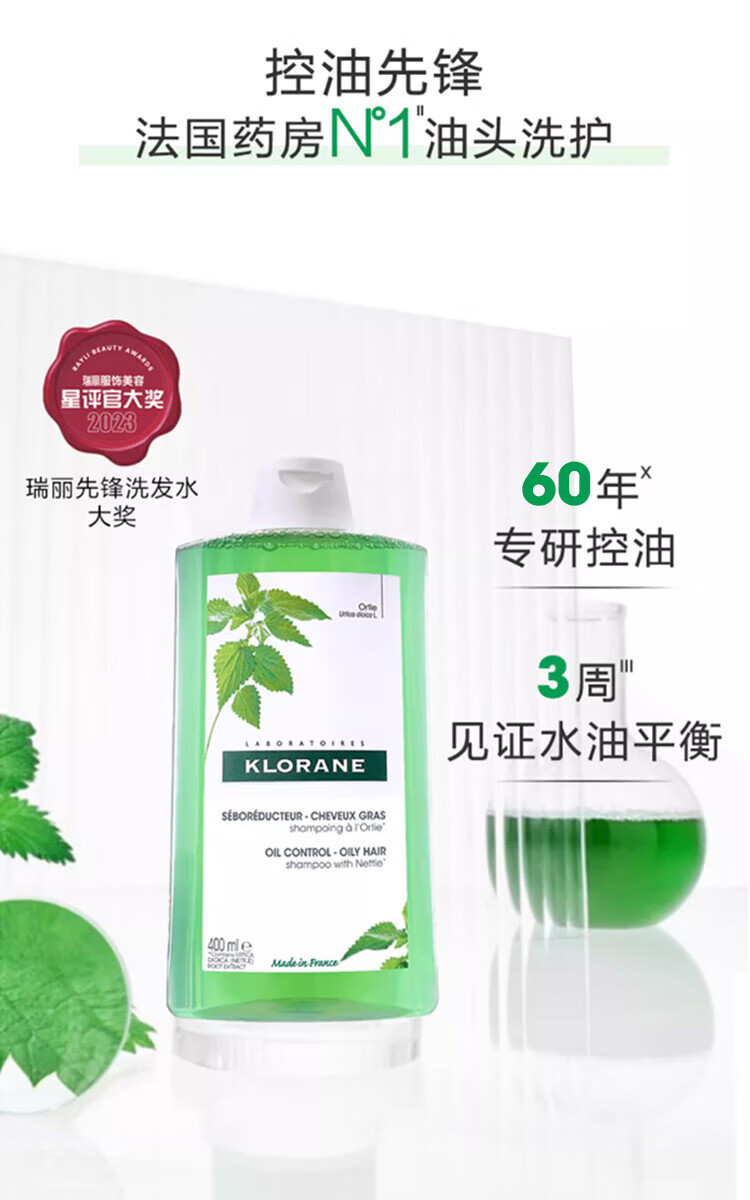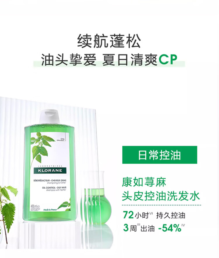 康如(KLORANE)荨麻控油洗发露400ml 改善油头蓬松发根洗发水