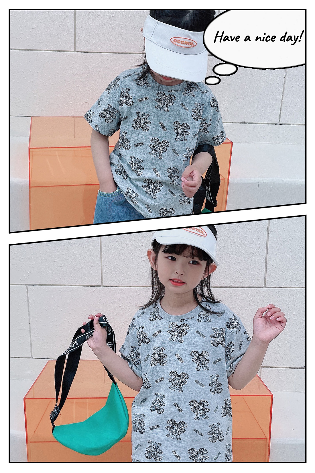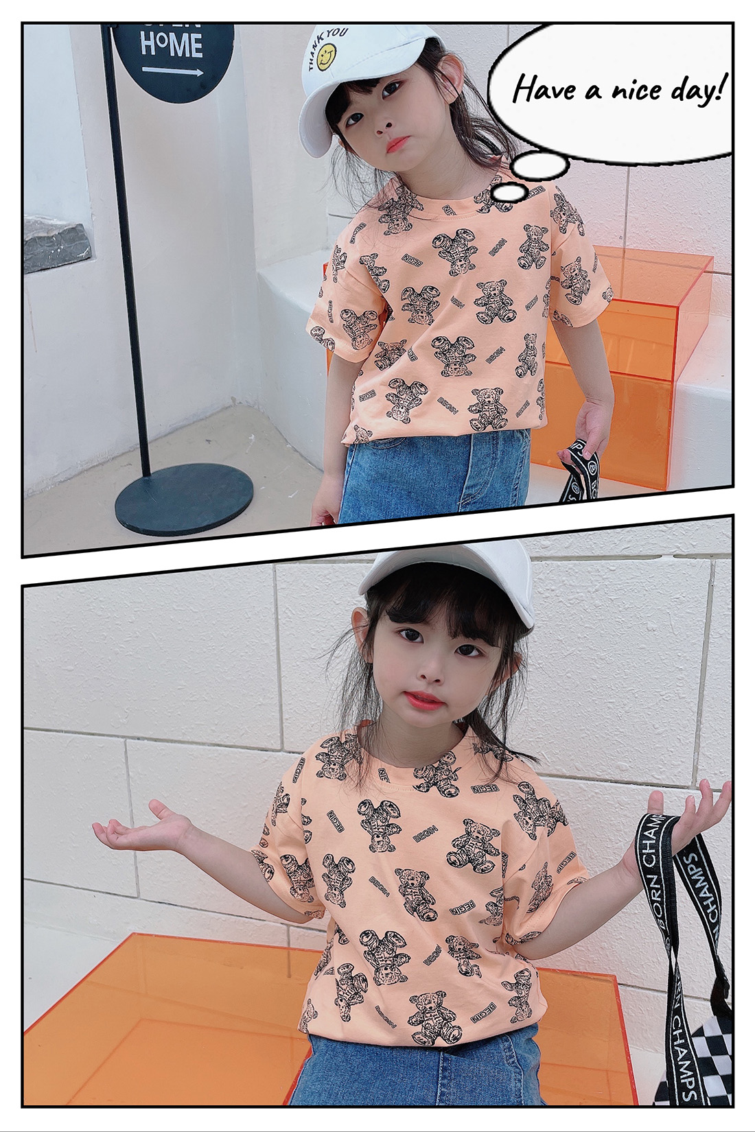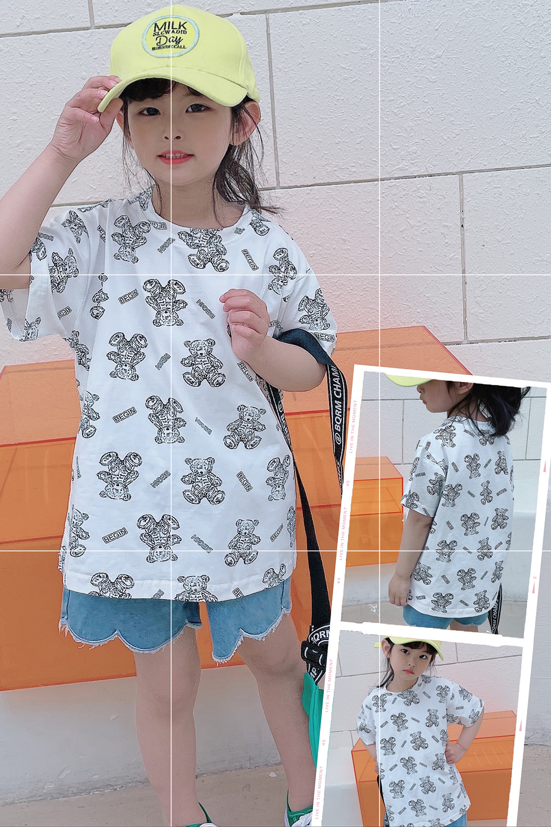 1:明亮马卡龙色系搭配小熊数码印花质感,宽松落肩版型,好穿不挑身材