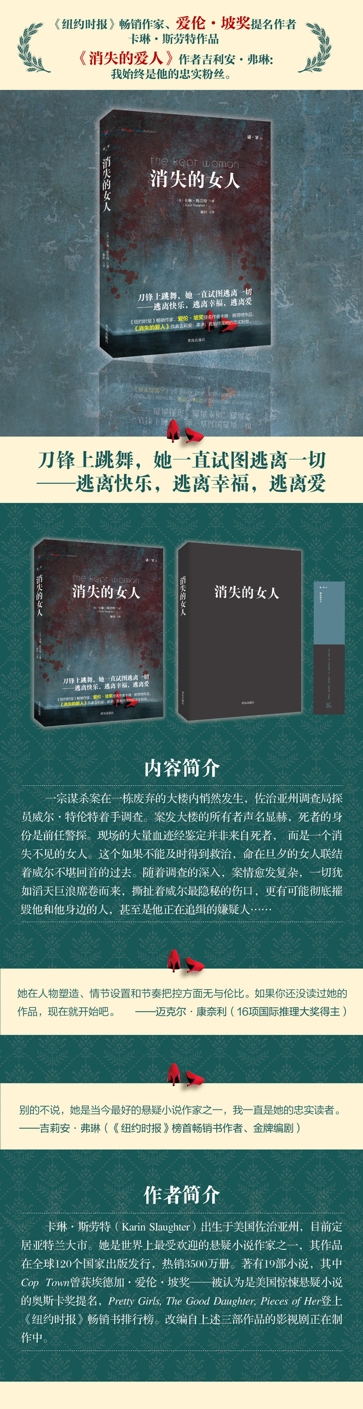卡琳·斯劳特(Karin Slaughter)出生于美国佐治亚州,目前定居亚特兰大市。她是世界上最受欢迎的悬疑小说作家之一,其作品在全球120个国家出版发行,热销3500万册。著有19部小说,其中Cop Town曾获埃德加·爱伦·坡奖——被认为是美国惊悚悬疑小说的奥斯卡奖提名,Pretty Girls, The Good Daughter, Pieces of Her登上《纽约时报》畅销书排行榜。改编自上述三部作品的影视剧正在制作中。