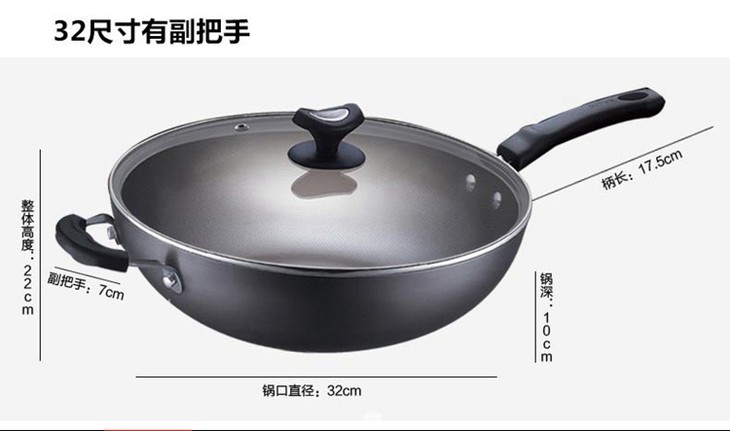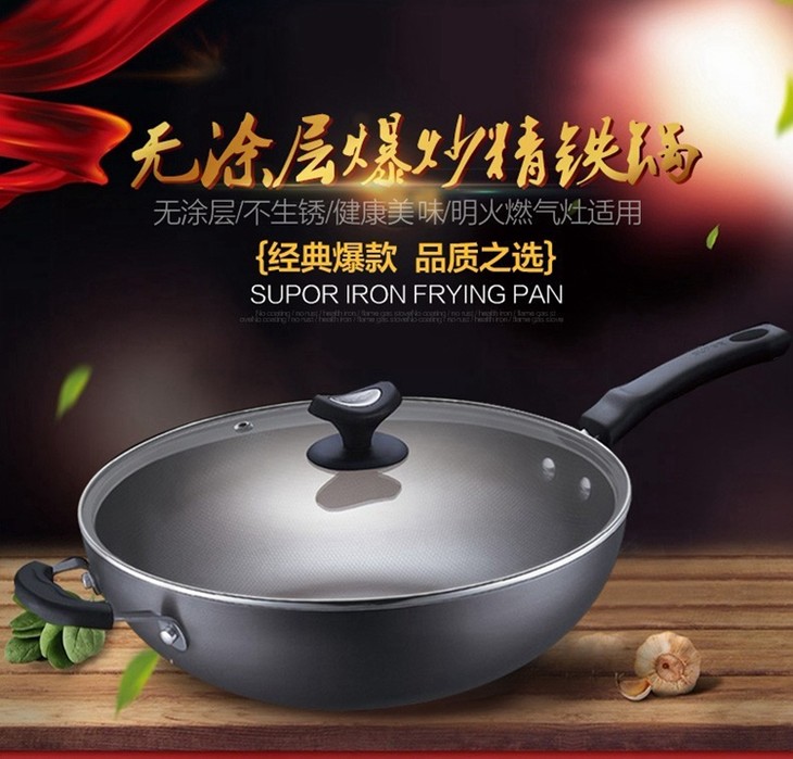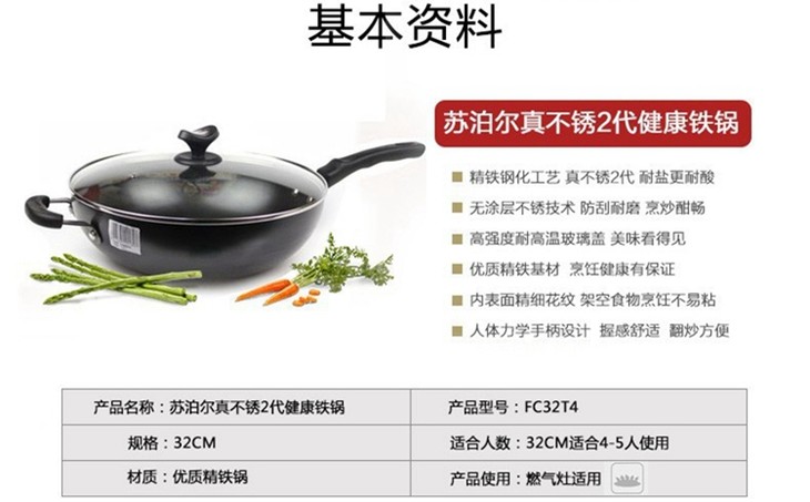 苏泊尔(508518)炒锅臻铁真不锈无涂层炒菜锅精铸铁锅平底燃气煤气明火专用 FC32T21 32cm 有副把手 带锅盖尖底