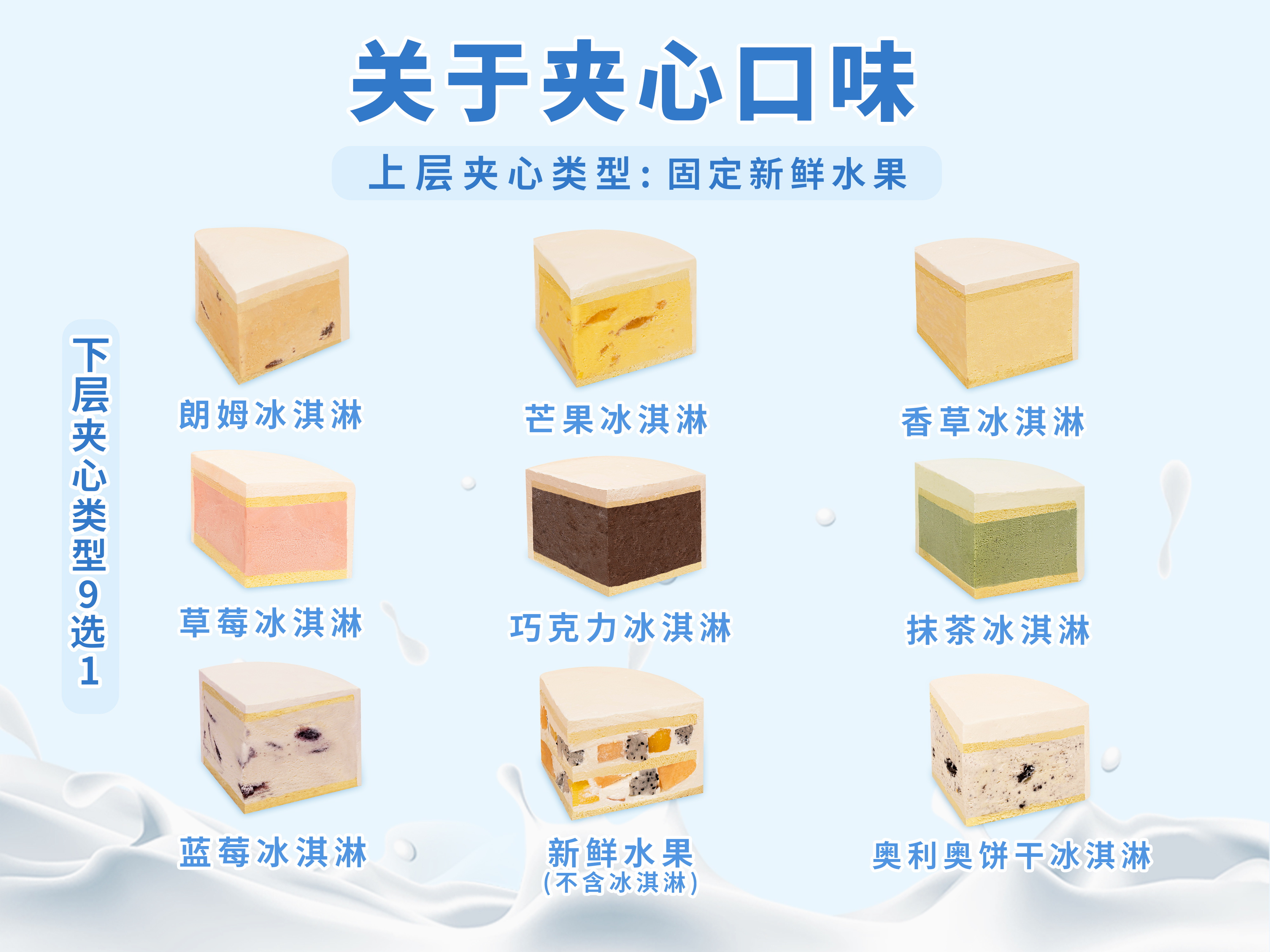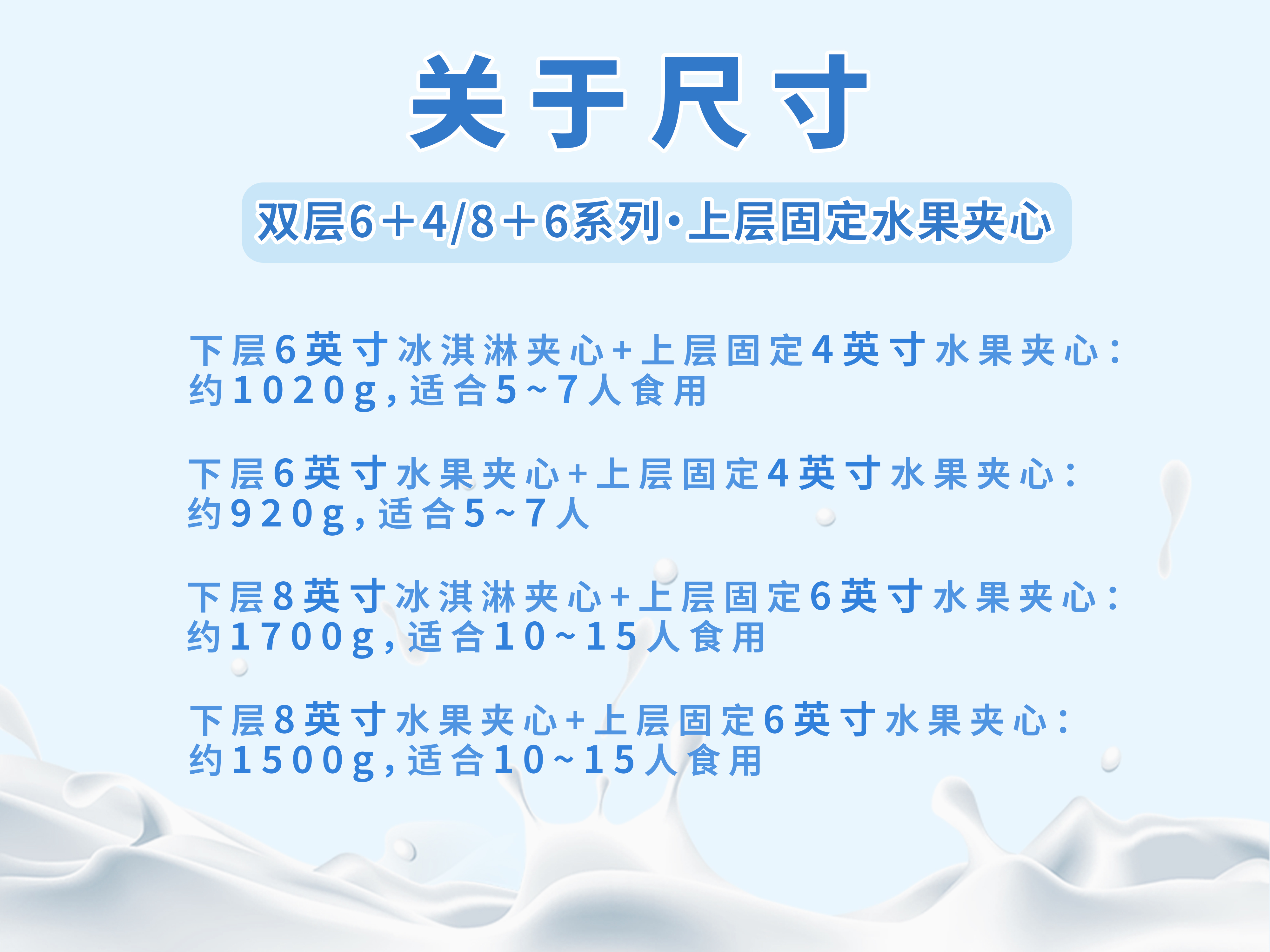 下层8英寸冰淇淋夹心+上层固定6英寸水果夹心:约1700g,适合10~15人食用