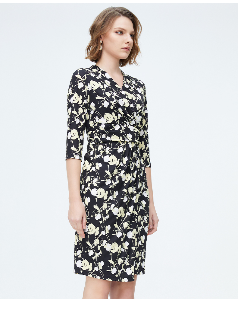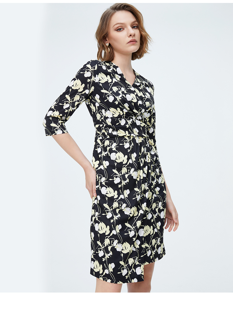 皮尔卡丹女装百搭通勤刺绣V领长袖连衣裙P0427DL20B0