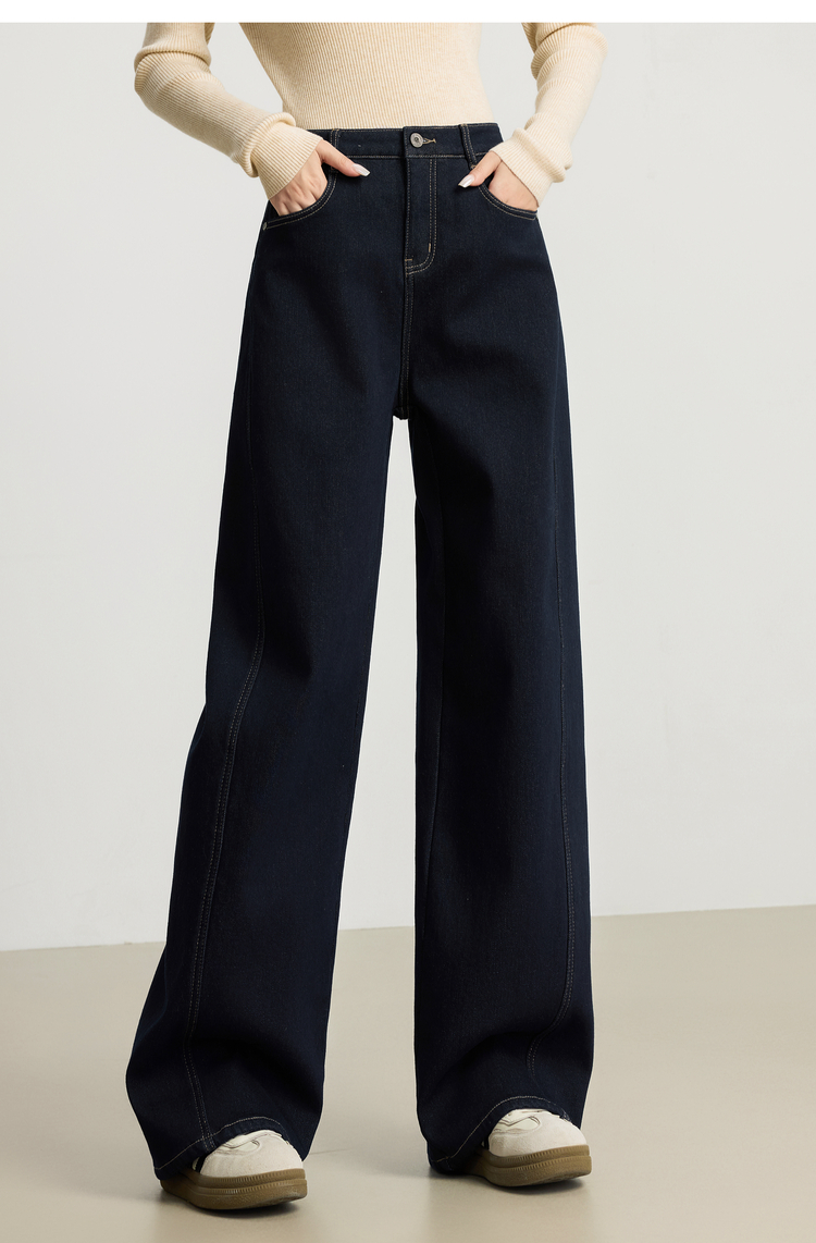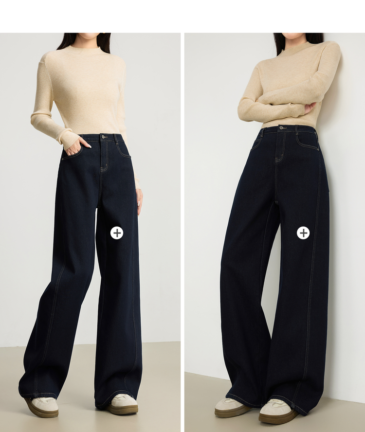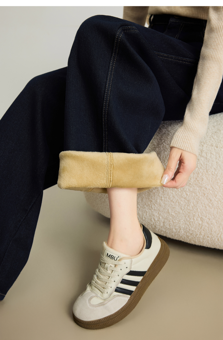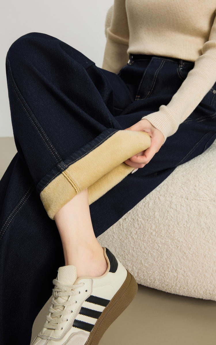 【周末秒杀】熙世界「进阶厚绒法棍裤」加绒直筒牛仔裤女冬季复古保暖阔腿长裤