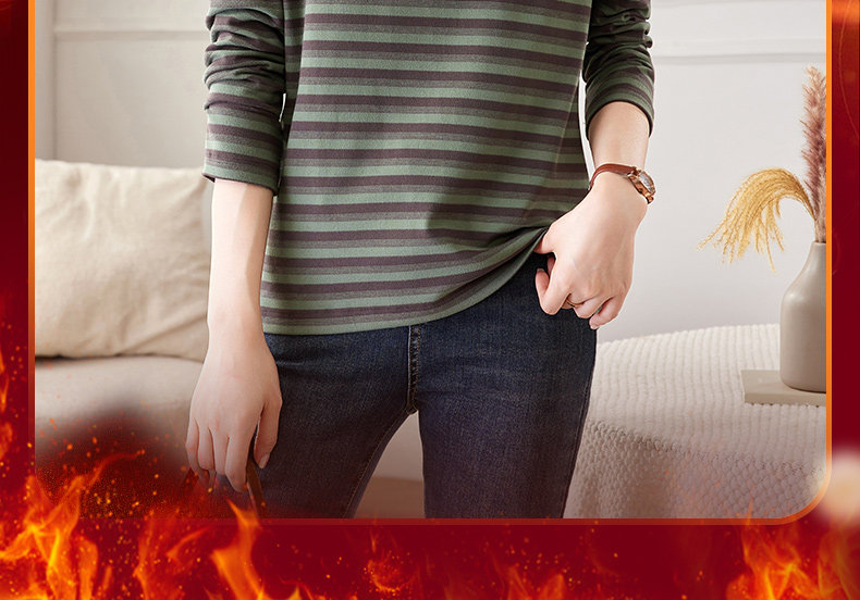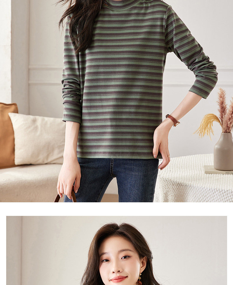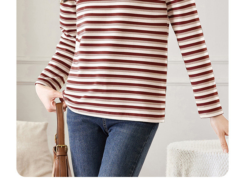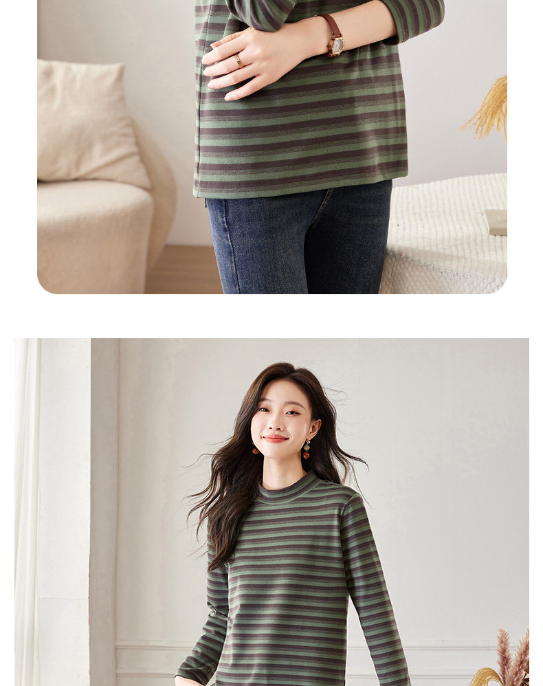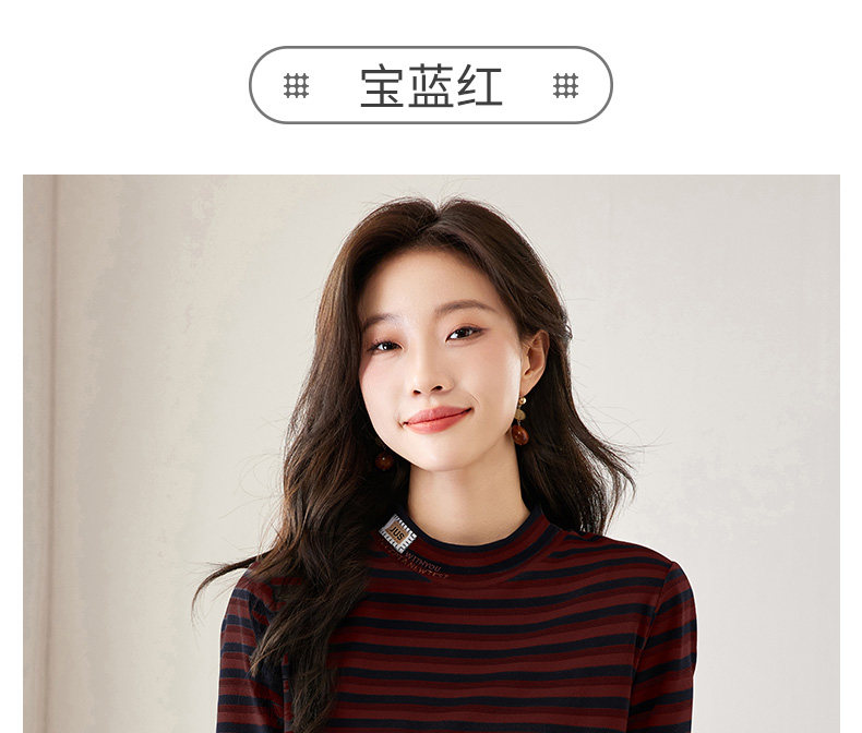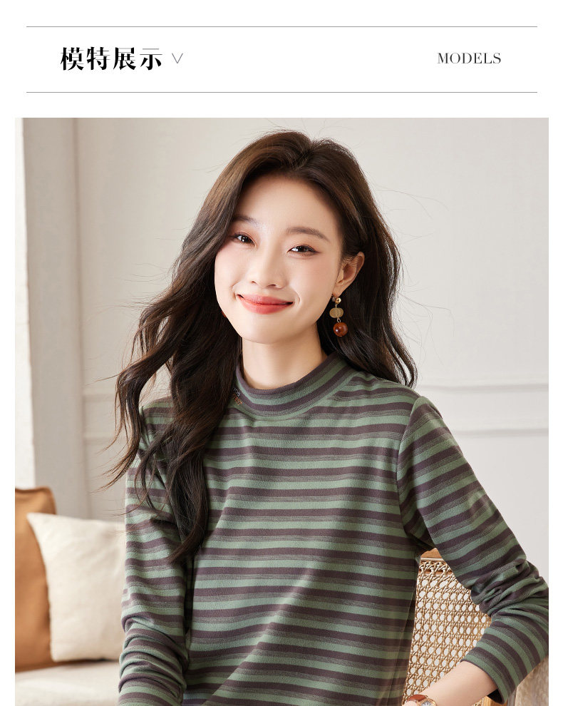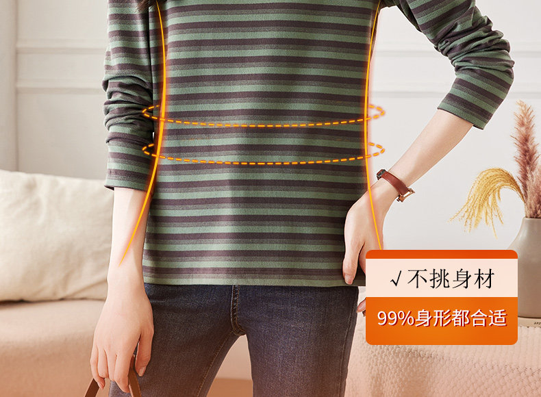 女士德绒半高领打底衫女秋冬新款加绒大码女装条纹长袖t恤女上衣