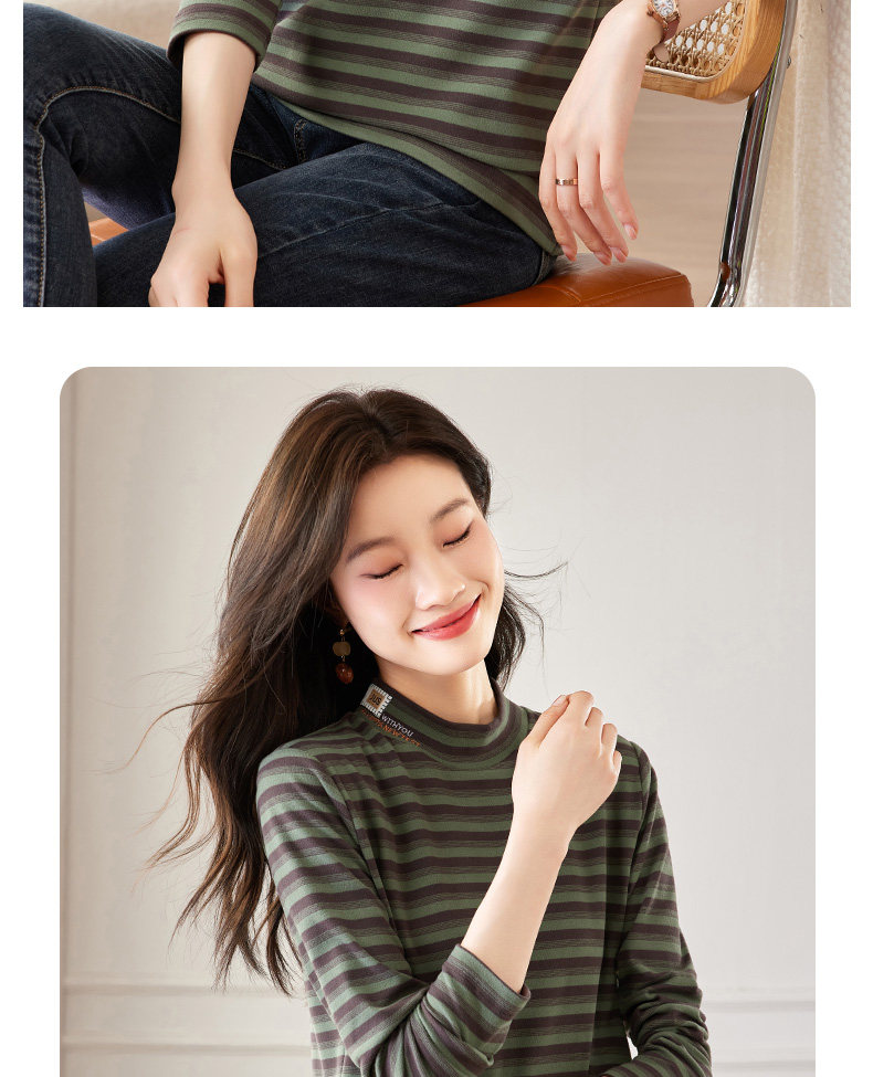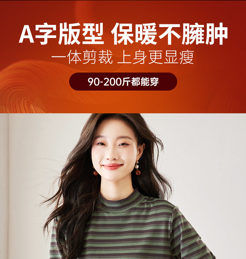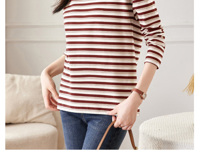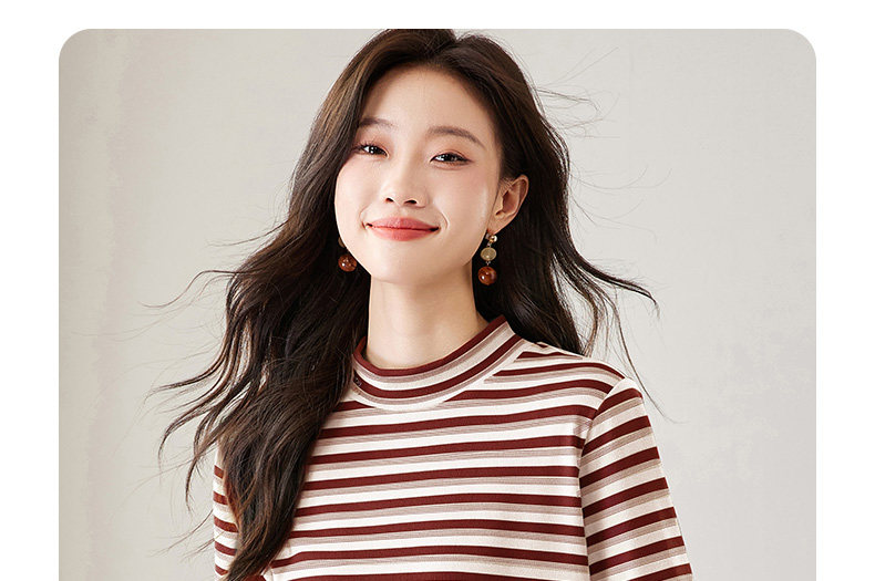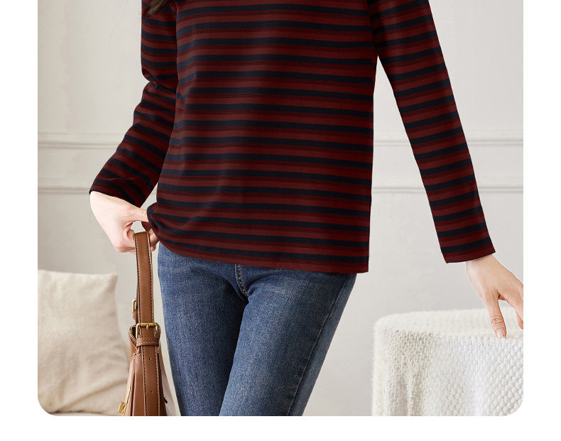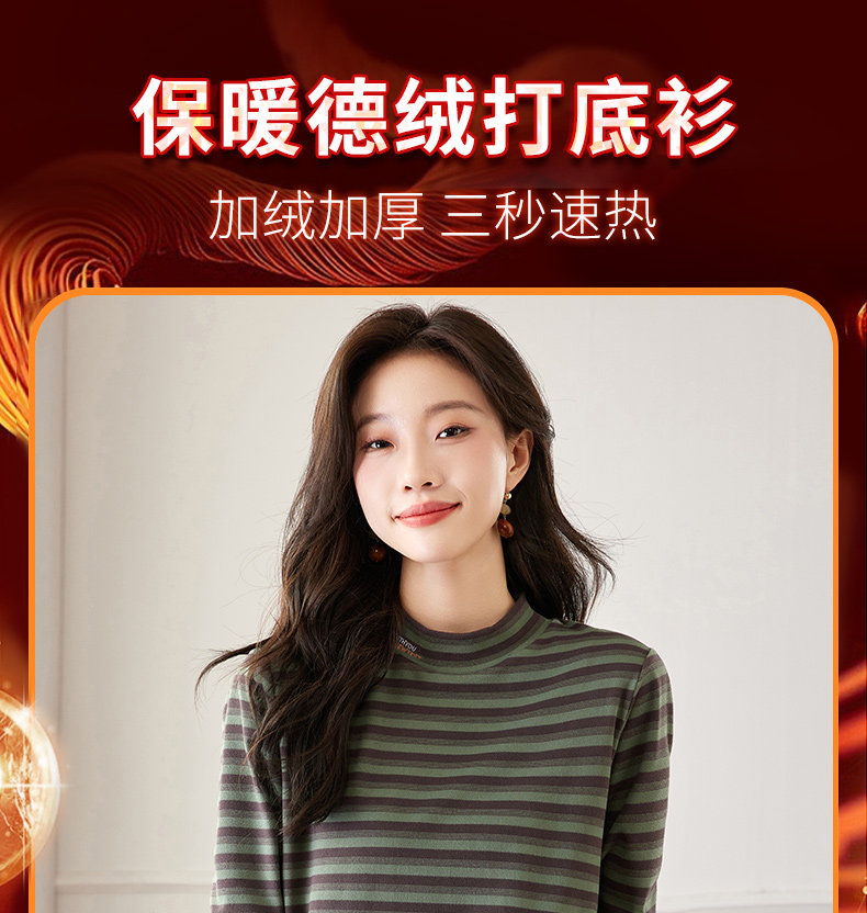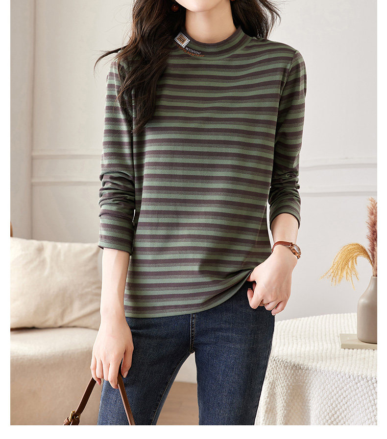 女士德绒半高领打底衫女秋冬新款加绒大码女装条纹长袖t恤女上衣