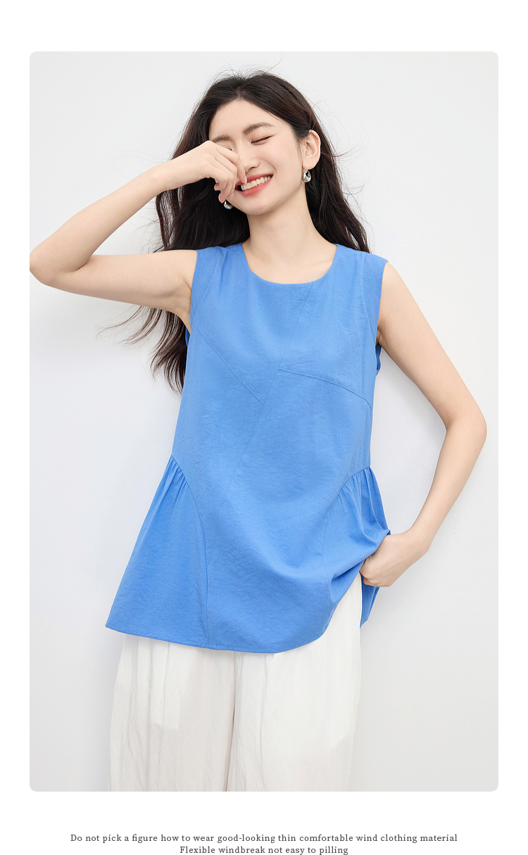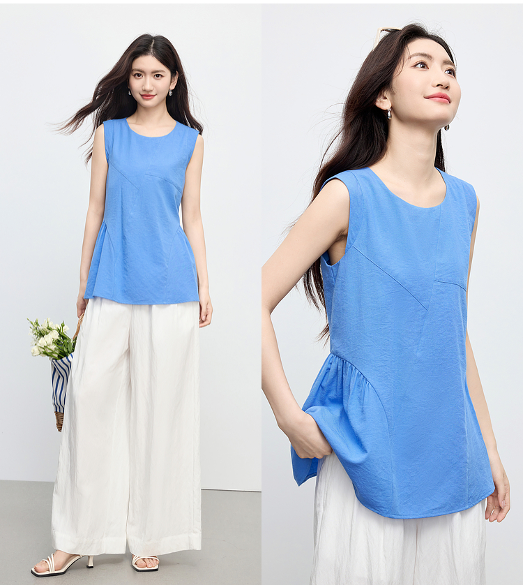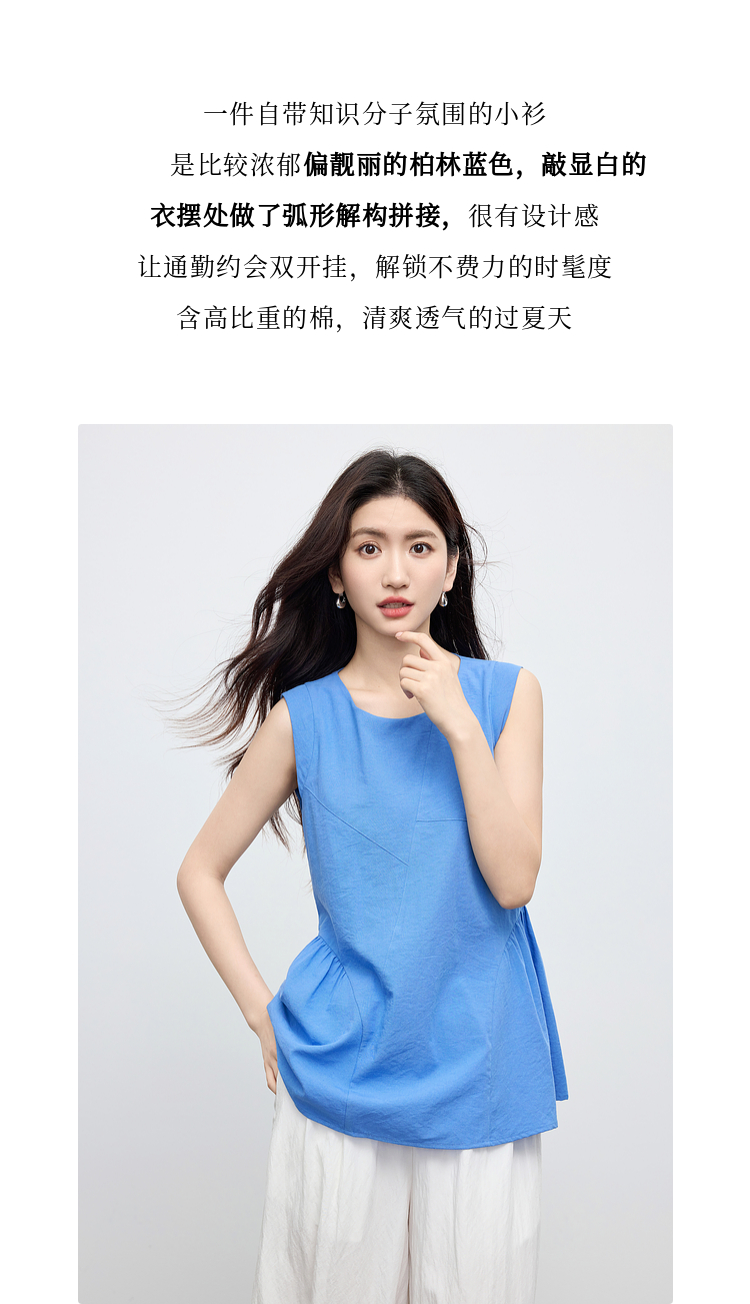 【07/09新品】熙世界克莱因蓝无袖衬衫女夏季2025新款通勤休闲圆领坎肩背心上衣