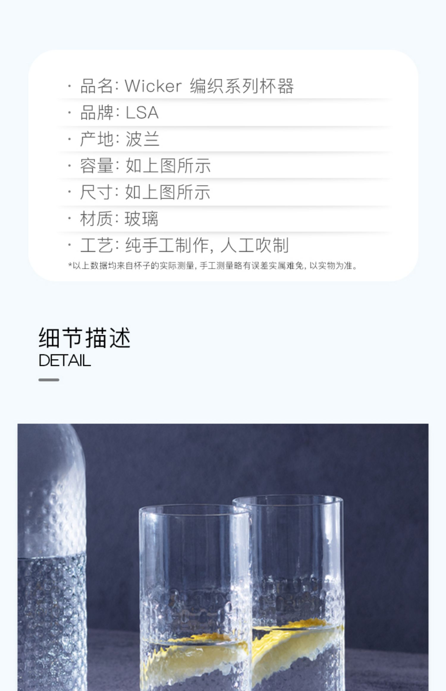 LSA Wicker 进口手工玻璃杯 家用大容量水壶办公室喝水杯