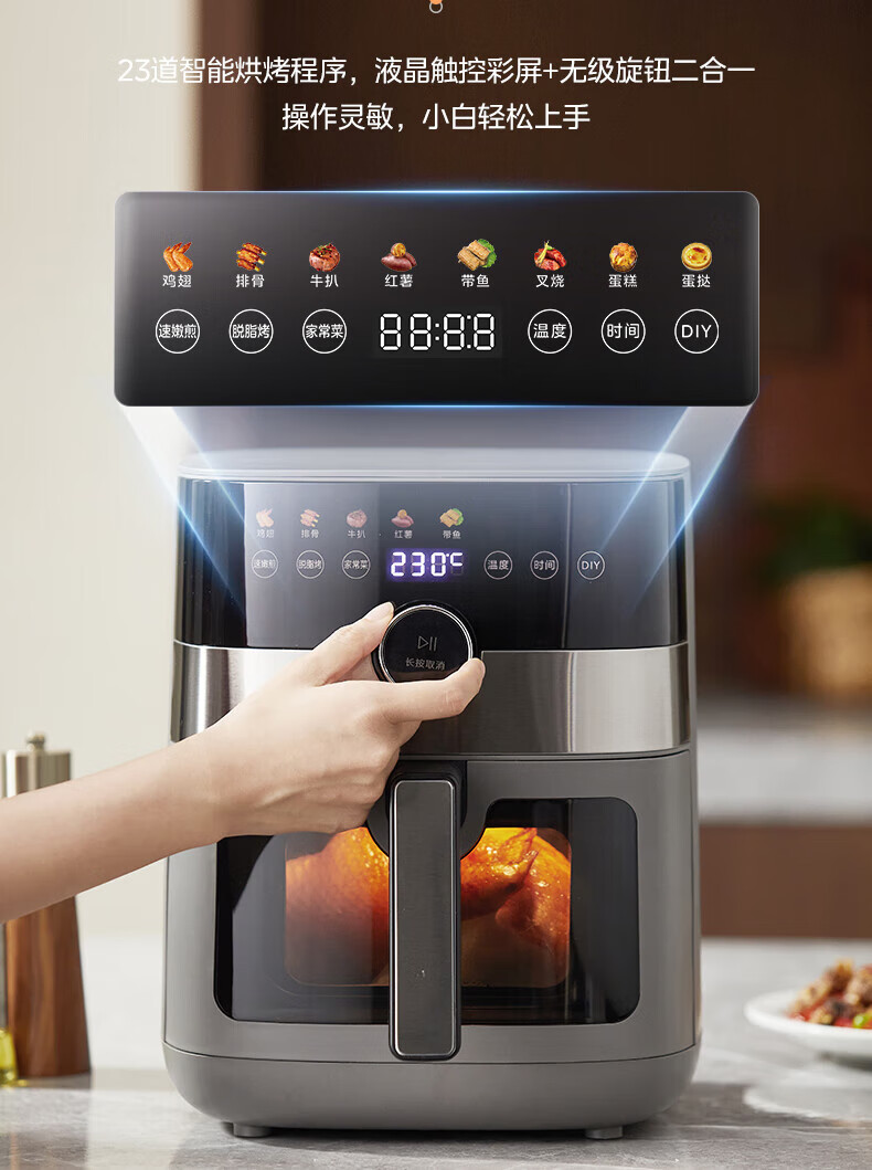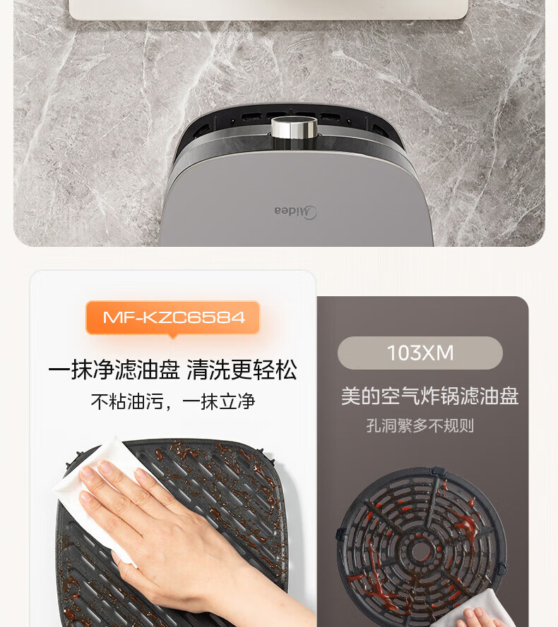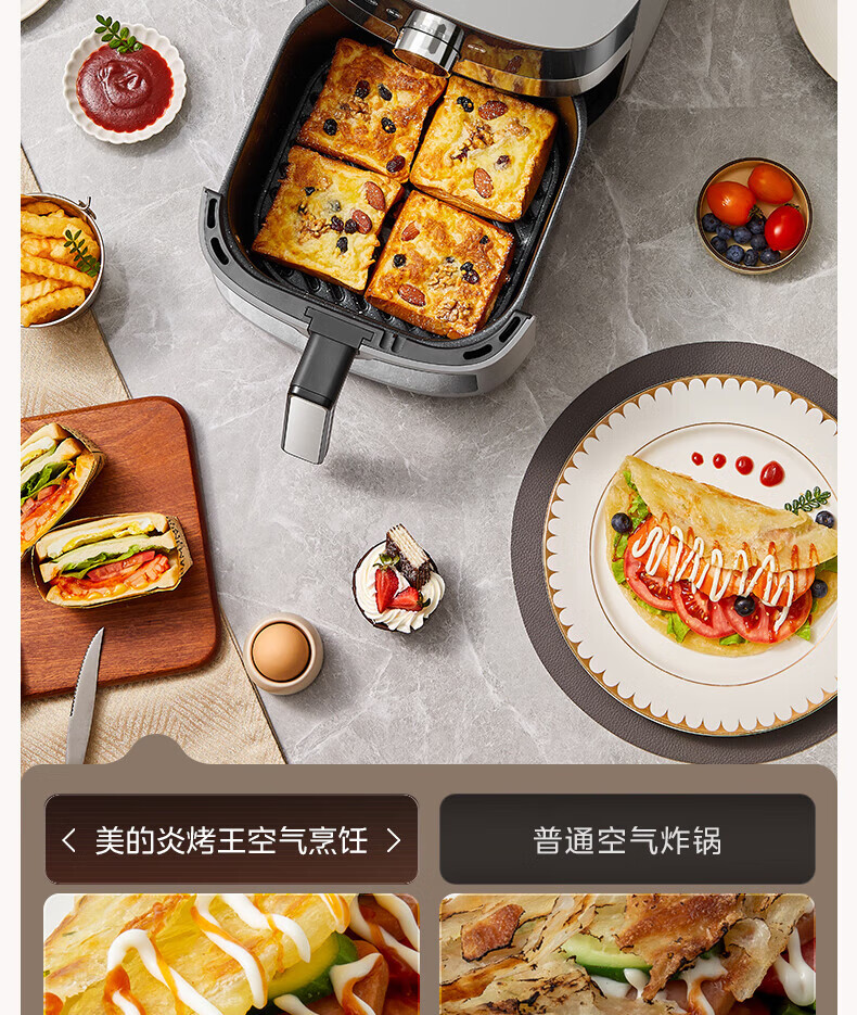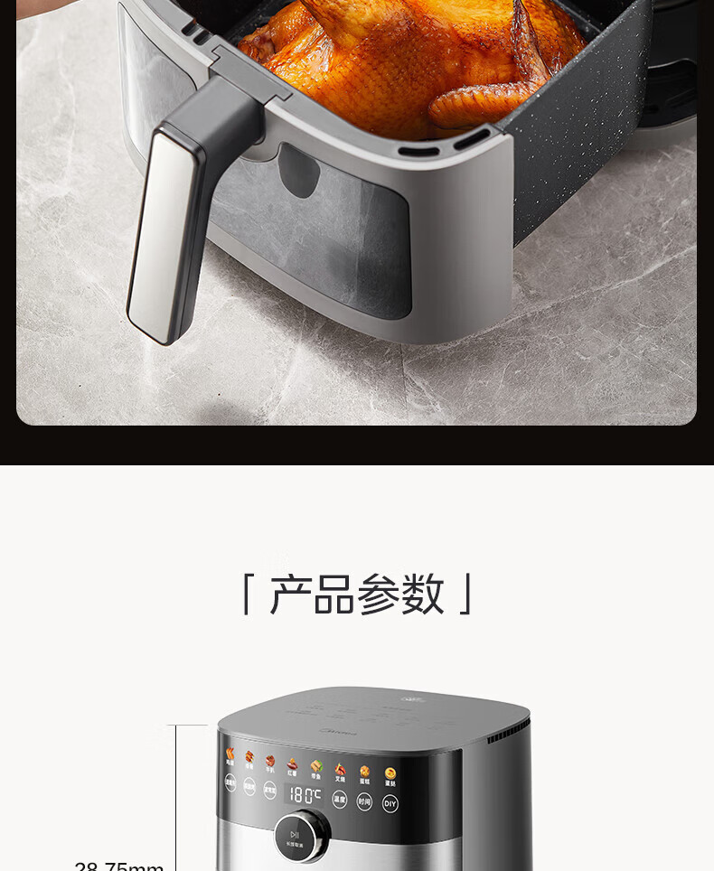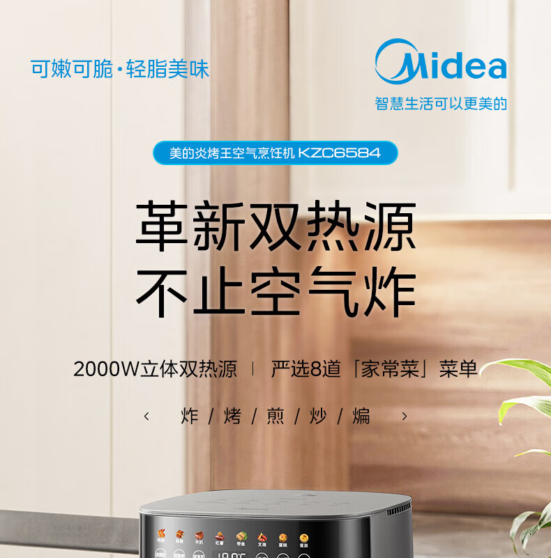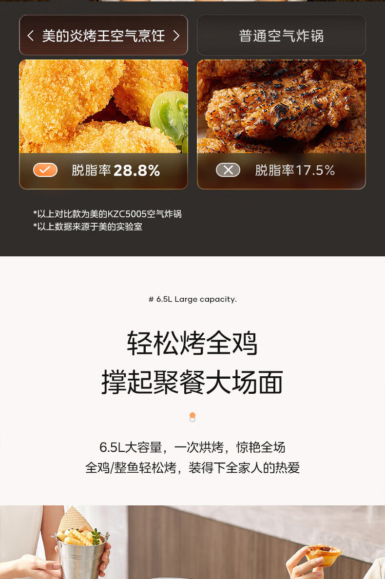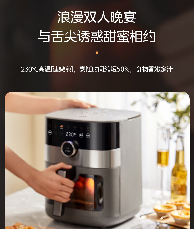 美的(Midea)空气炸锅 炎烤王烹饪机 家用6.5L大容量免翻面多功能 蒸汽嫩炸可视窗口旋钮操控一体煎烤炸锅 MF-KZC6584 6.5L