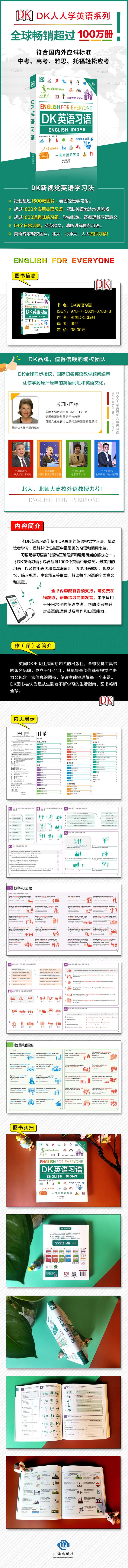 DK新视觉英语学习法,超过1500副图片,看图轻松学习语。超过1000个实用英语习语,帮助英语表达地道流畅。54个日常话题,英英释义,清晰讲解复杂习语。超过1000道趣味练习题,学完即练,透彻理解习语意义。符合国内外应试标准,中考、高考、雅思、托福轻松应考。DK人人学英语系列靠前超过1000000册。权威的母语编校团队,北大、北师大、人大名师力荐!