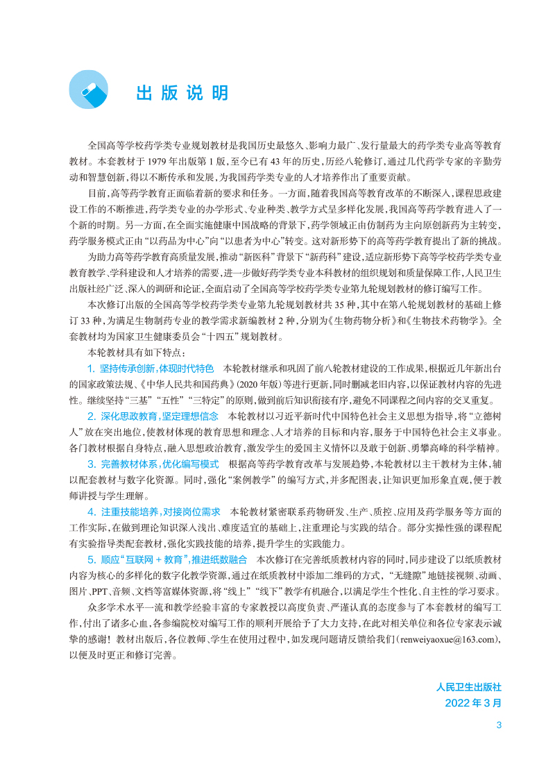 历史最悠久、影响力最广、发行量zuì大的药学类专业高等教育教材,为我国药学类专业的发展与人才培养做出了重要贡献。在广泛调研第八轮教材编写及使用建议的基础上,本次修订拟根据药学学科领域的新理论、新方法、新技术,以及新出台的国家政策法规、《中国药典》等对本轮教材进行更新,注重学生实践能力的提升,培养学生的创新能力和新药研发能力。同时,将思想政治教育纳入教材,激发学生的爱国主义情怀以及敢于创新、勇攀高峰的科学精神。为了顺应“互联网+教育”需求和我社数字资源的积累,本次修订将同步进行数字化资源建设。