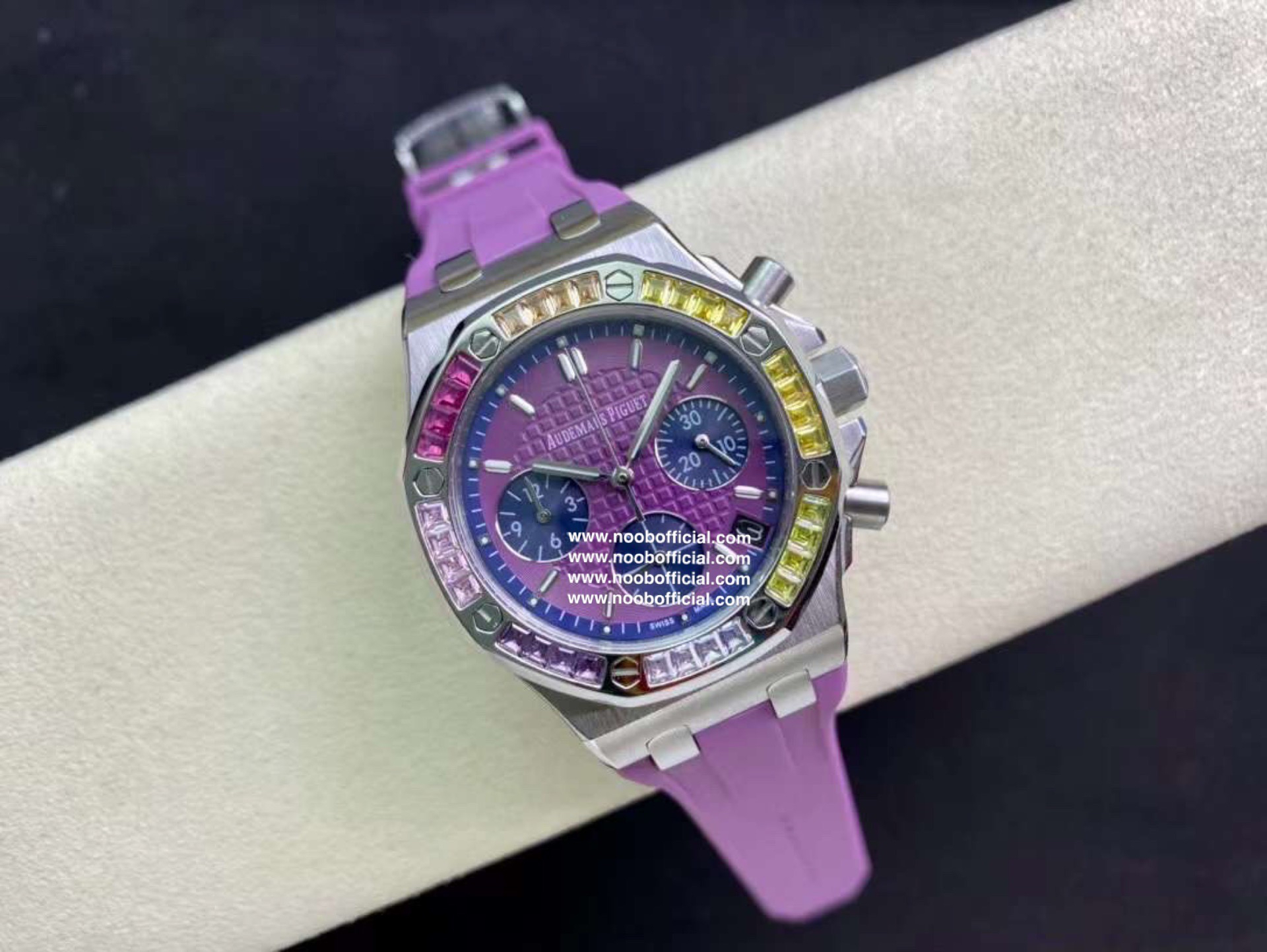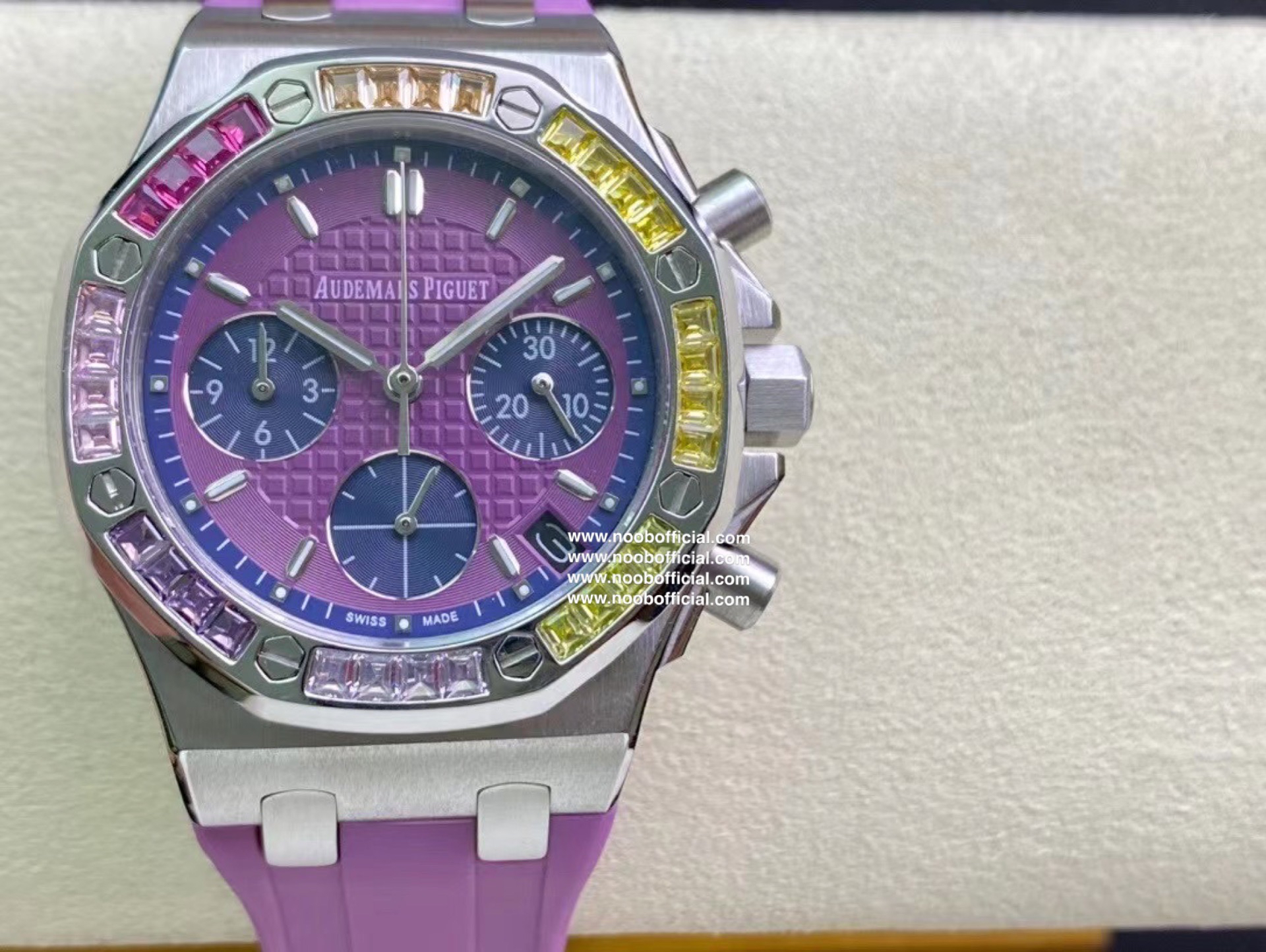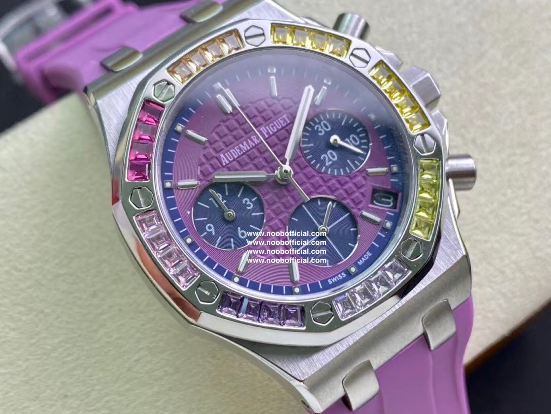 316精钢表壳镶钻八角钻石壳边设计 进口瑞士多动能石英机芯 稳定带计时功能 蓝宝石水晶镜面刮不花玻璃 采用食品级别安全橡胶表带亲肤无毒性 百搭尺寸37mm任何女士手型都可以佩戴,MF厂高版本值得拥有💯🥇网红爆款爱彼皇家橡树香芋紫来货🌟🌟