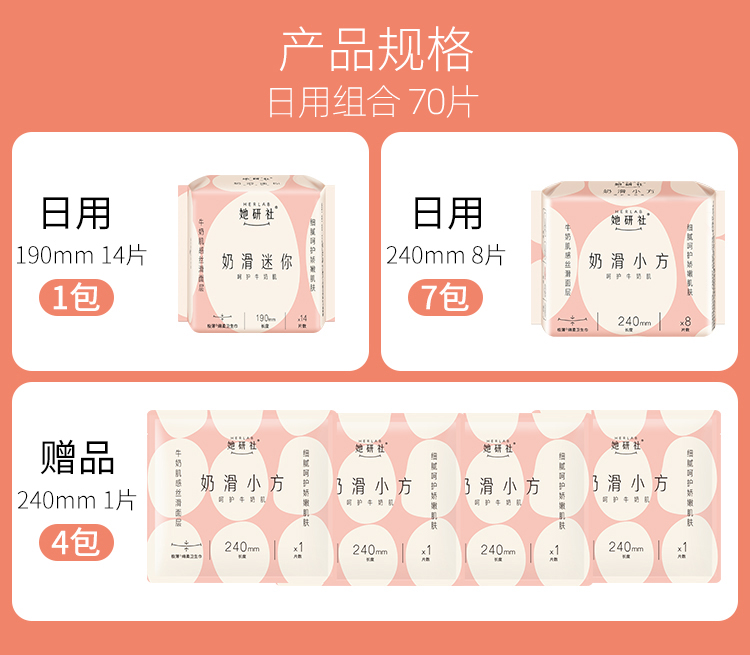 她研社奶滑小方日用组合8包70片 送4片同款日用 细腻面层 高吸水性 时刻保持干爽