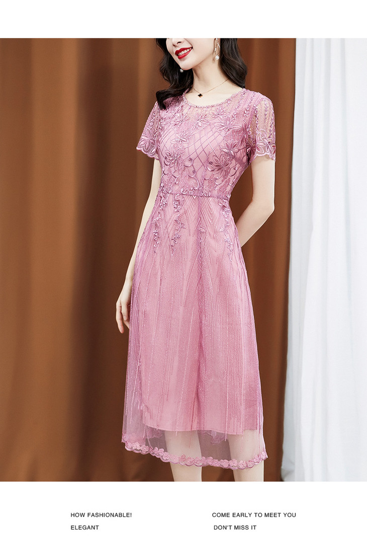 圆领绣花纯色,中长款真丝连衣裙SM-8202606