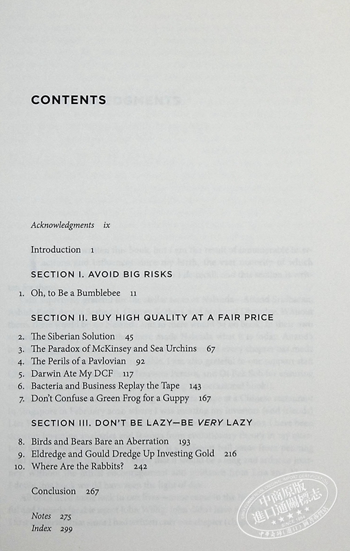 在成功的进化战略的启发下,普拉萨德概述了他的反直觉的长期收益原则。他提供了三条投资箴言: 避免大的风险;以合理的价格购买高质量的产品;不要懒惰--要非常懒惰。普拉萨德提出了一个有说服力的理由,即排除绝大多数的投资机会,主张拥有高质量的企业。