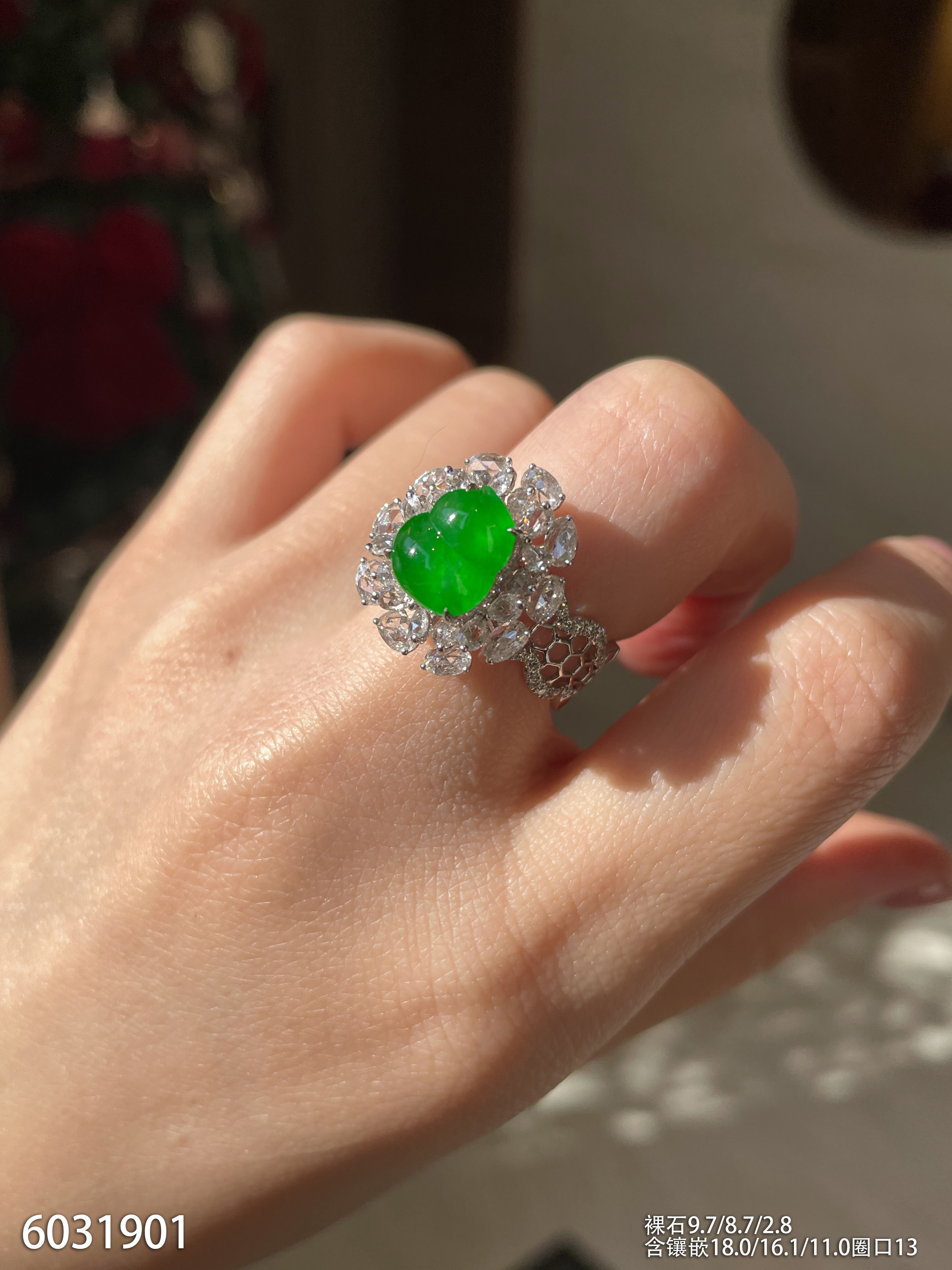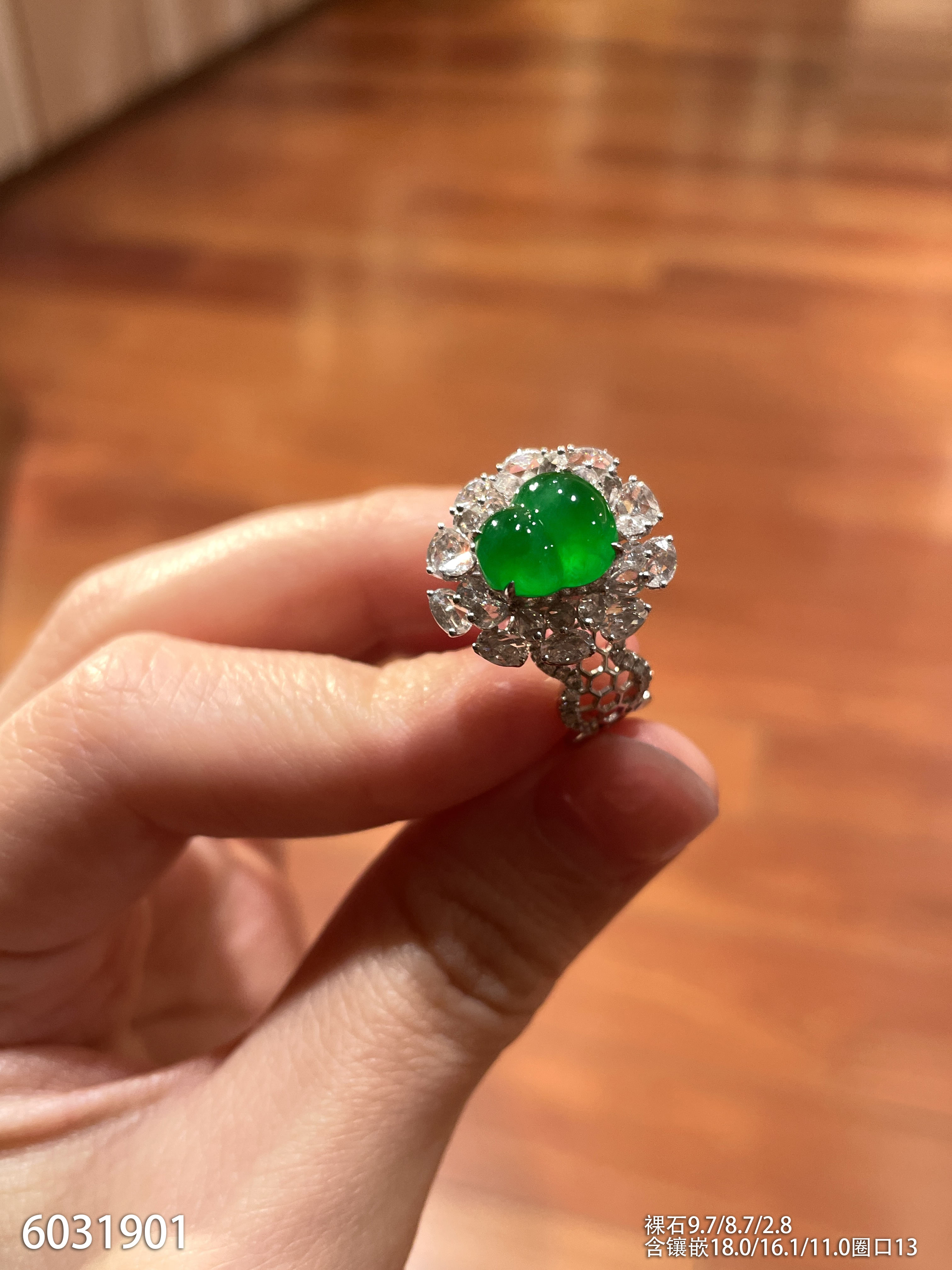 120-1232908,玻璃种木那艳绿蛋面戒指,具体价格微信咨询