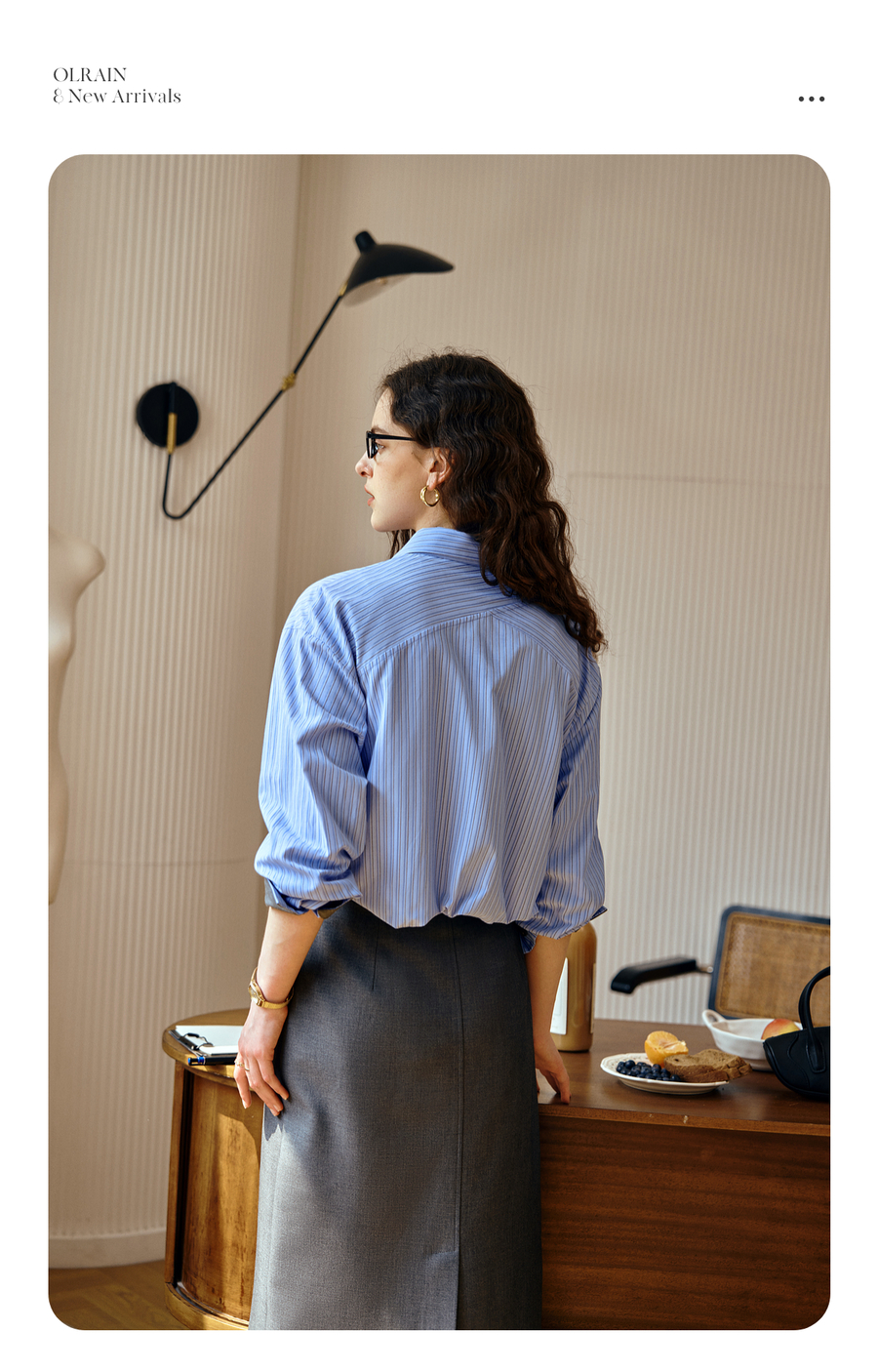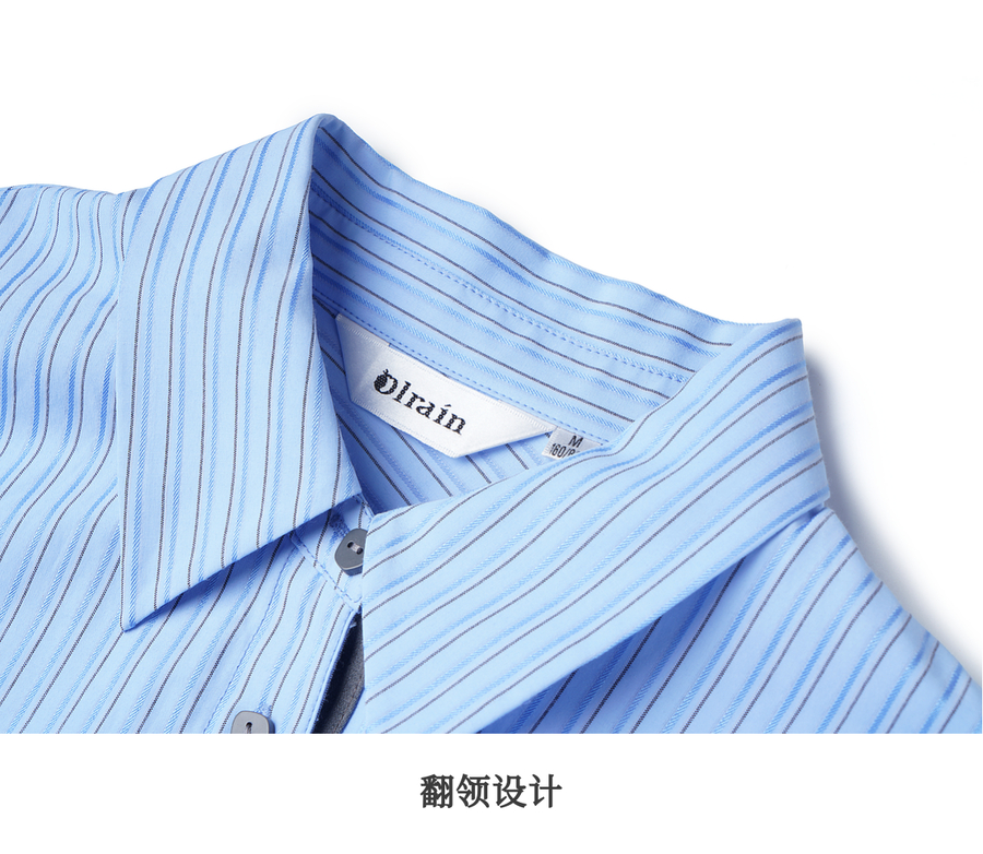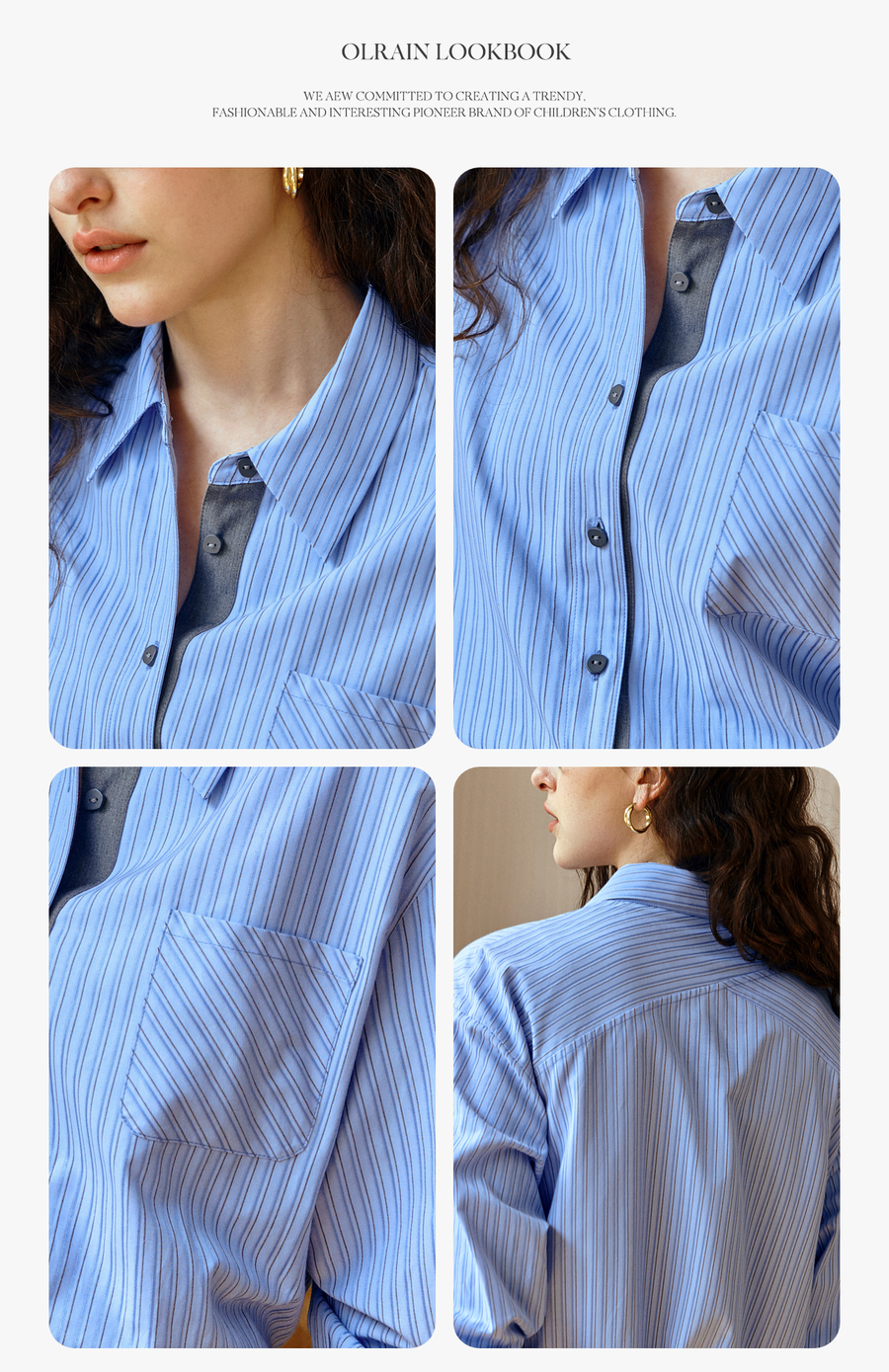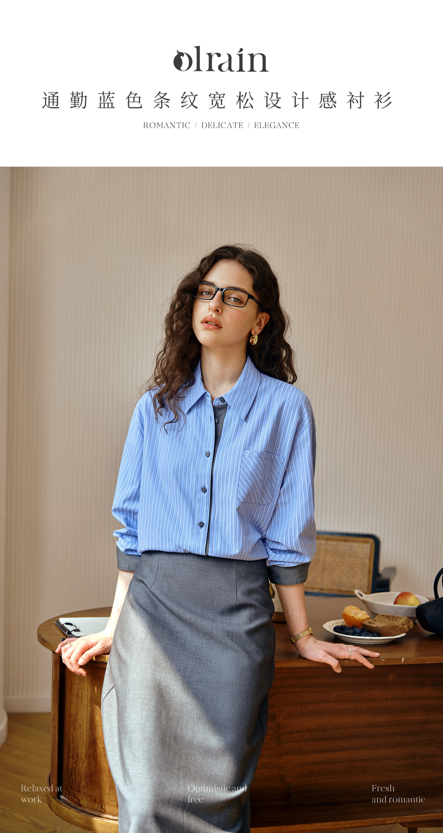 OLrain欧芮儿2025新款女秋季通勤蓝色条纹宽松设计感衬衫长袖衬衣
