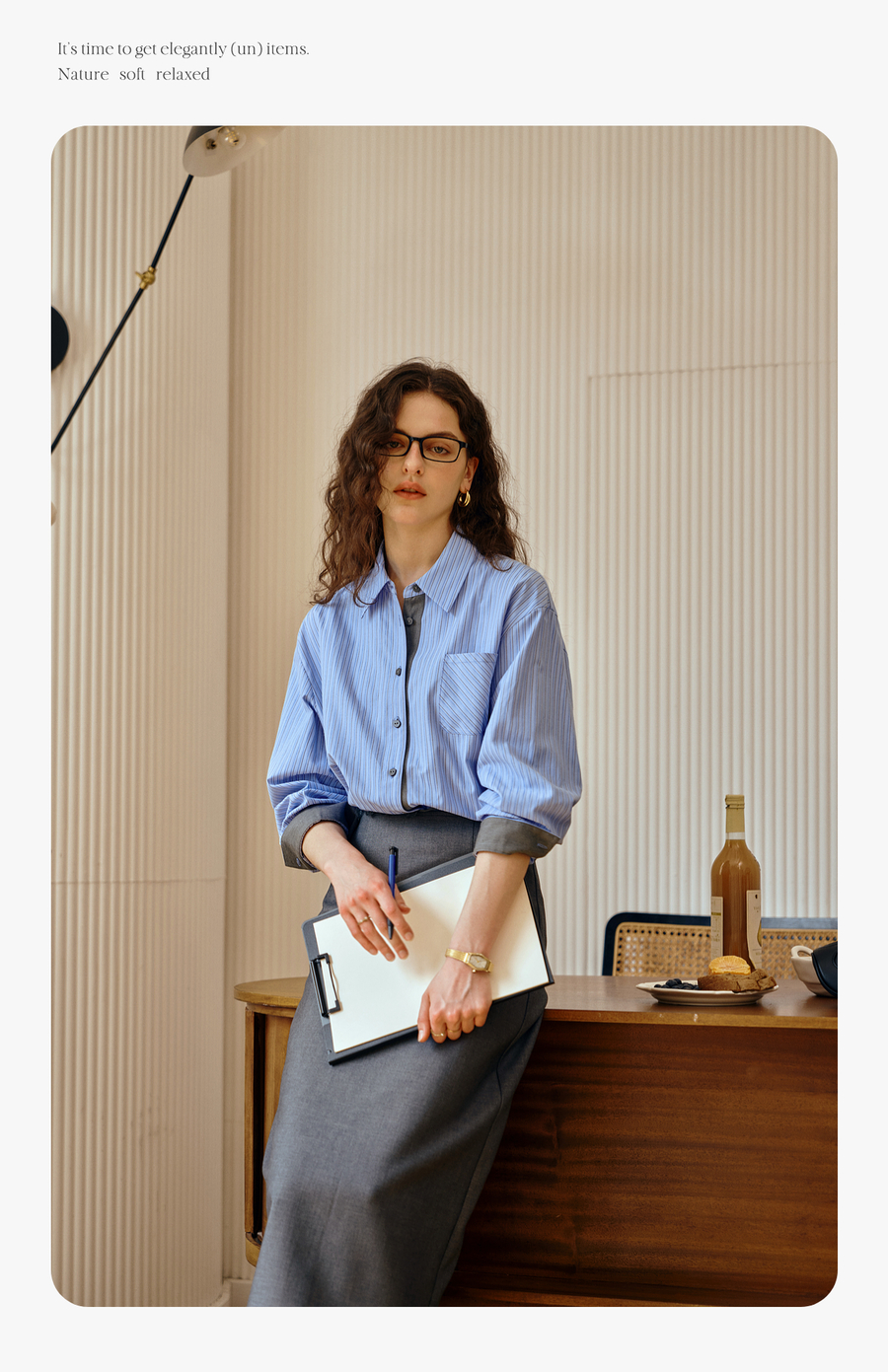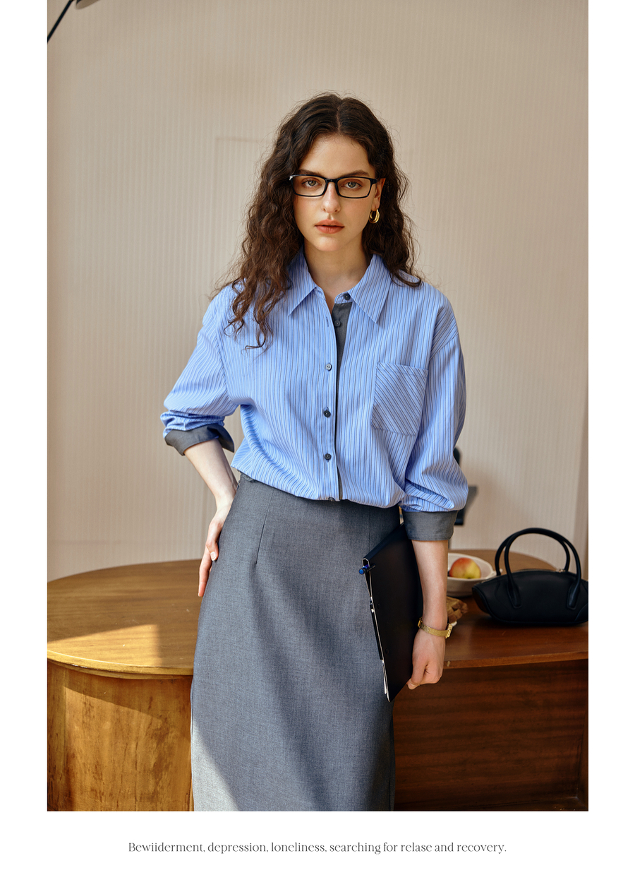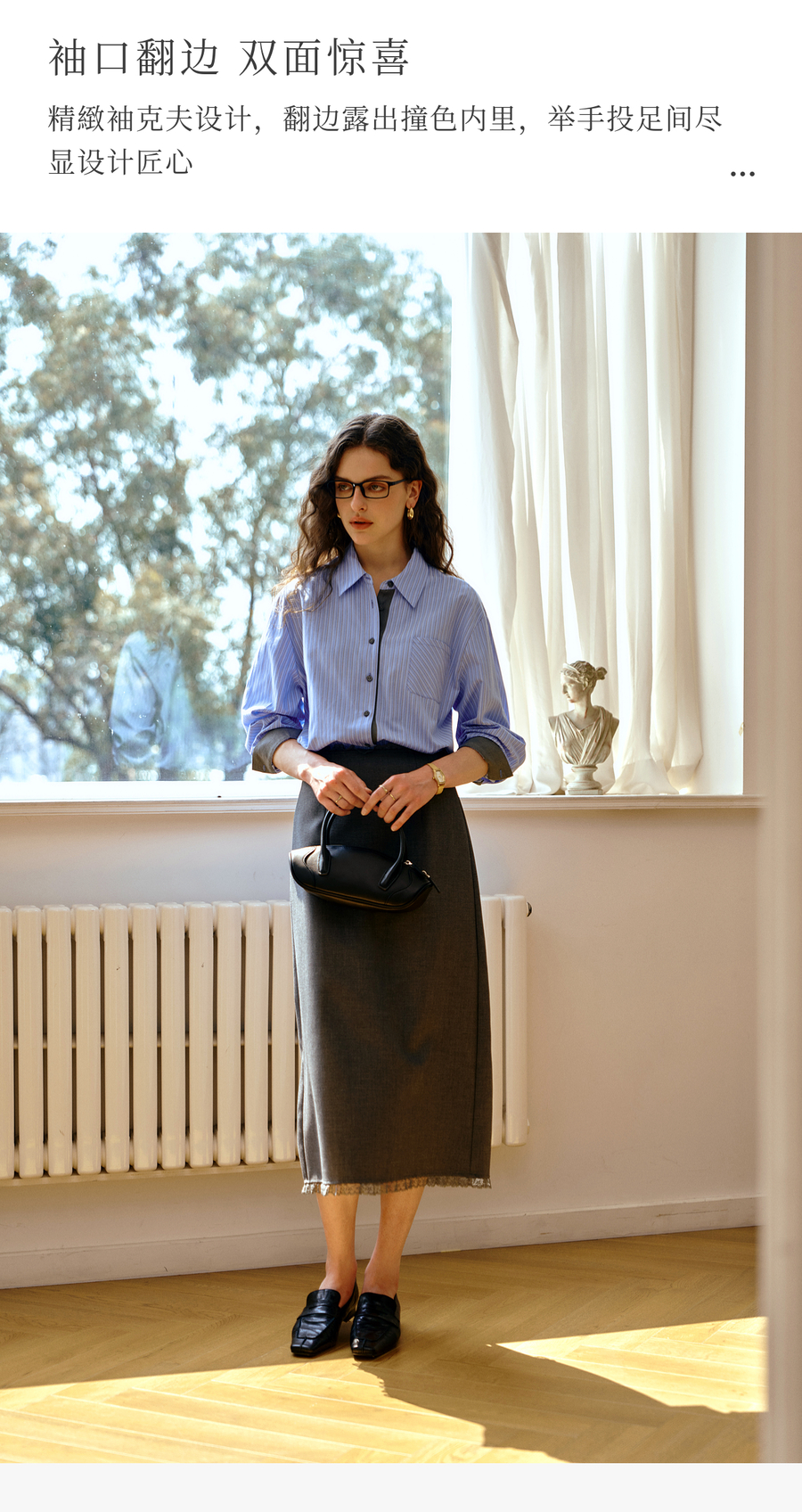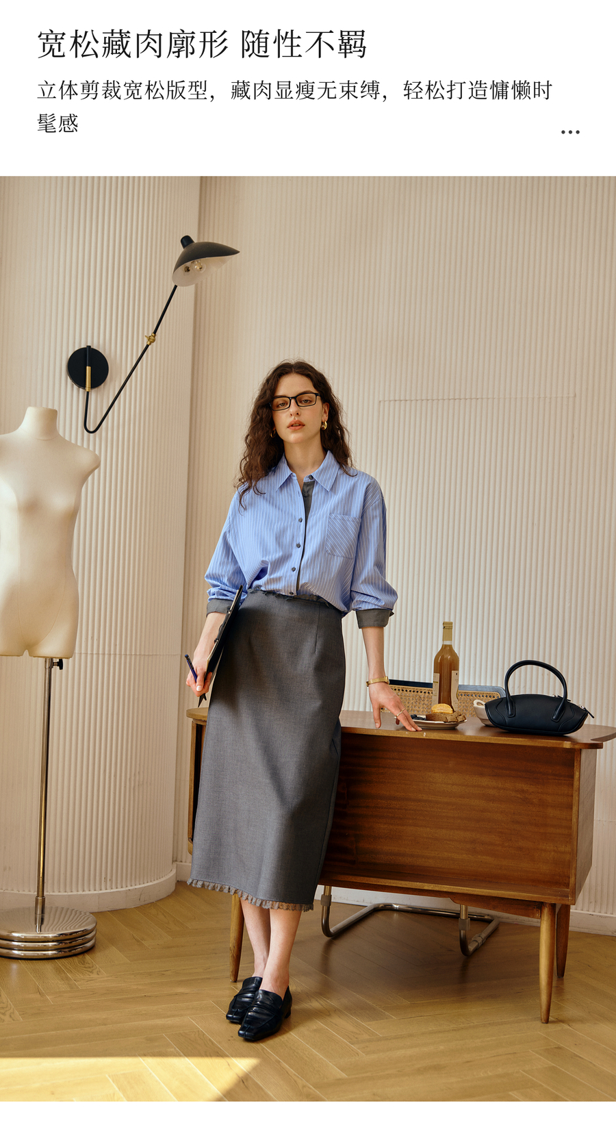OLrain欧芮儿2025新款女秋季通勤蓝色条纹宽松设计感衬衫长袖衬衣