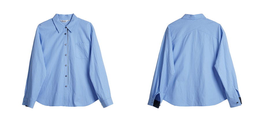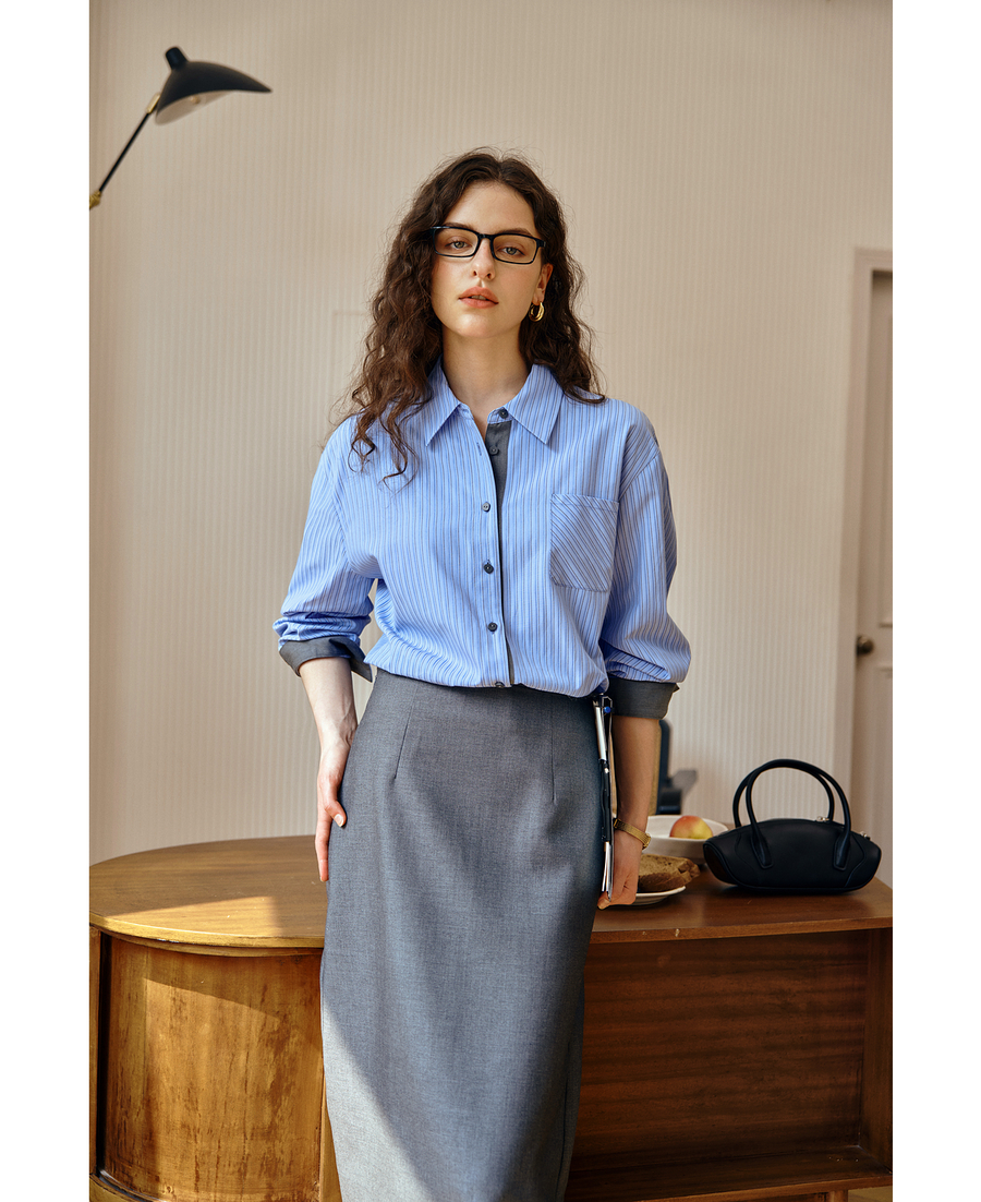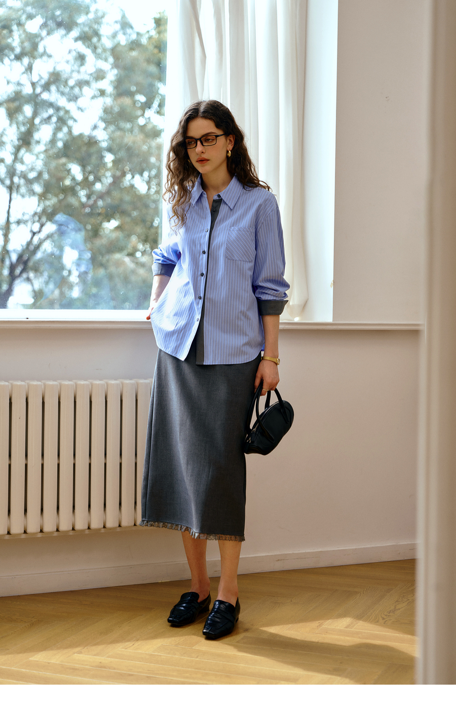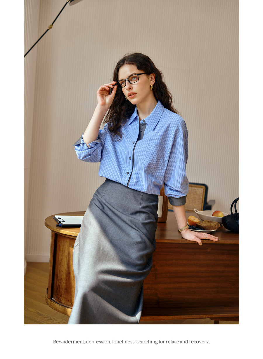 OLrain欧芮儿2025新款女秋季通勤蓝色条纹宽松设计感衬衫长袖衬衣