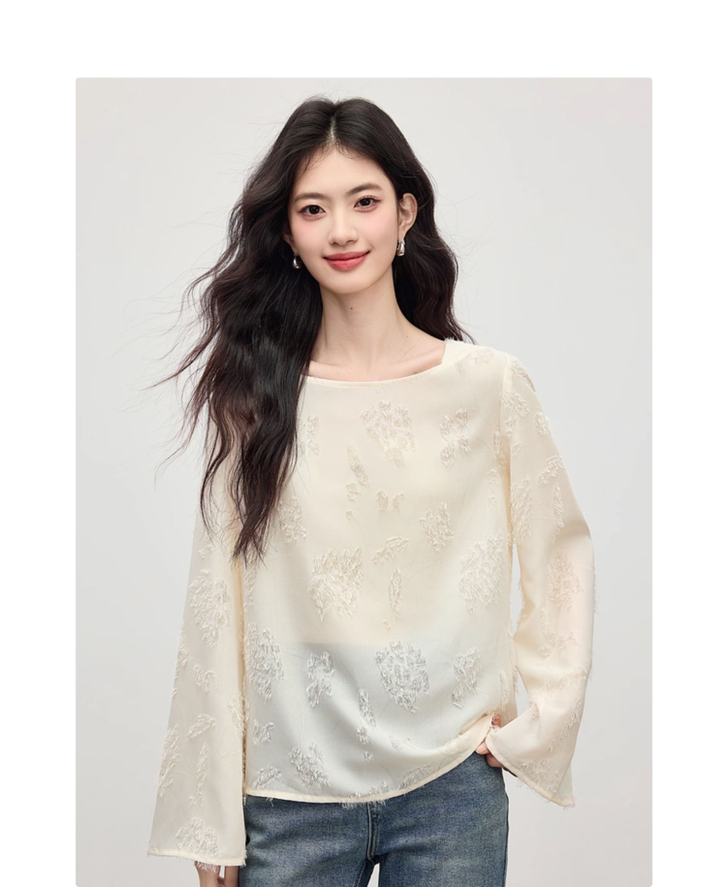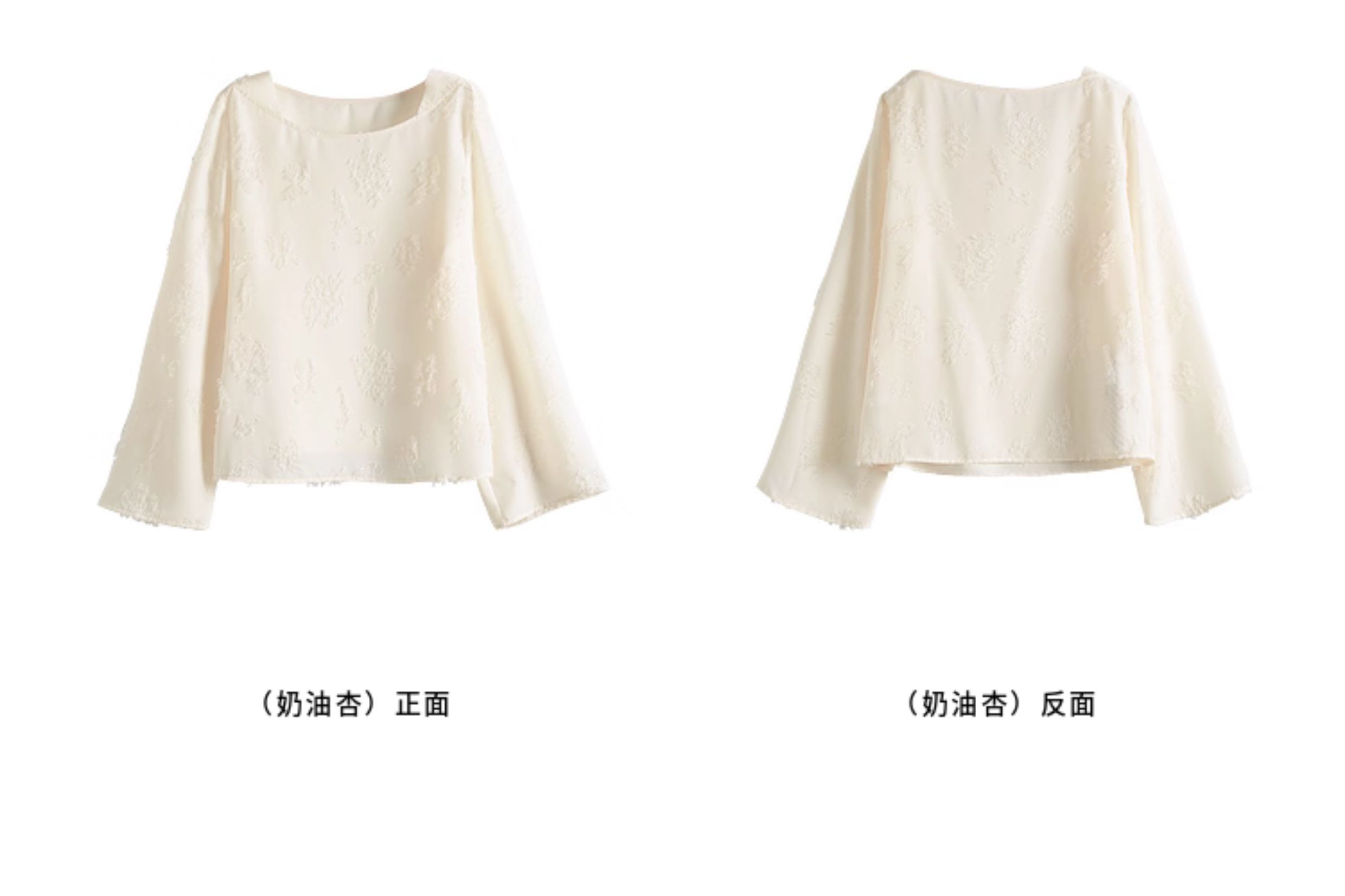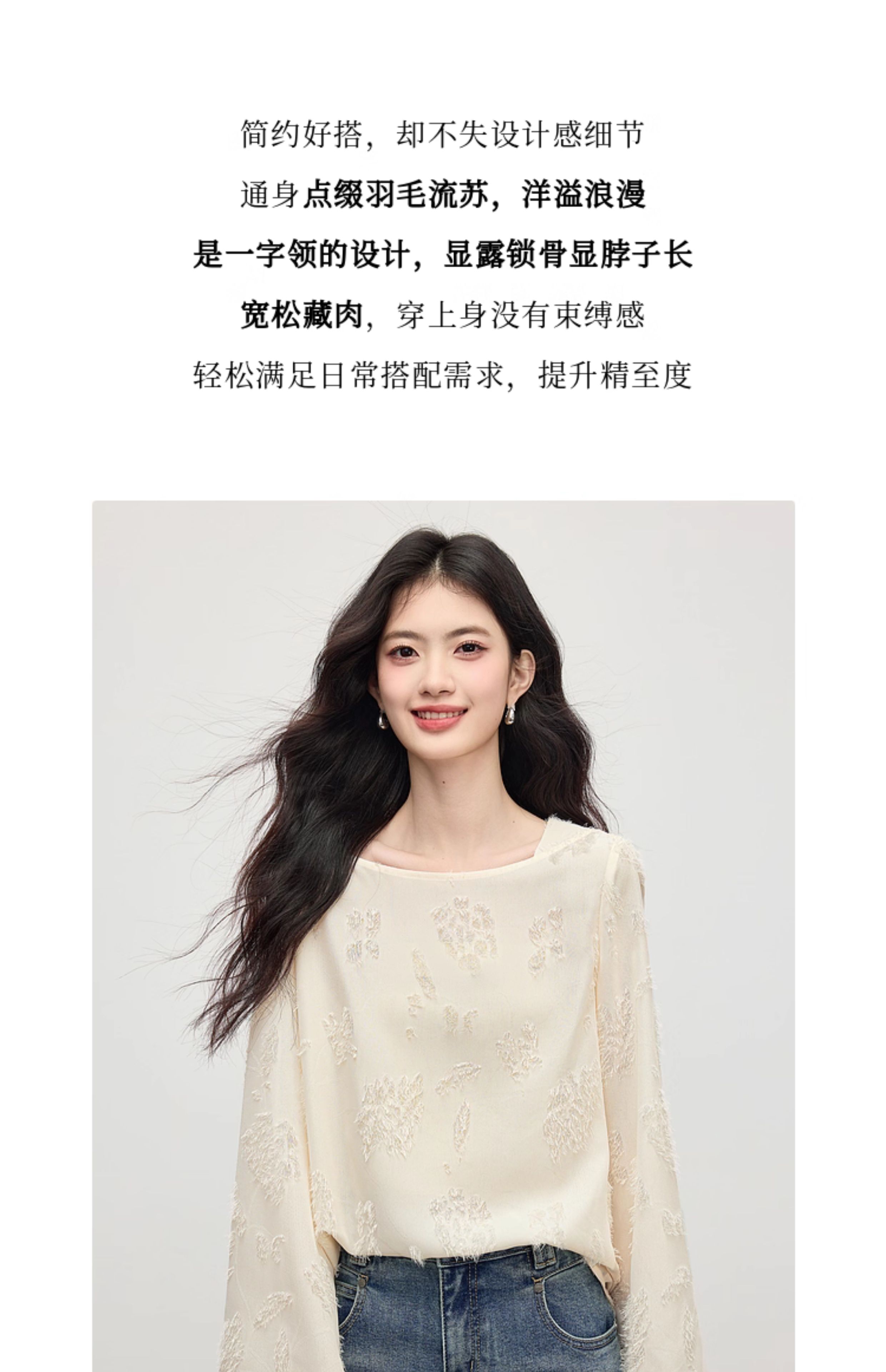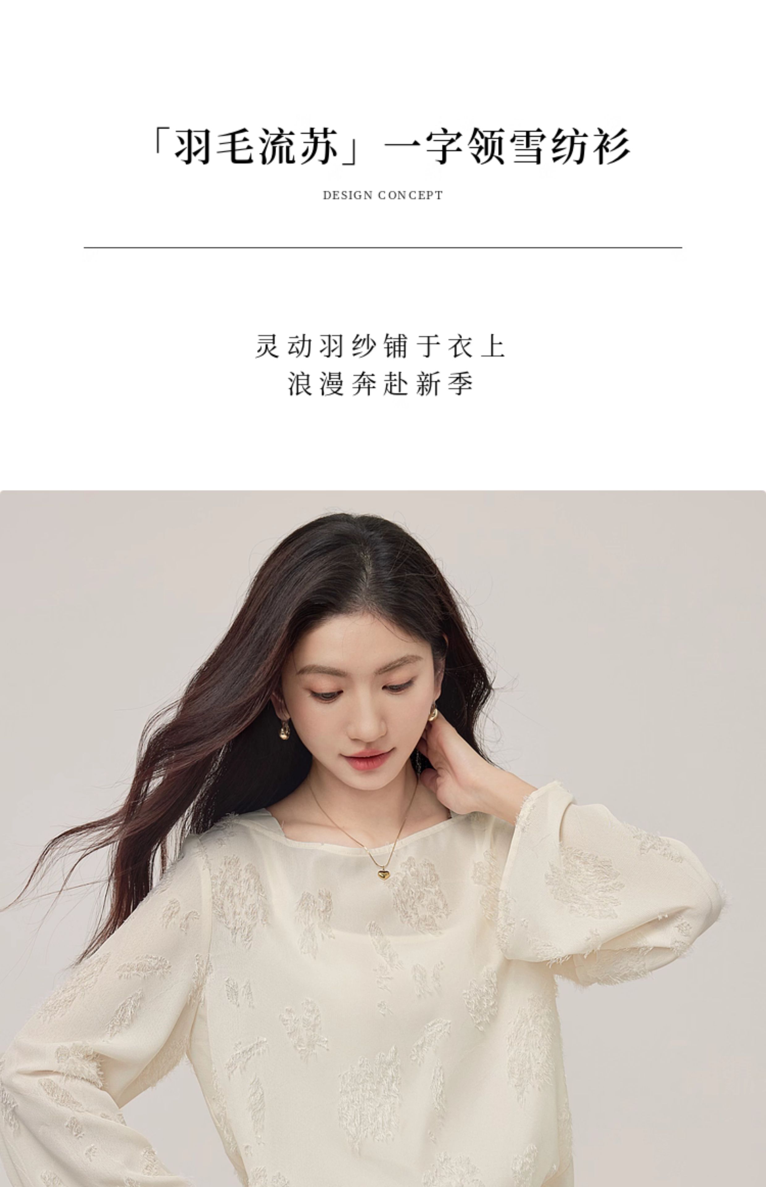 【周四狂欢价】熙世界羽毛流苏一字领雪纺衫女2025秋季新款高级感喇叭袖宽松上衣
