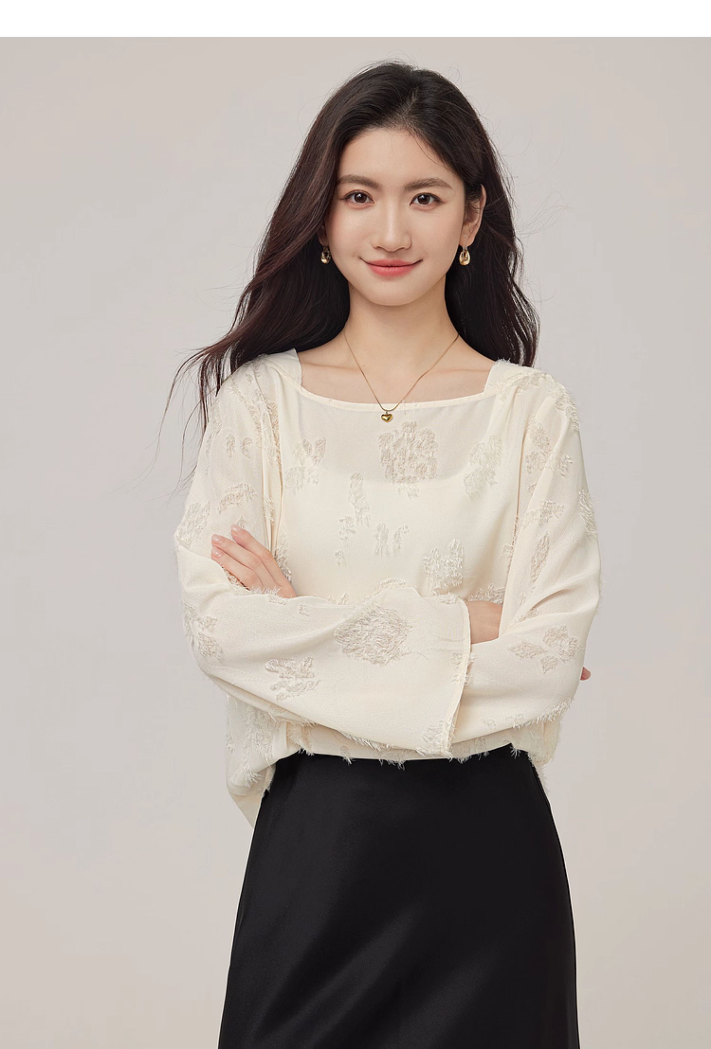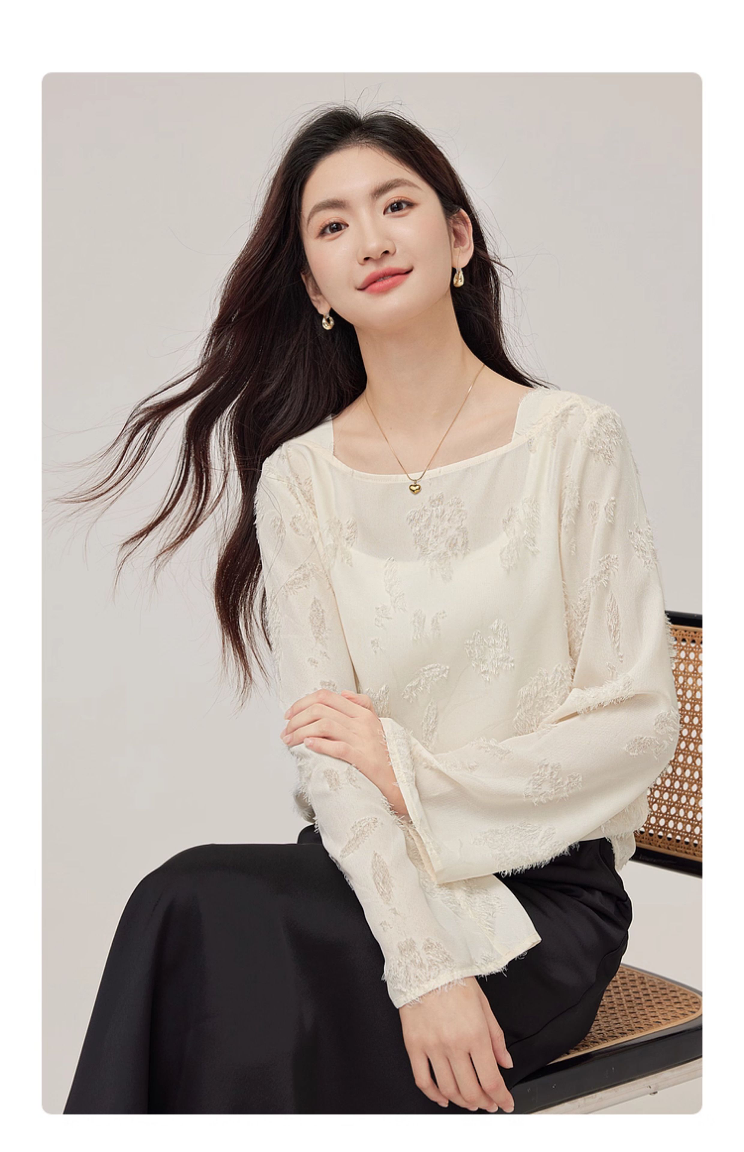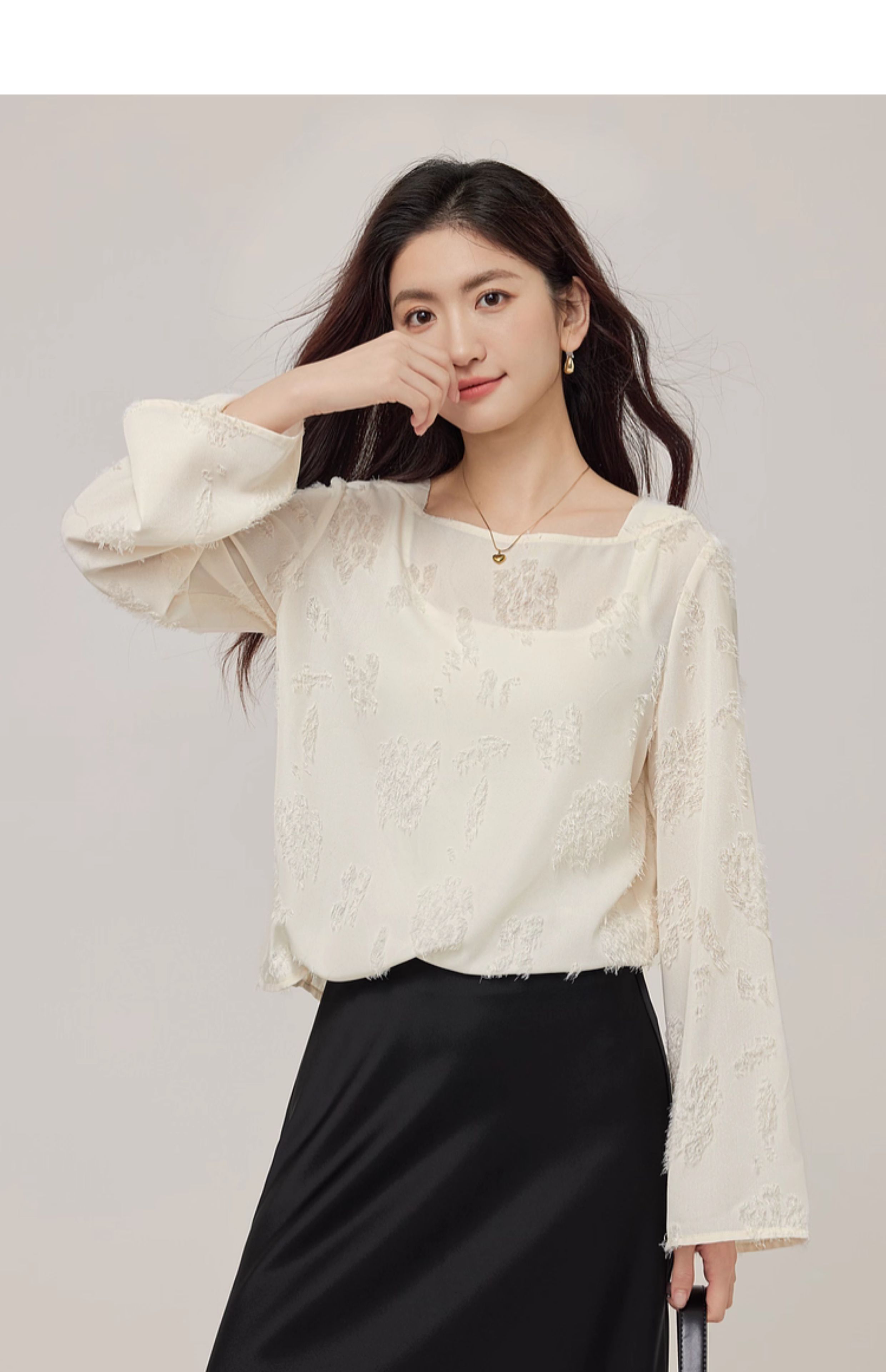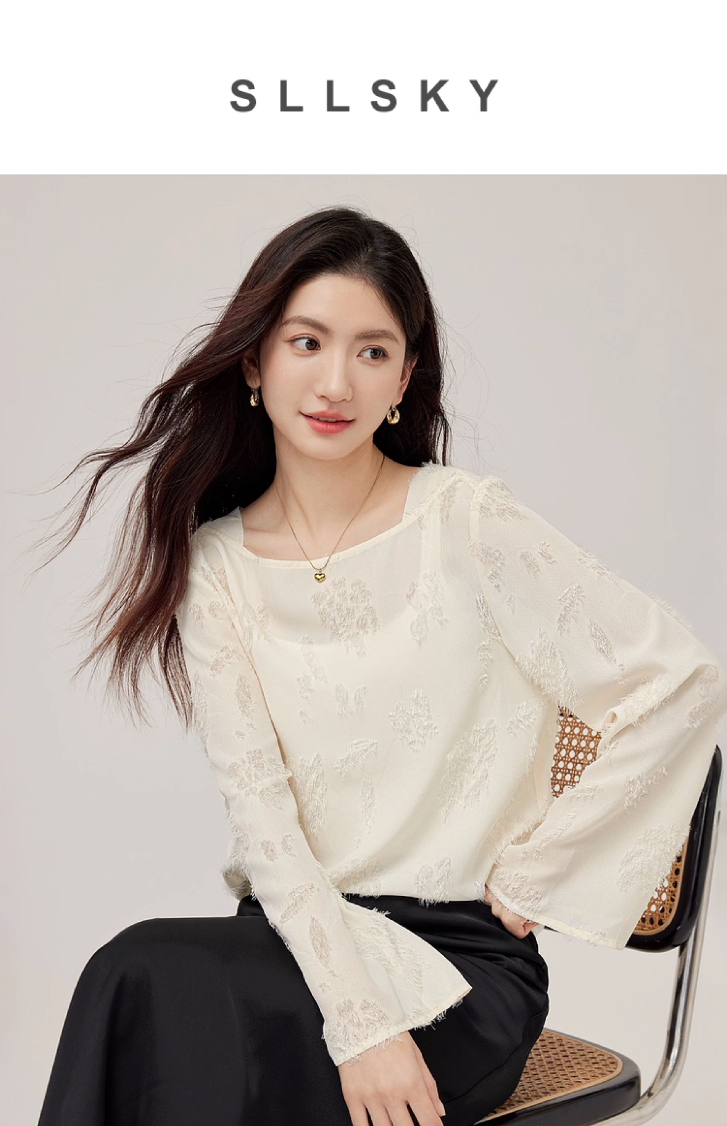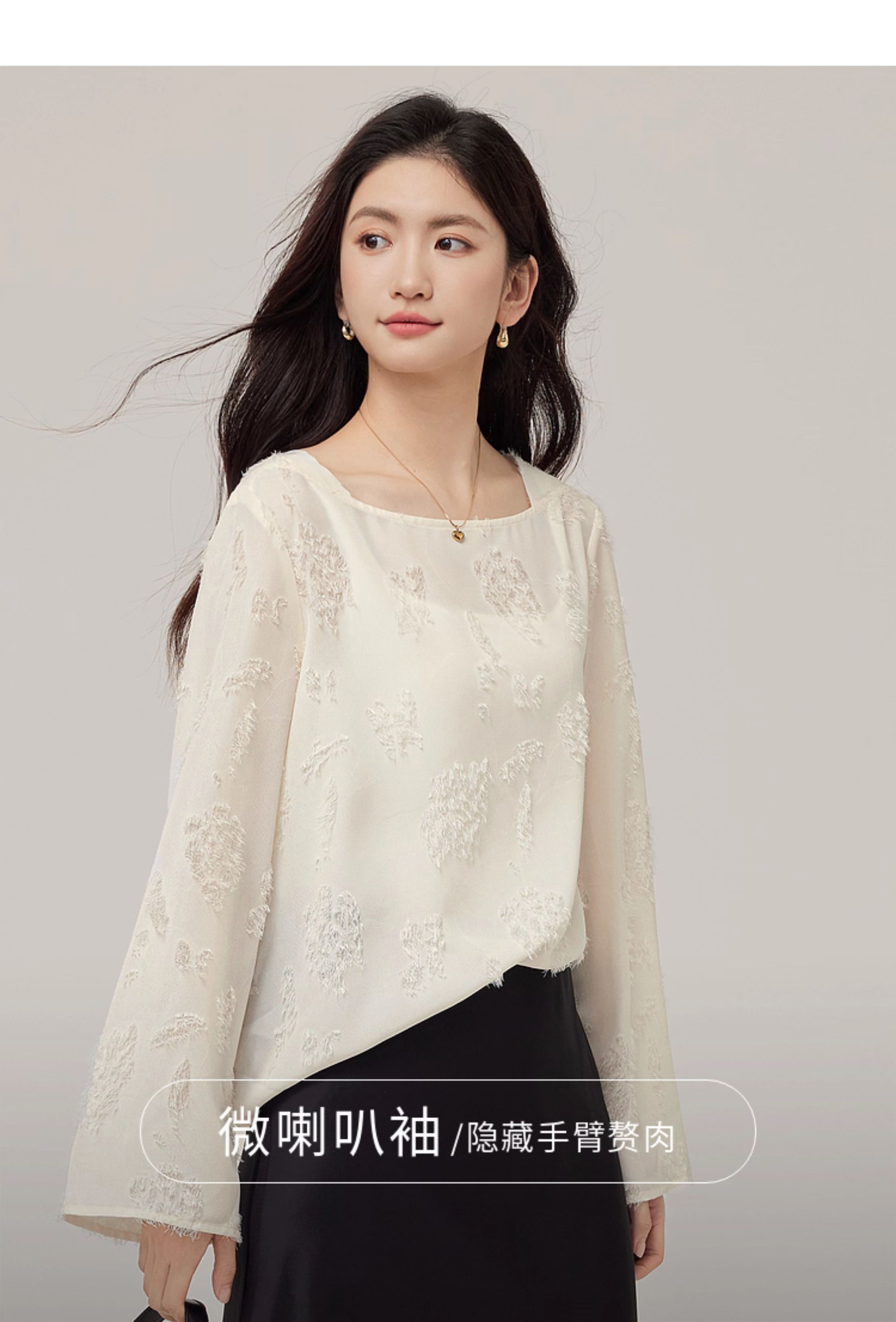 【周四狂欢价】熙世界羽毛流苏一字领雪纺衫女2025秋季新款高级感喇叭袖宽松上衣