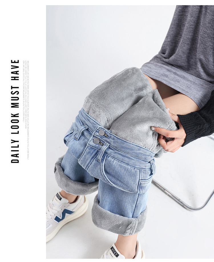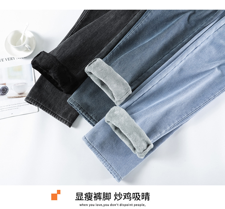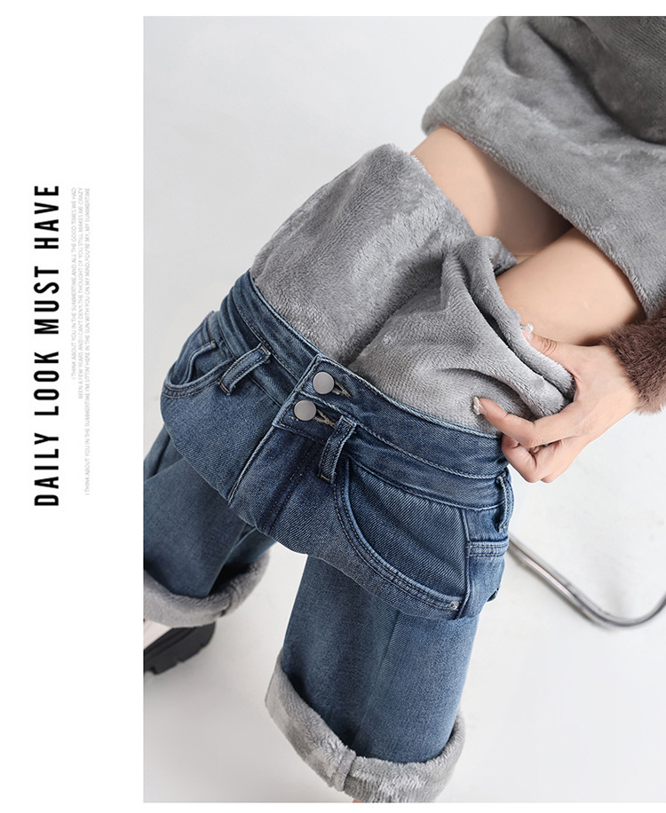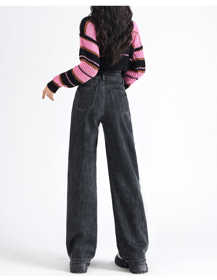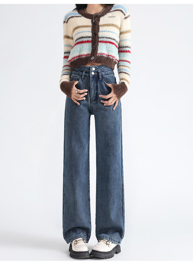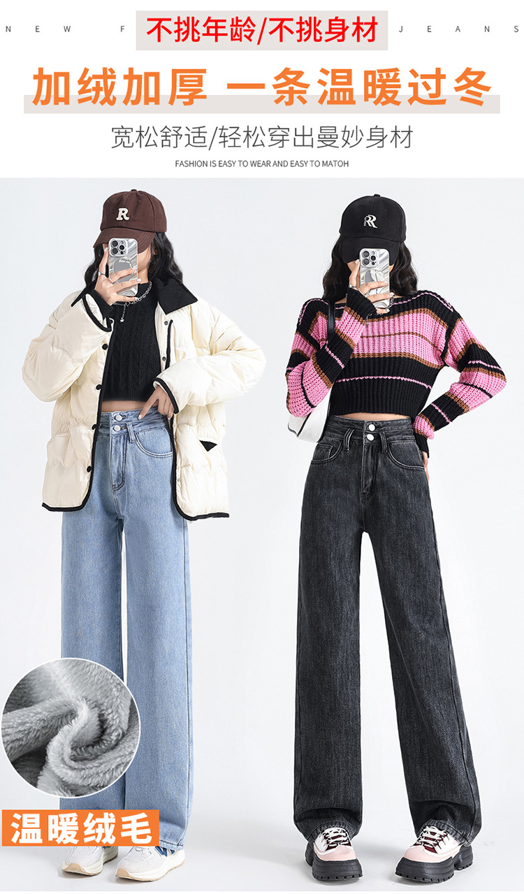 「三色可选!加不加绒两款」双排扣牛仔阔腿裤 加绒牛仔裤女秋冬新款韩版高腰厚款宽松小个子直筒裤下装
