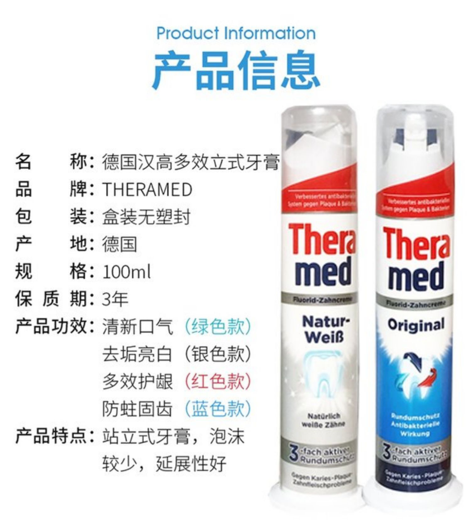 德国原装进口Theramed汉高站立式牙膏按压式100ml