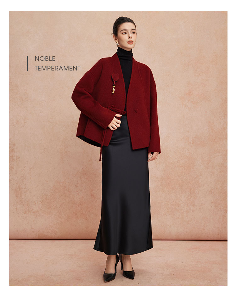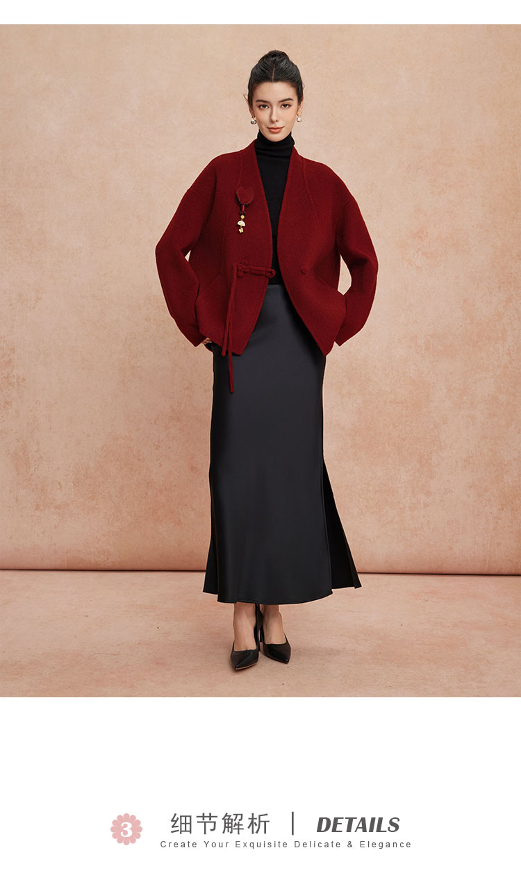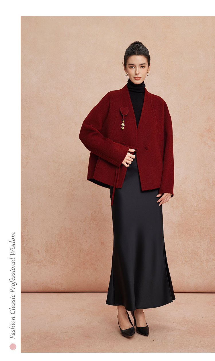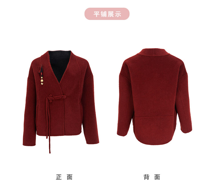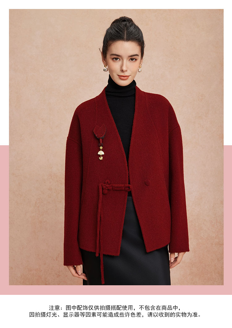 QH900斯尔丽25新款新国风双面双色手工盘花宽松气质高雅短羊毛大衣