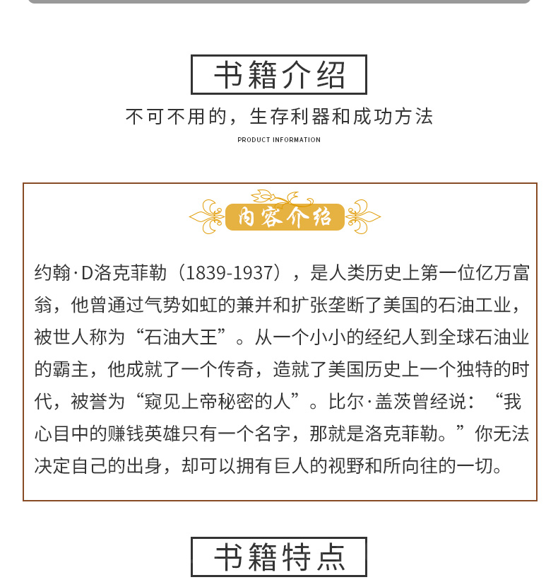 | 本书进一步剖析了信件的内容,将每一封信都作为一个章节来阐述,对其进行了详细的解读,文中以具体的洛克菲勒的案例来阐释其观点,有了事例的解说和例证,能够让读者更加准确地理解洛克菲勒的信的内容,理解洛克菲勒所要传达给年轻人的真正含义。 |