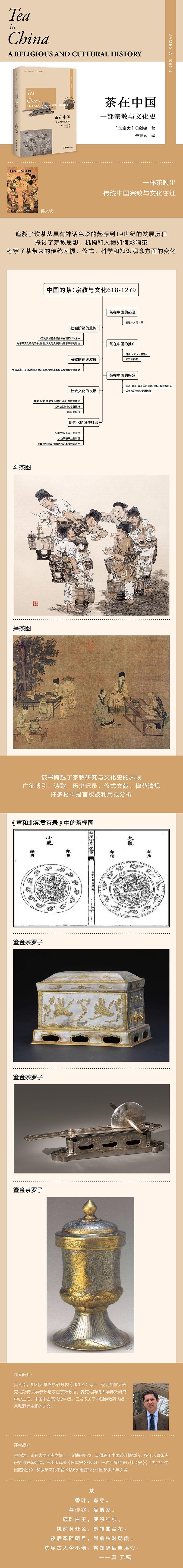 《茶在中国:一部宗教与文化史》以一件日常商品和大众饮品为切入点,探索了封建中国早期到其后大约1800年的时段里,传统中国宗教与文化变迁的概况。它追溯了饮茶从具有神话色彩的起源到19世纪的发展历程,探讨了宗教思想、机构和人物是如何影响茶的故事,也考察了茶带来的传统习惯、审美、仪式、科学和知识观念方面的变化。