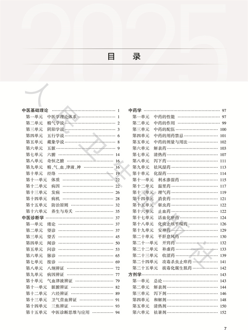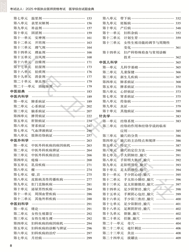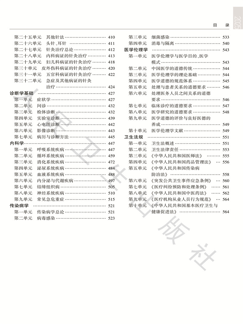 中医基础理论/1 中医诊断学/37 中药学/97 方剂学/143 中医经典/183 中医内科学/189 中医外科学/263 中医妇科学/291 中医儿科学/365 针灸学/383 诊断学基础/427 内科学/447 传染病学/521 医学伦理学/543 卫生法规/551