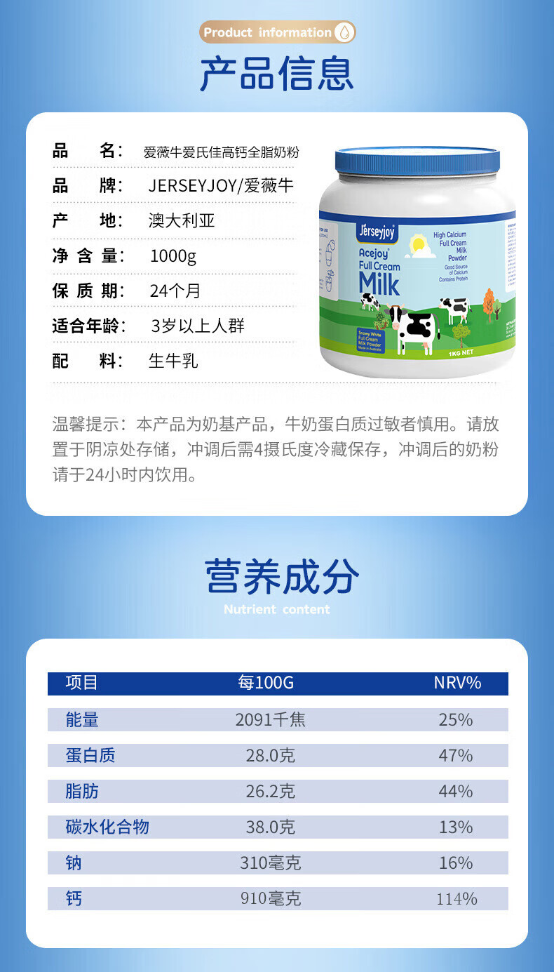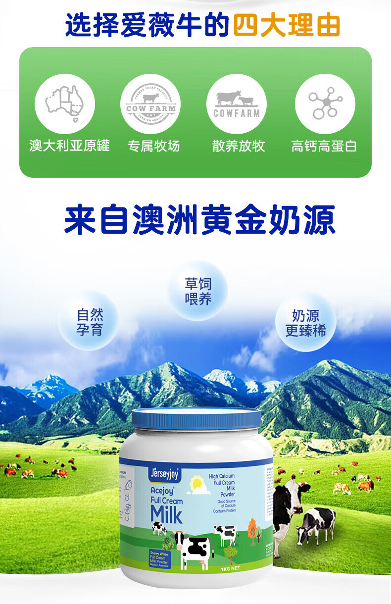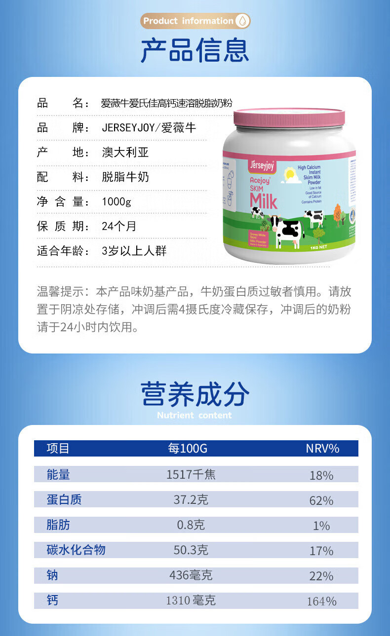 爱薇牛爱氏佳高钙速溶脱脂奶粉1000g/桶
