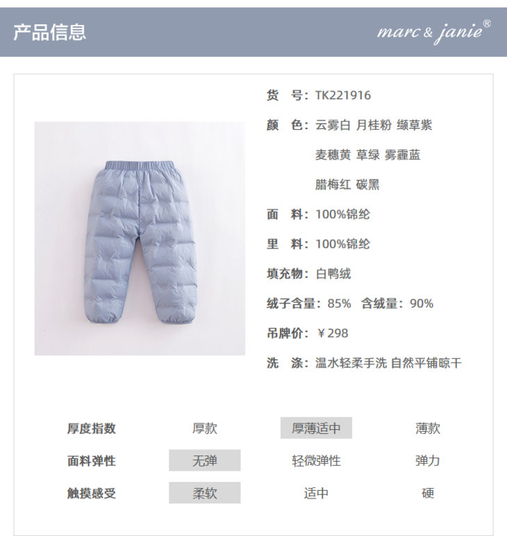 马克珍妮秋冬男女童超轻保暖羽绒裤221916