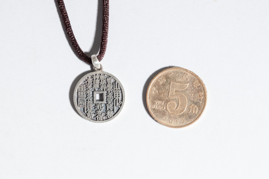 930矿银制作,直径约17.5毫米(不含挂扣),厚约1.6毫米,方孔径约2毫米,穿绳孔径约2毫米,重约3克(手工作品有少许误差,请知晓)。