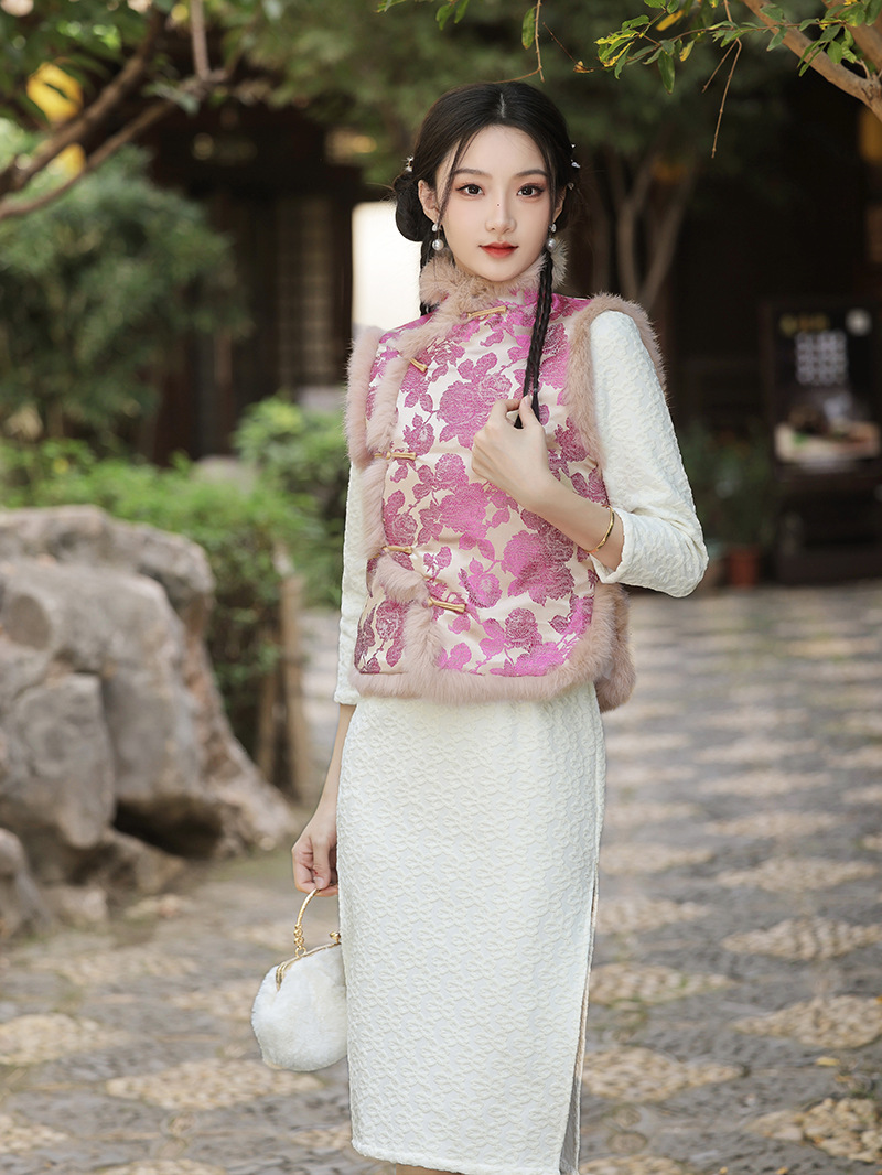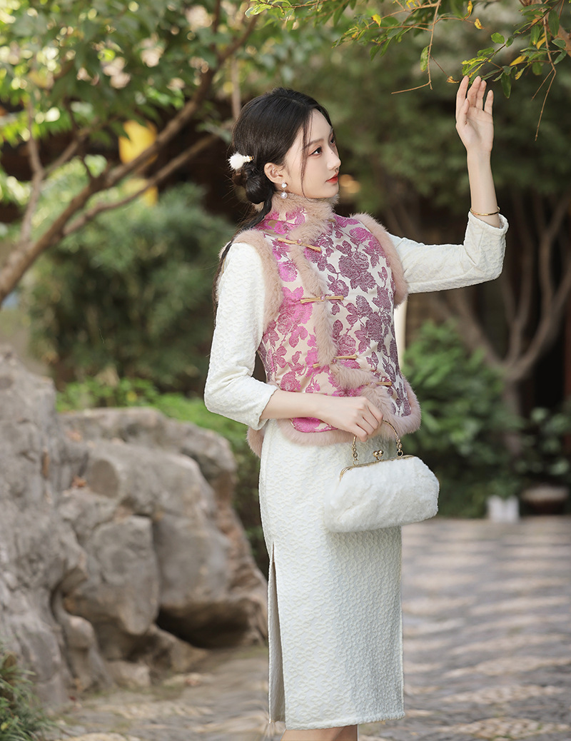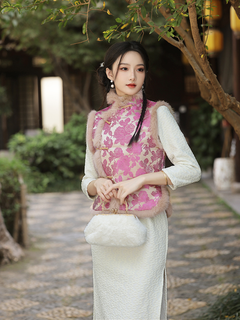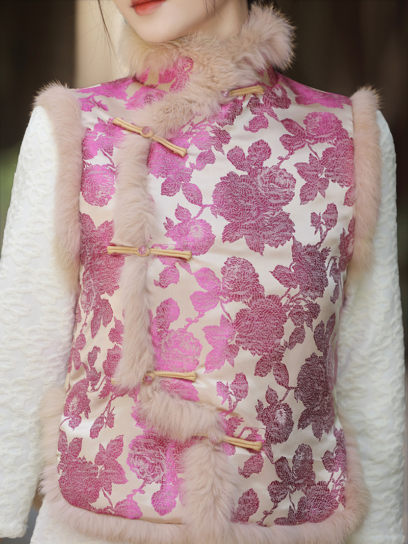 冬季新款旗袍,复古中老年马甲修身水貂毛亮色新中式提花马甲XL-23388