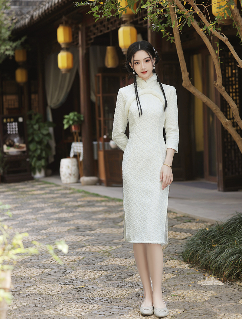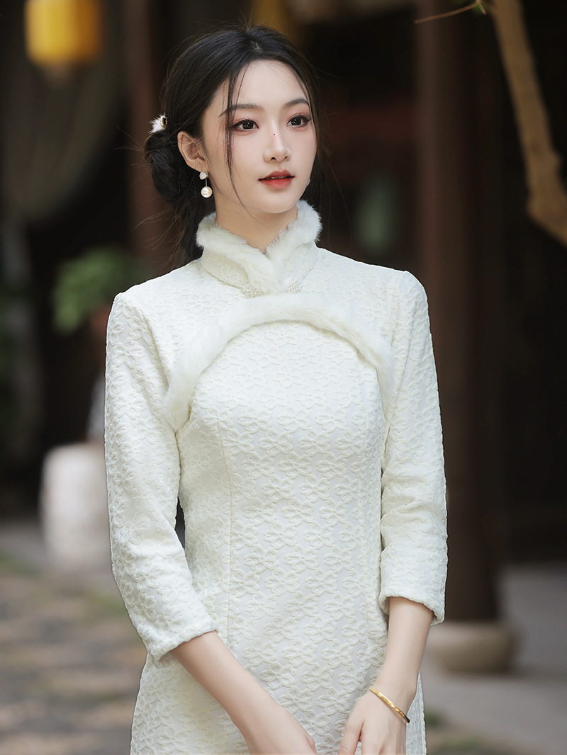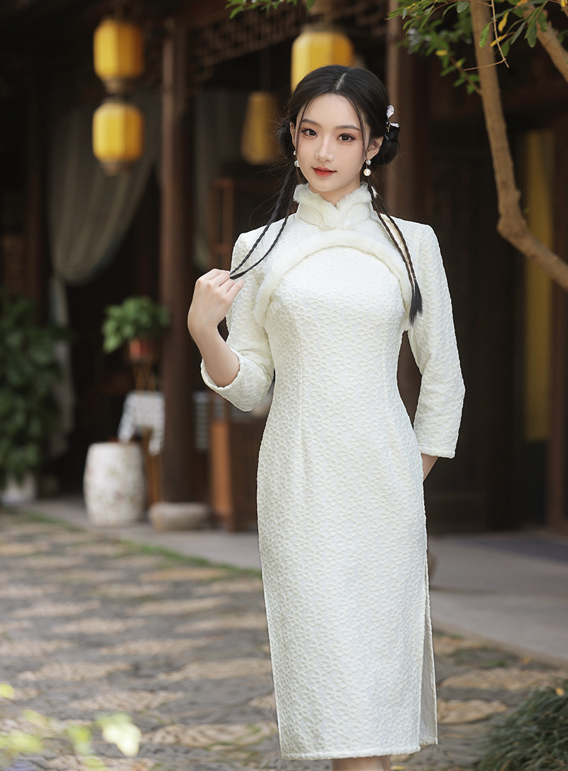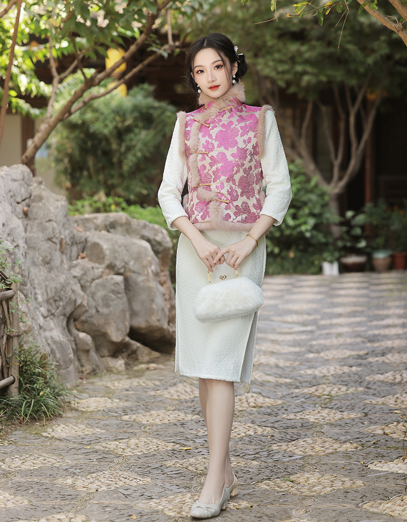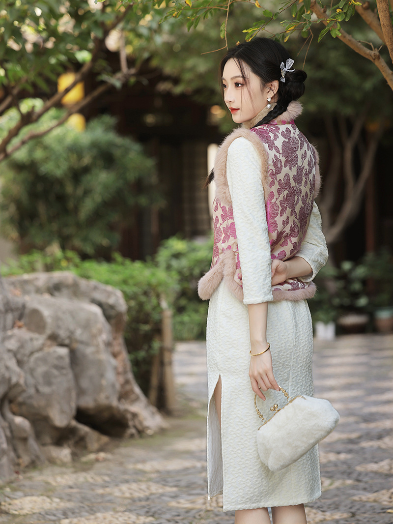 冬季新款旗袍,复古中老年马甲修身水貂毛亮色新中式提花马甲XL-23388