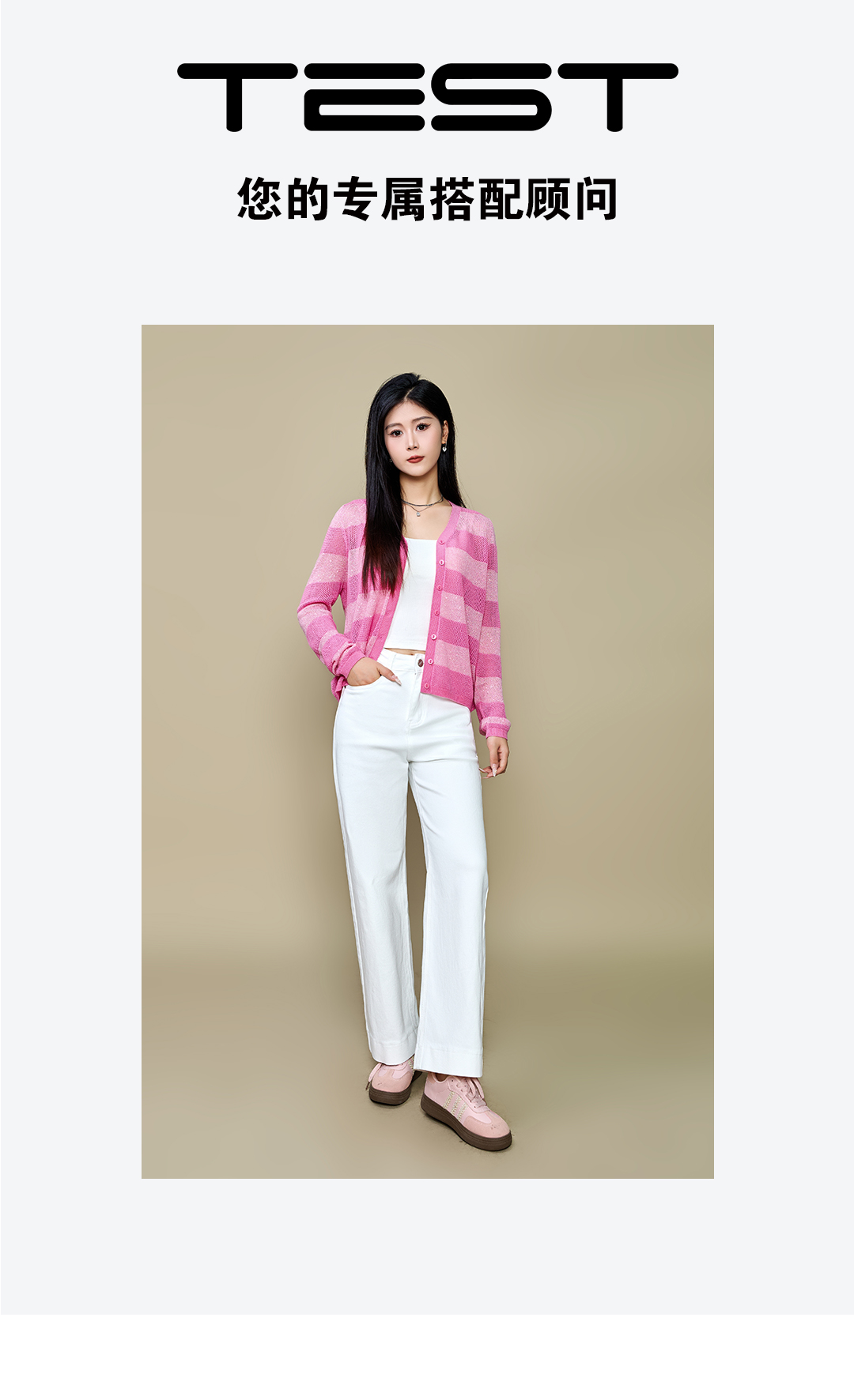 秋上新粉白条纹长袖V领单排扣针织开衫253097 商品图3