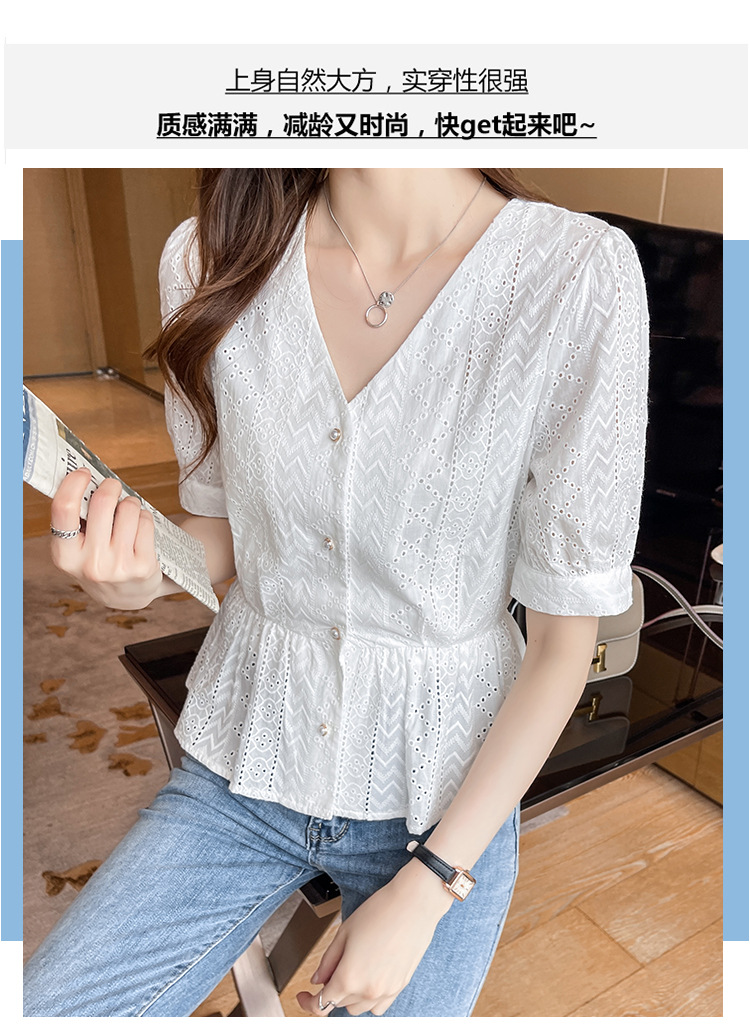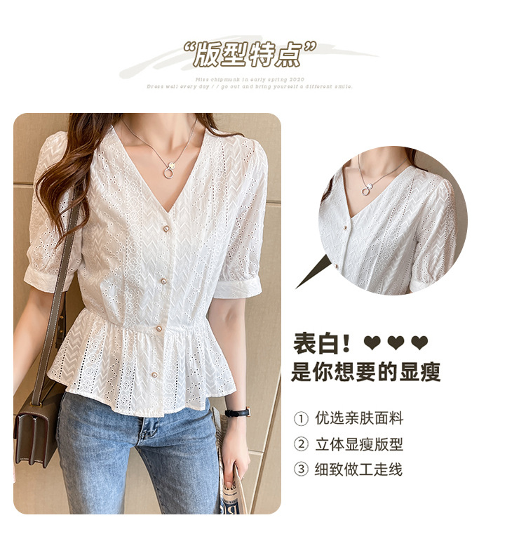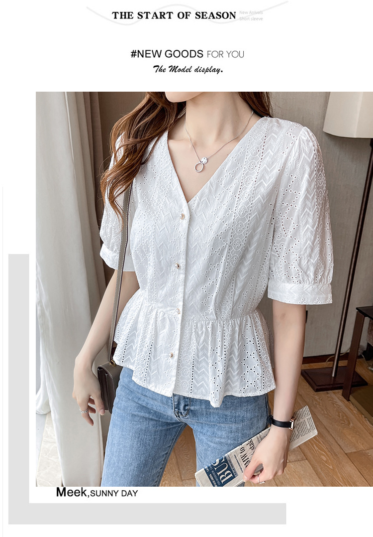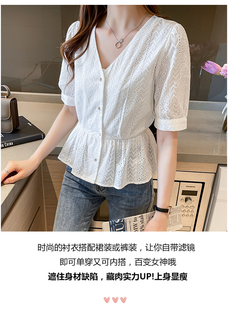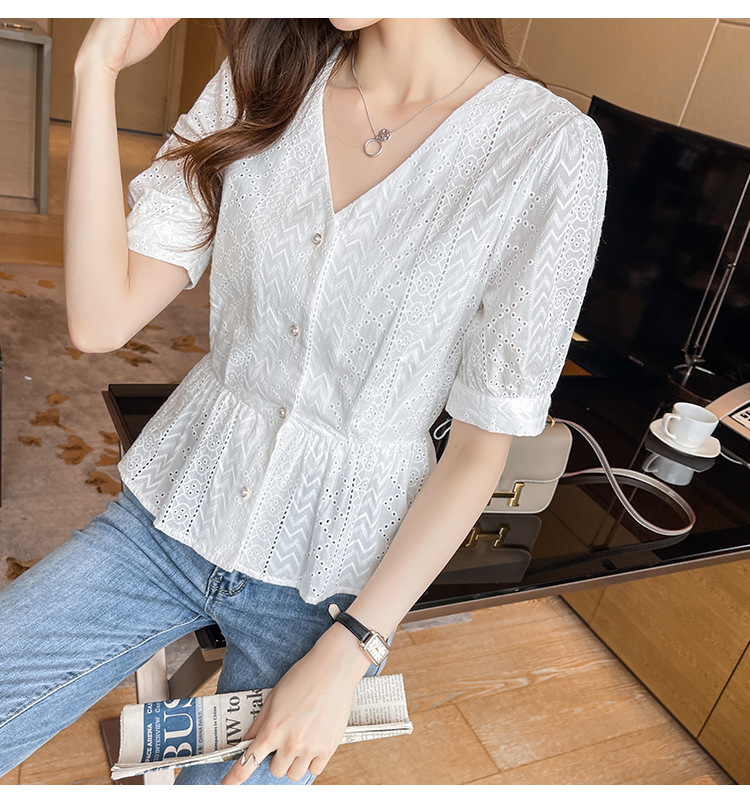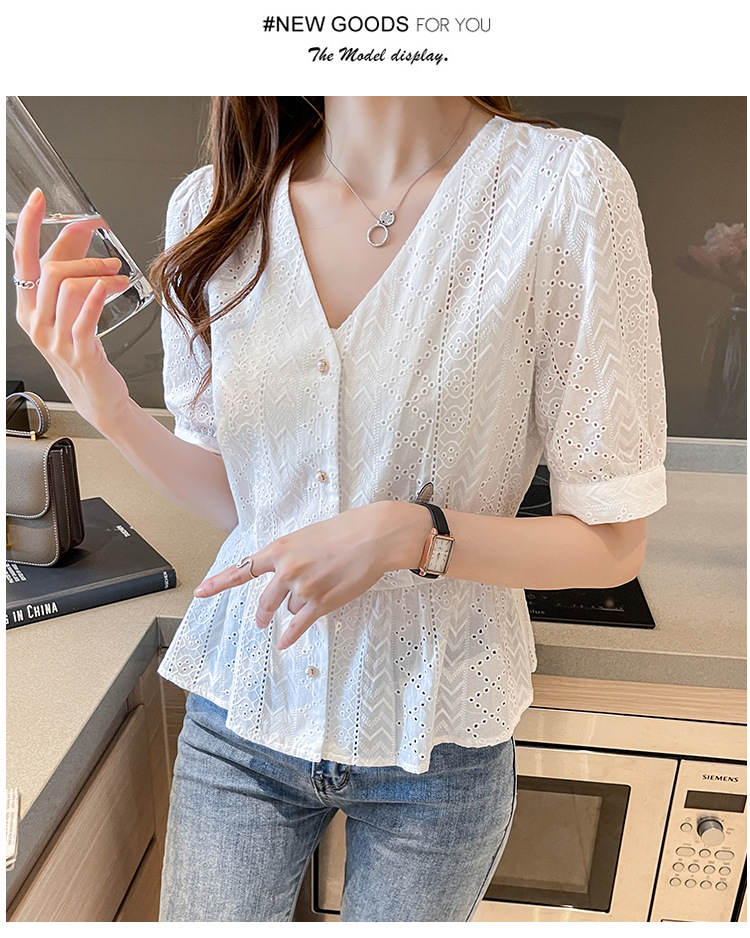 新款短袖,韩版刺绣清新小衫v领棉布衬衫KQL-6812