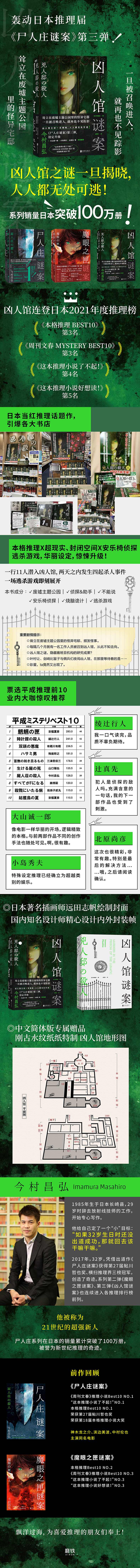 "1.轰动日本推理届,被誉为新世纪推理的奇迹, 《尸人庄谜案》第三弹,系列销量日本突破100万册! 当红推理话题作,引爆各大书店 入围2021年日本各大推理榜: 《本格推理 BEST10》第3名 《周刊文春 MYSTERY BEST10》第3名 《这本推理小说了不起!》第4名 《这本推理小说好想读!》第5名 2.本格推理X超现实、封闭空间X安乐椅侦探 逃杀游戏,华丽设定,惊悚升级 融合悬疑、惊悚、科幻,集合让推理迷血脉贲张的元素! 一行11人潜入凶人馆,两天之内发生四起杀人事件 一场逃杀游戏即刻展开 本书成分:☑废墟主题公园|☑侦探&助手|☑不能说 ☑安乐椅侦探|☑烧脑诡计|☑逃杀游戏 3. 绫辻行人、大山诚一郎、小岛秀夫、辻真先、太田忠司、北原尚彦等业内大咖惊叹推荐 大山诚一郎:“像电影一样华丽的开场,逻辑精致的本格” 绫辻行人:“我一口气读完,今村品质不辜负期待。非常开心,很有趣。” 4.日本著名插画师远田志帆绘制封面 中文简体版专属赠品: 特制凶人馆地形图 国内知名设计师精心设计内外封装帧"