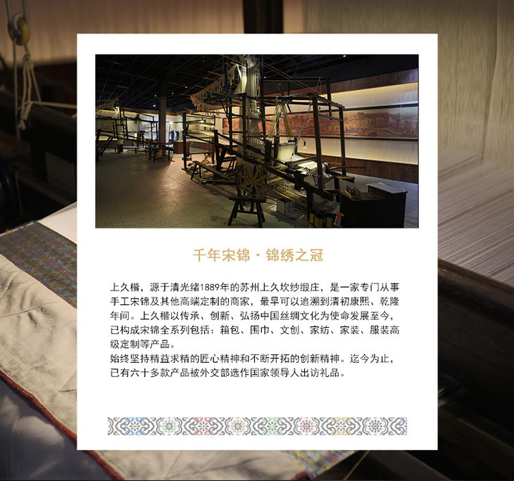 - 上久楷前身为苏州上九坎绸缎庄,源于1889年,是清光绪年间的皇室御用宋锦织造商。现从事“世界非物质文化遗产—宋锦”的抢救性开发,并研制出世界首台按照宋锦传统工艺织造的电子提花机,使宋锦走向了产业化道路